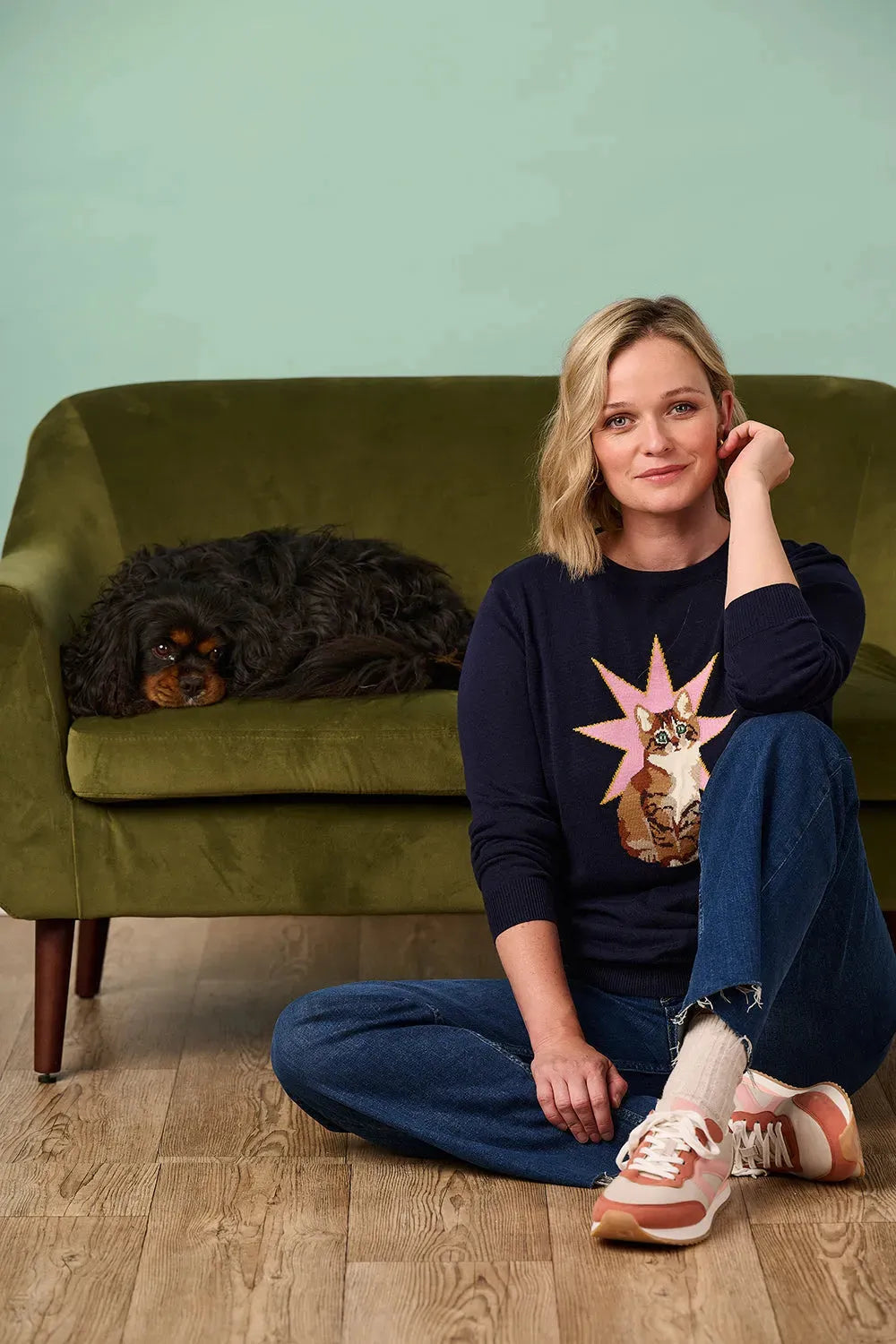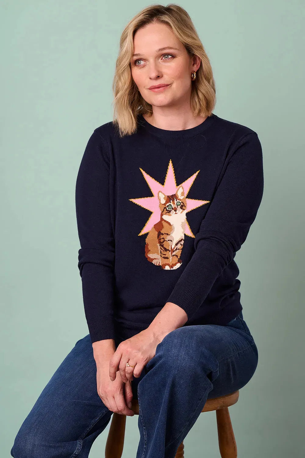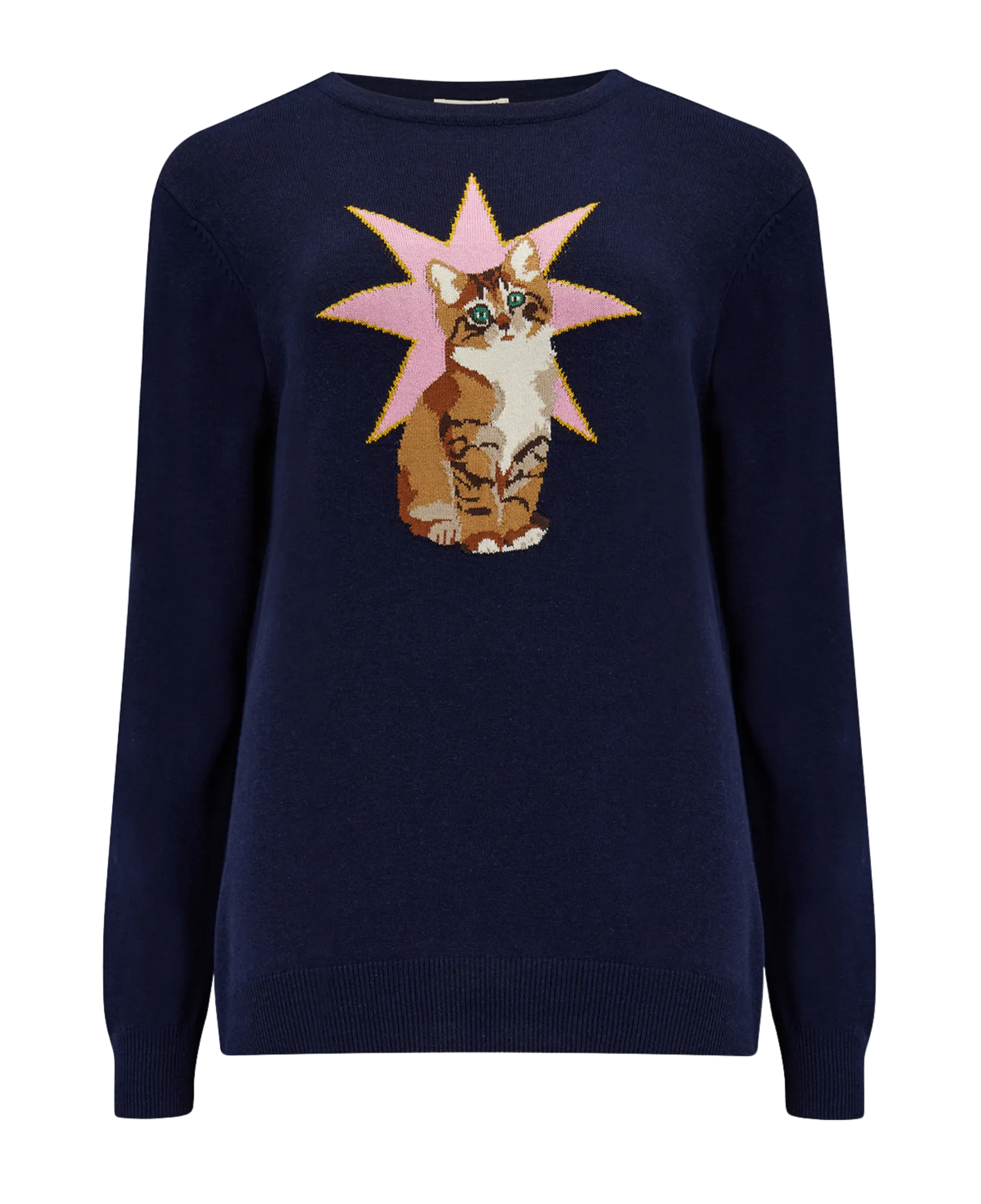 El modelo más vendido de Sugarhill, el jersey Rita, tiene una composición ligera de mezcla de algodón, cuello redondo y termina a media cadera. Nuestra gama de diseños ofrece una forma sencilla de añadir diversión y color a tu armario. Este diseño presenta un lindo gatito con una estrella rosa ribeteada en amarillo, sobre una base azul marino.
