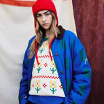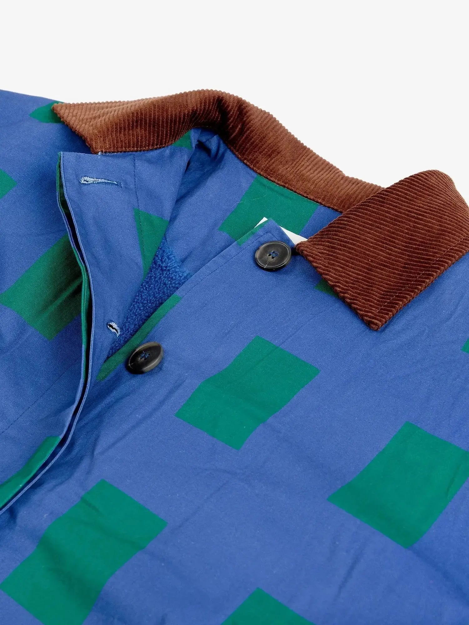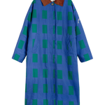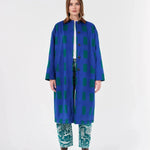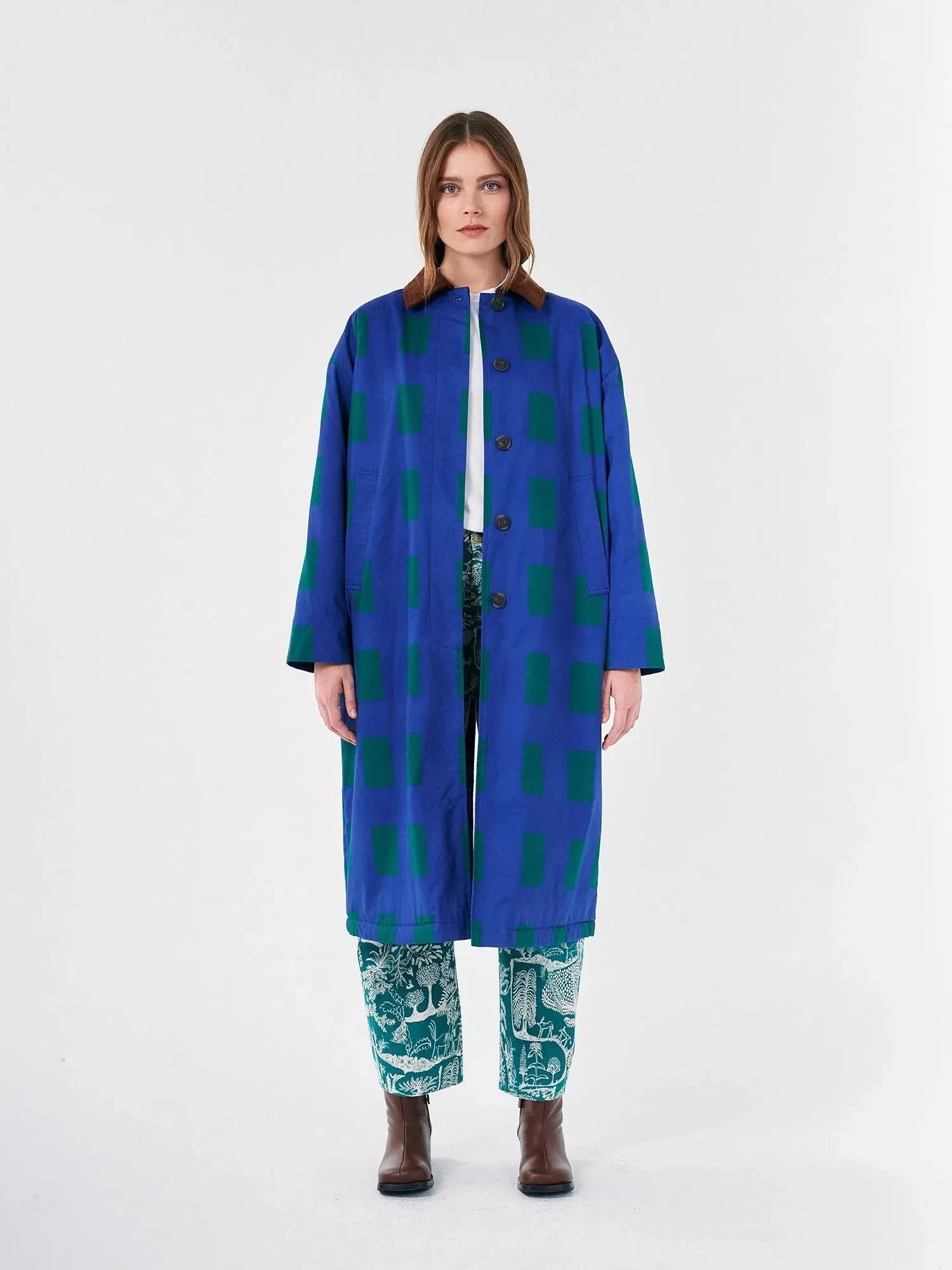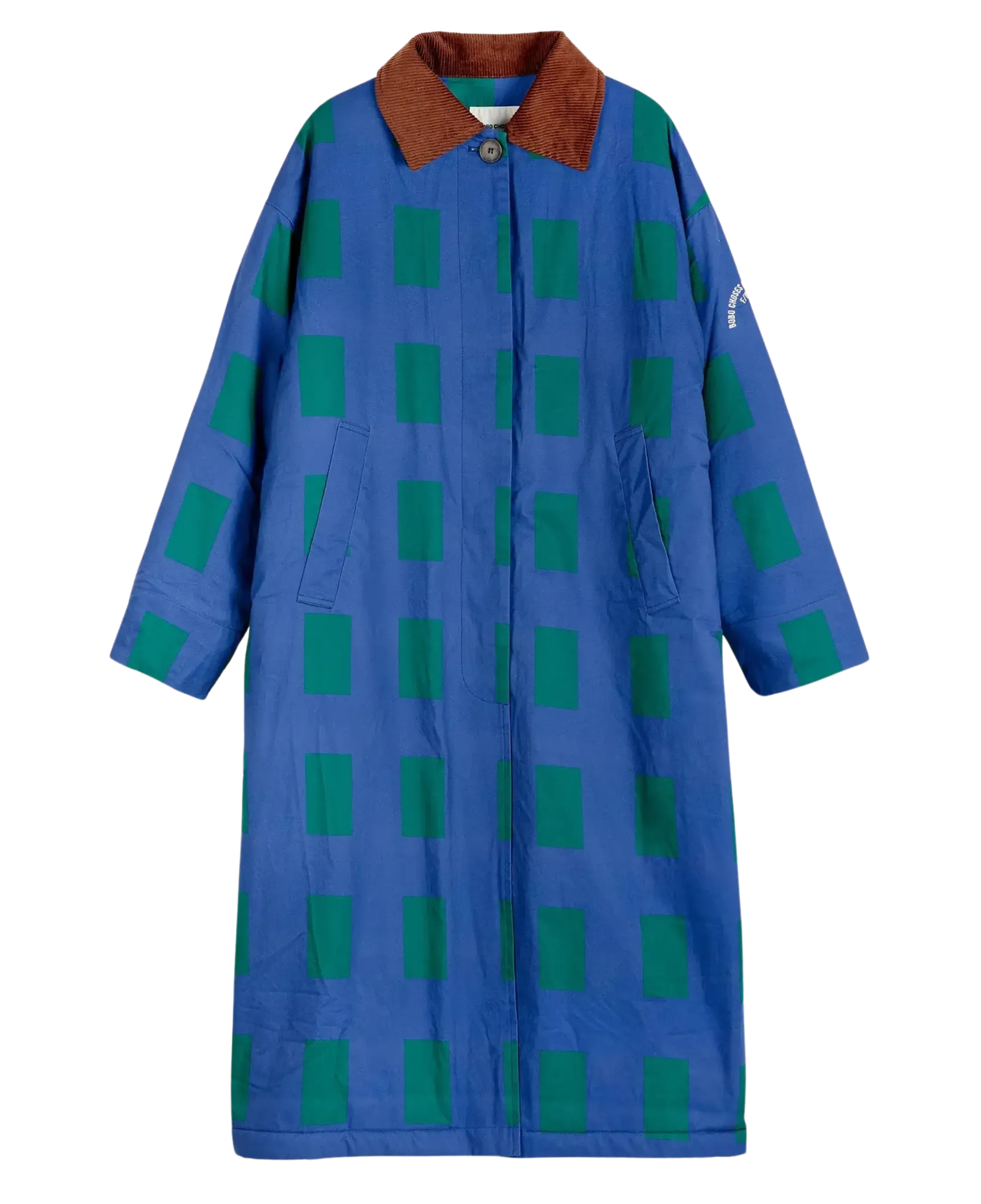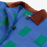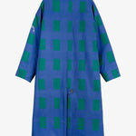 El abrigo largo "Color Game" presenta detalles rojos y formas geométricas verdes que resaltan sobre el fondo azul medianoche. Está confeccionado en algodón reciclado y diseñado con un corte holgado y tejido no elástico para brindar comodidad y libertad de movimiento.
