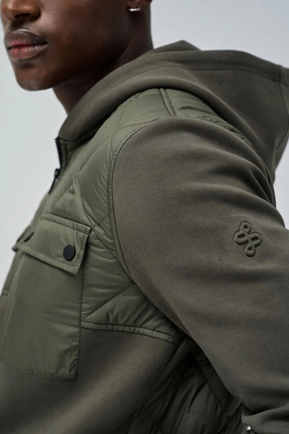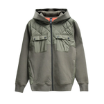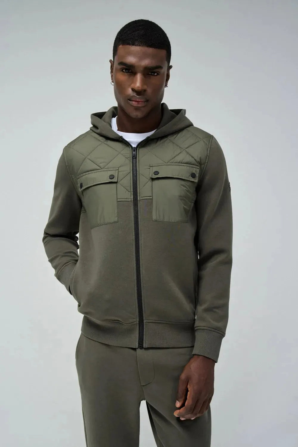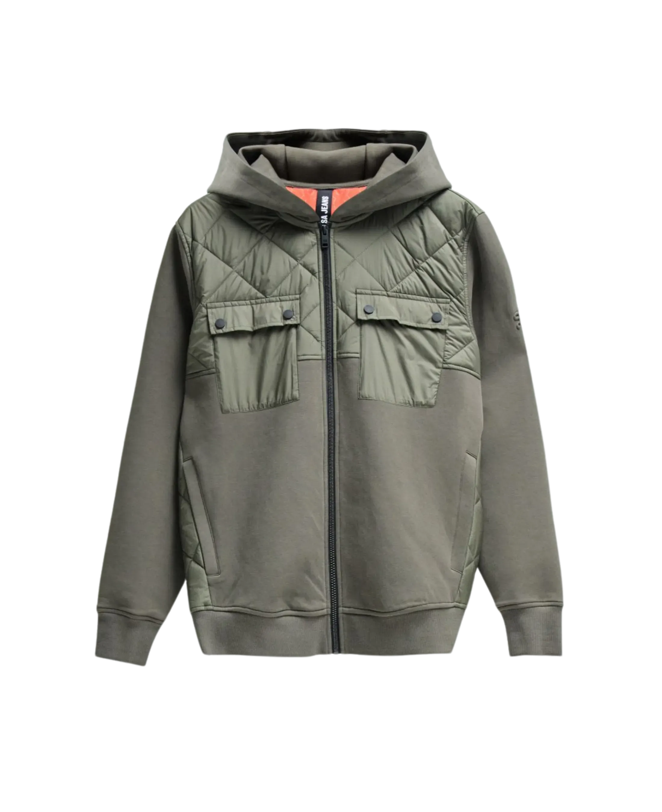 Cazadora con capucha. Mezcla de materiales. Color verde caqui. Cierre frontal con cremallera. Bolsillos de placa frontales. Mangas largas con puño elástico.