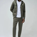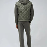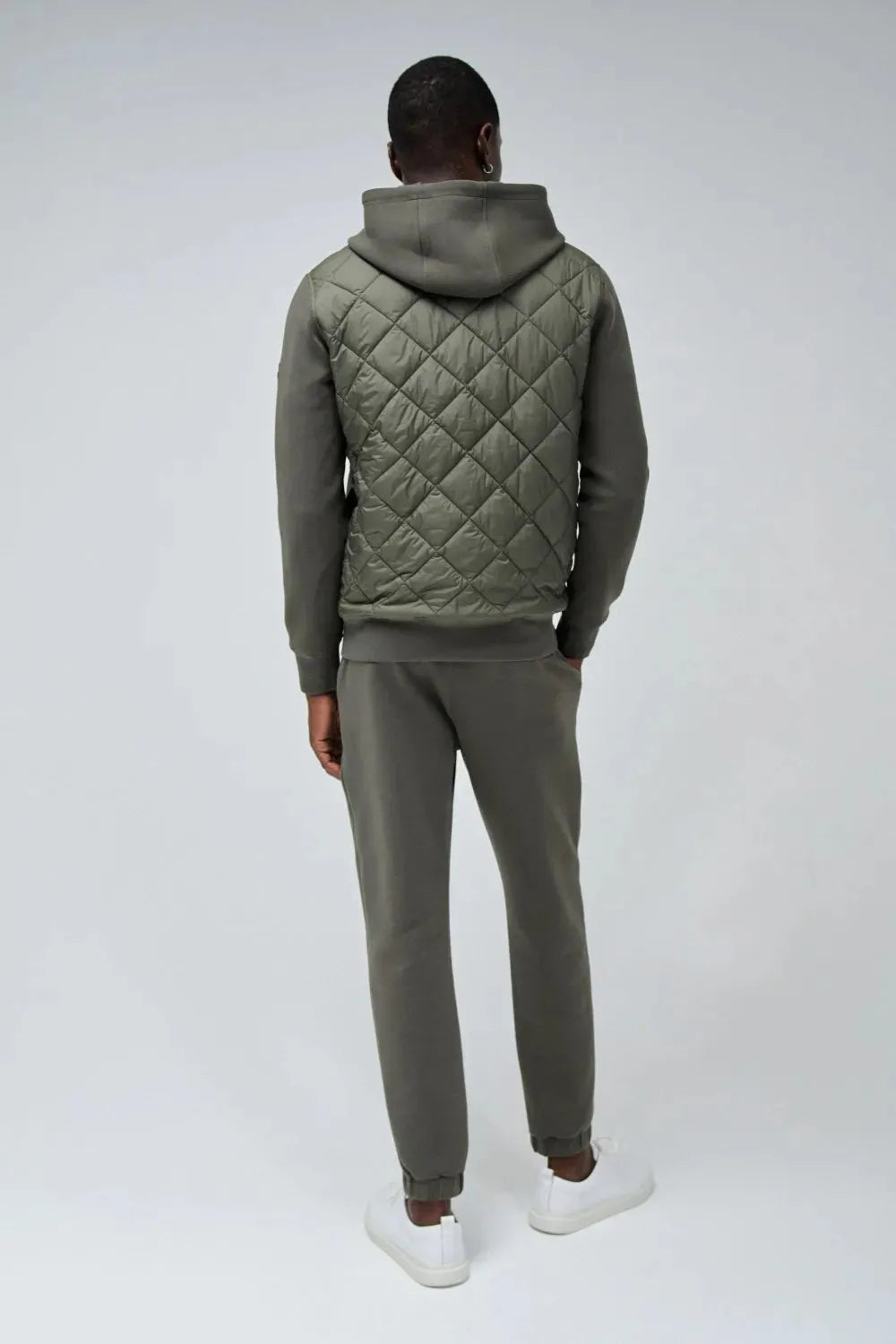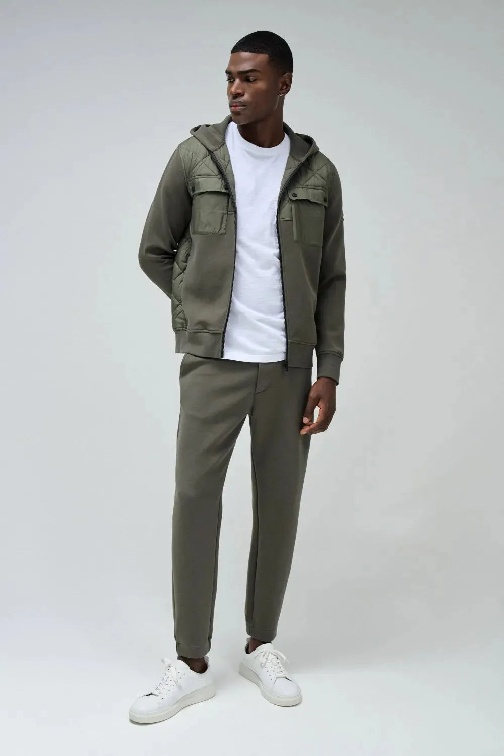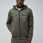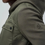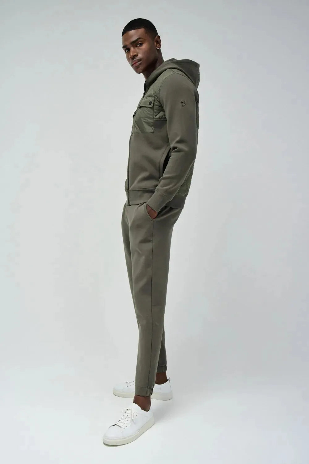 Cazadora con capucha. Mezcla de materiales. Color verde caqui. Cierre frontal con cremallera. Bolsillos de placa frontales. Mangas largas con puño elástico.