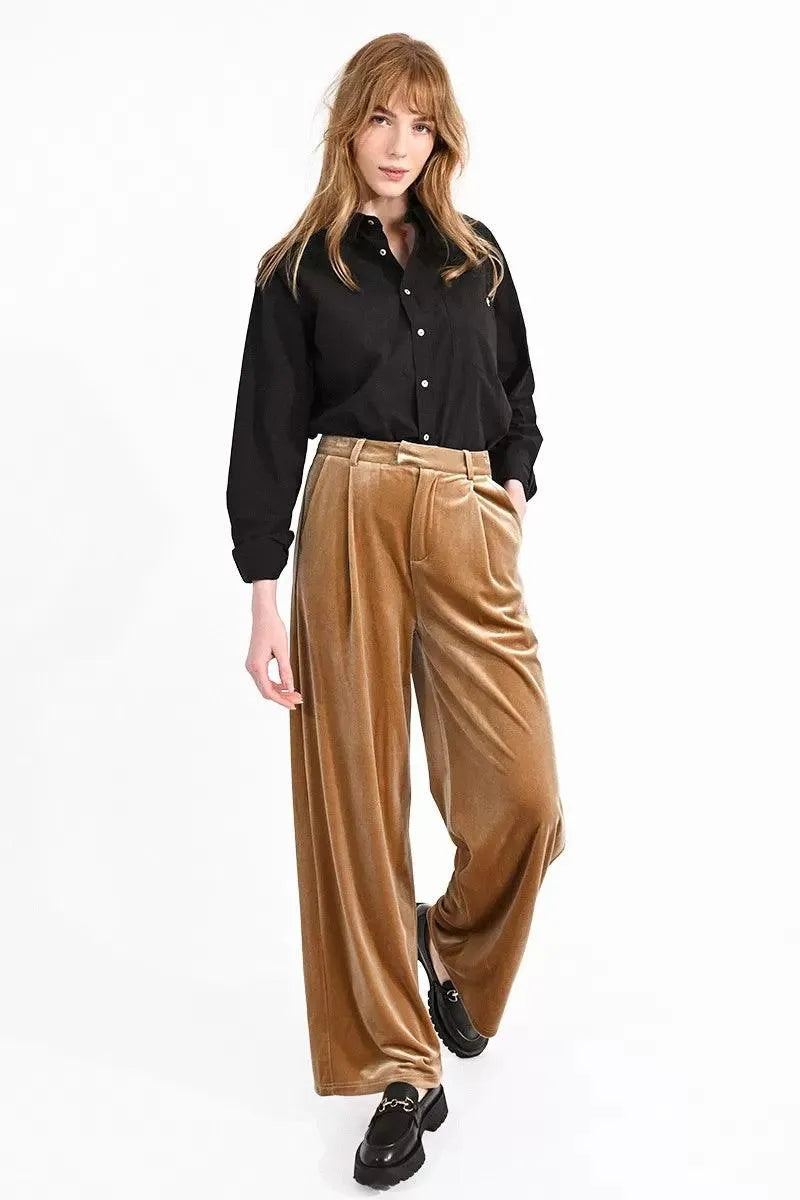 Pantalón largo, de tiro alto y perneras anchas. Modelo en tejido de terciopelo, pliegues y cierre frontal de cremallera y gancho oculto.