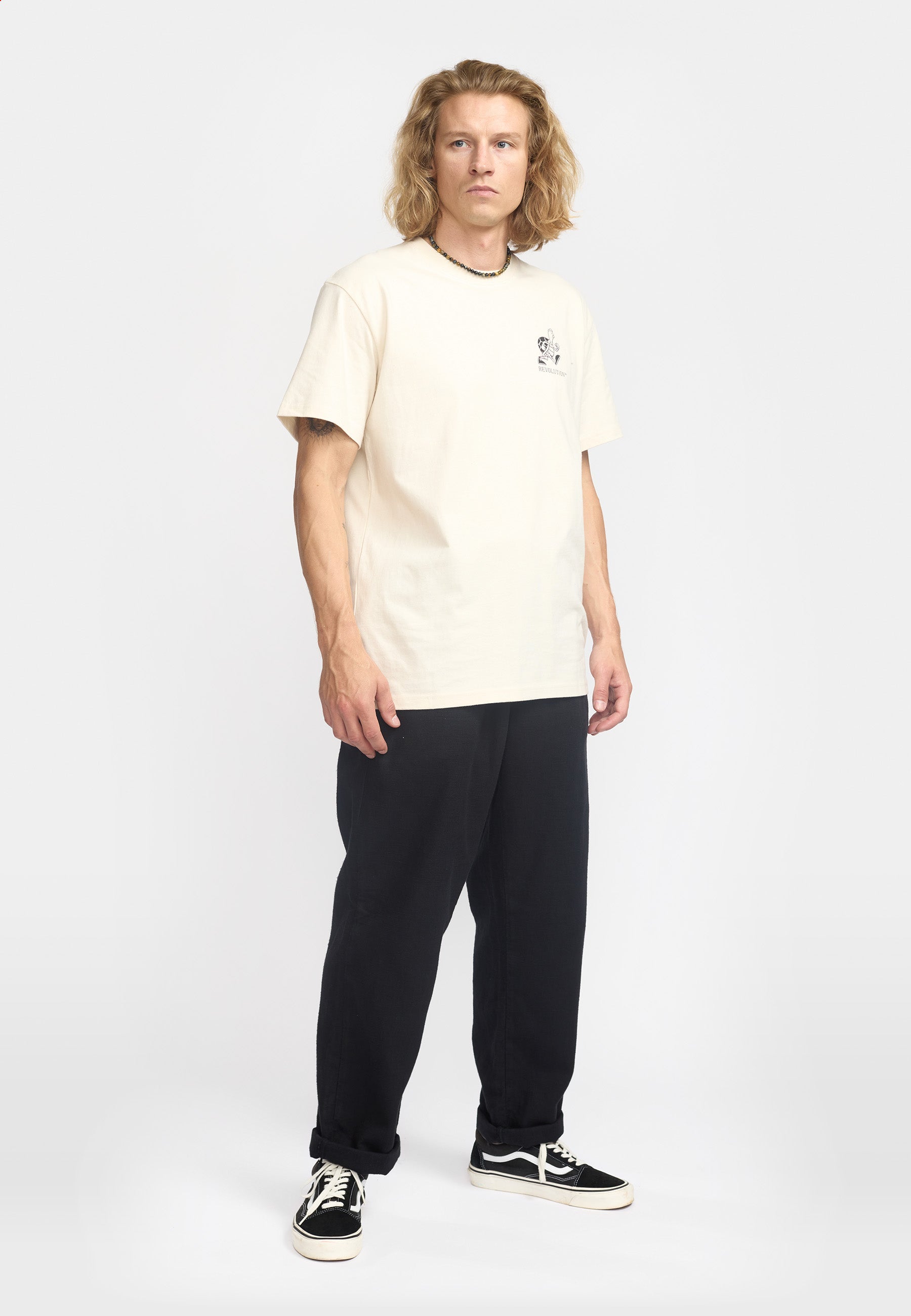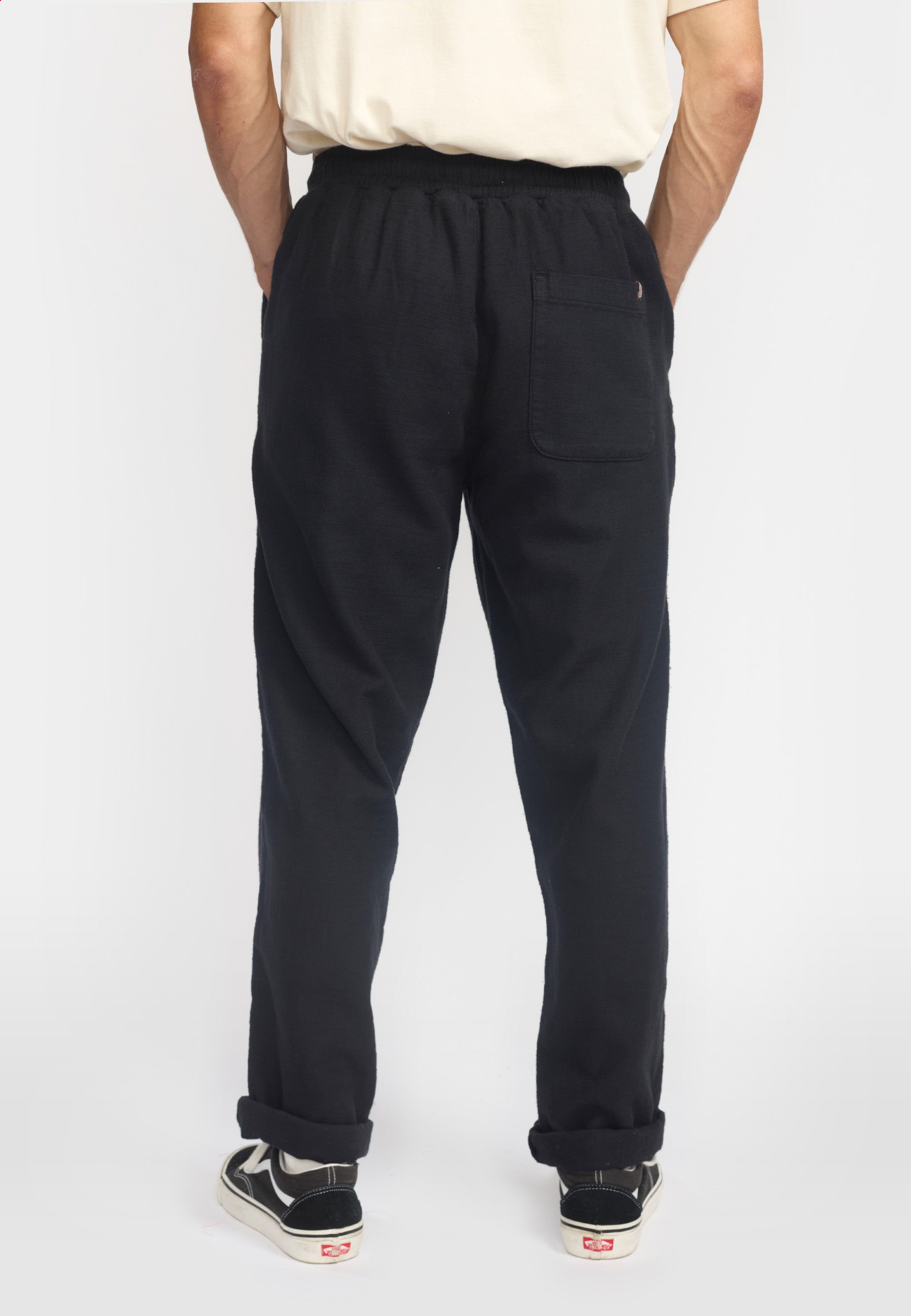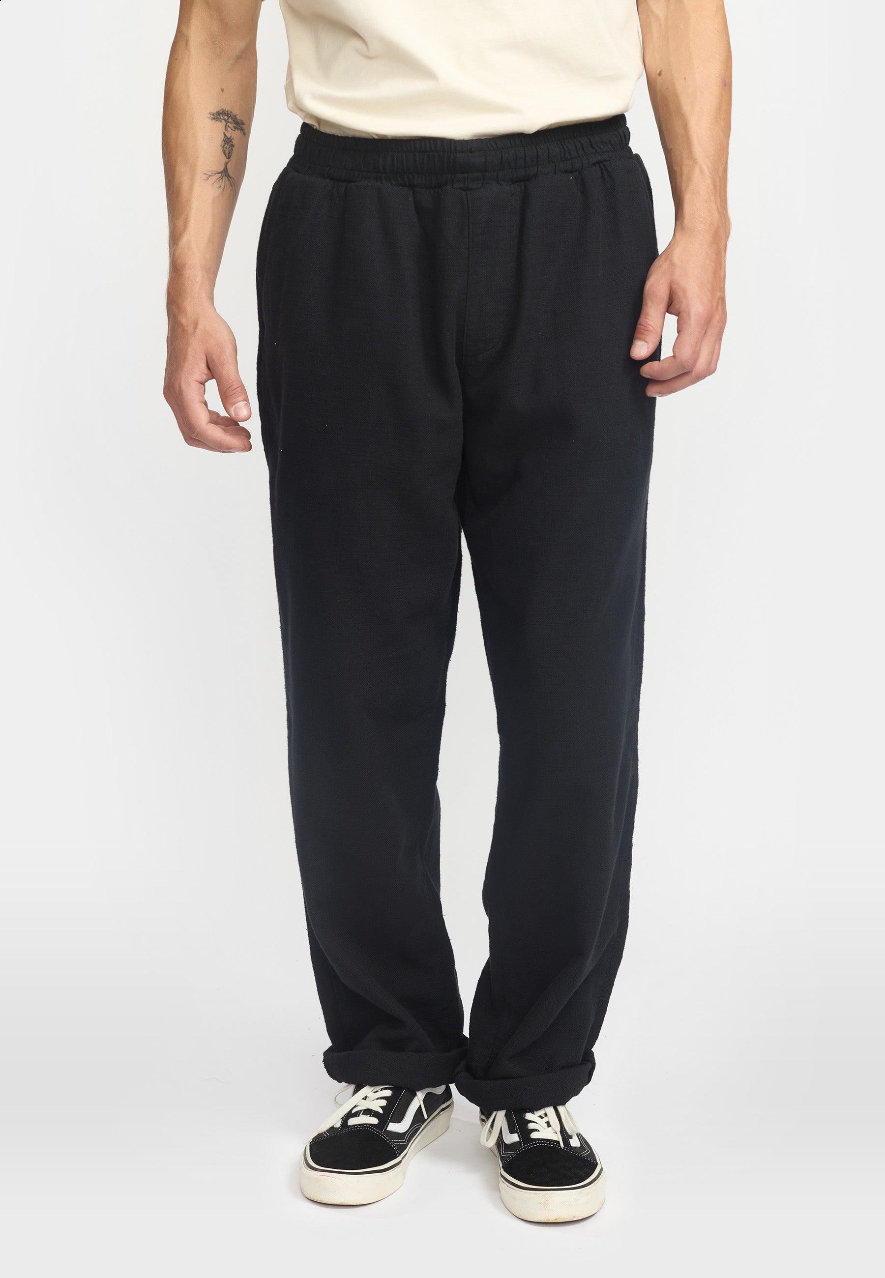 Los pantalones informales más cómodos, perfectos para cualquier conjunto diario. Estos pantalones sin cremallera tienen un corte ligeramente holgado y están confeccionados con un tejido de algodón orgánico de peso medio y una estructura gruesa característica. Cuentan con una cintura elástica para mayor comodidad, un cordón oculto para ajustarlos y bolsillos laterales inclinados para guardar objetos de valor. Un único bolsillo redondeado con la etiqueta de la marca «Revolution» añade carácter a la parte trasera de los pantalones. Las perneras son cónicas para seguir la línea natural de la pierna, y el dobladillo se puede doblar para conseguir un look cropped.