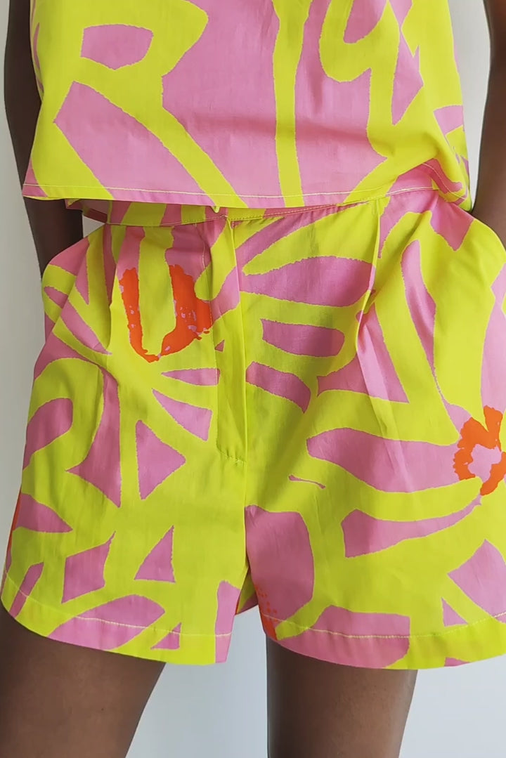 Corte tipo bernuda con pinzas delanteras, cierre abotonado y bolsillos laterales.