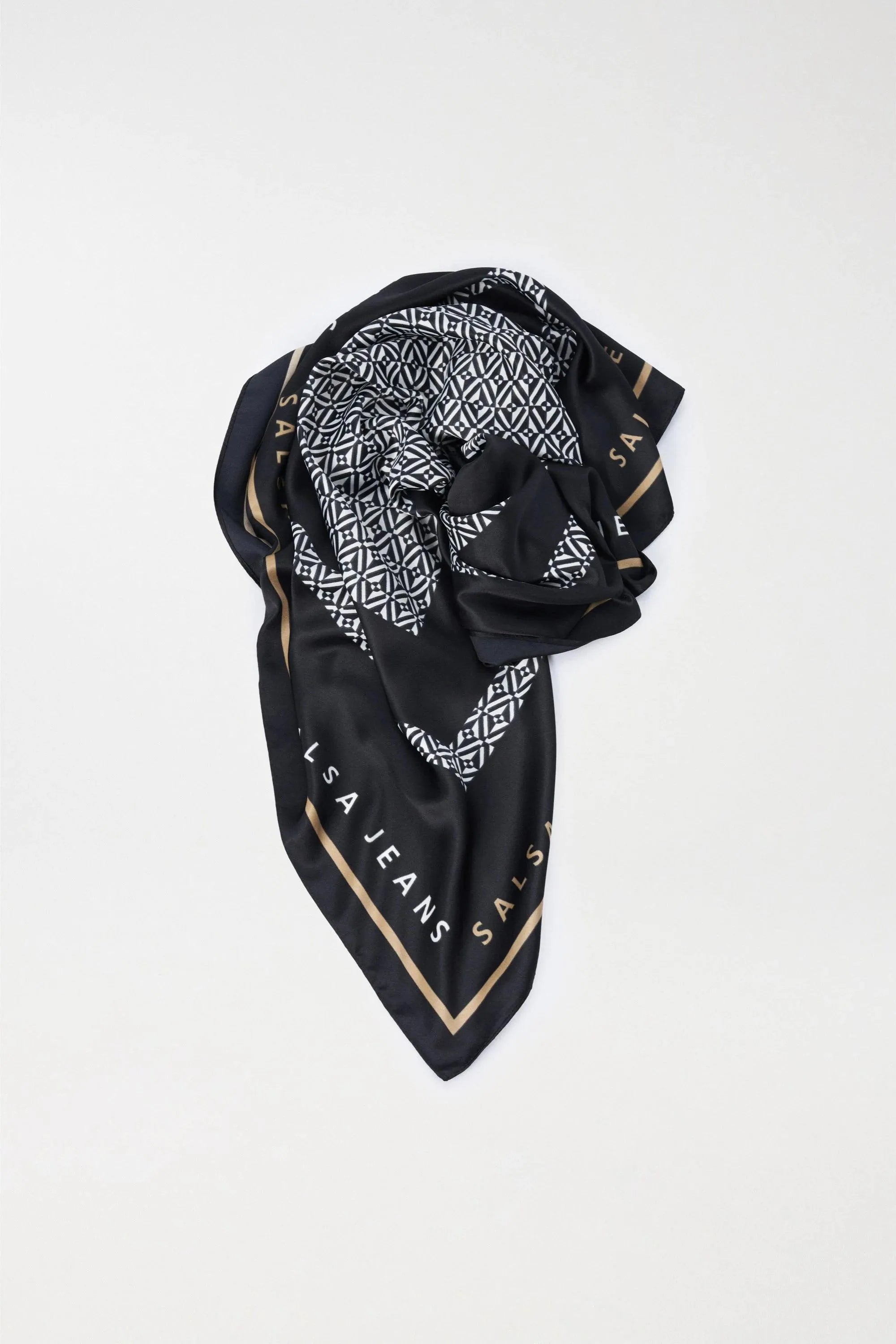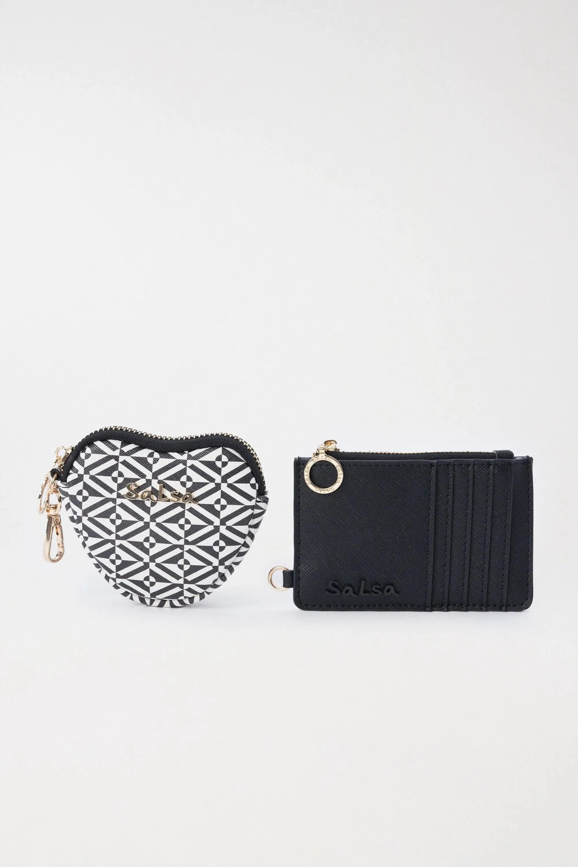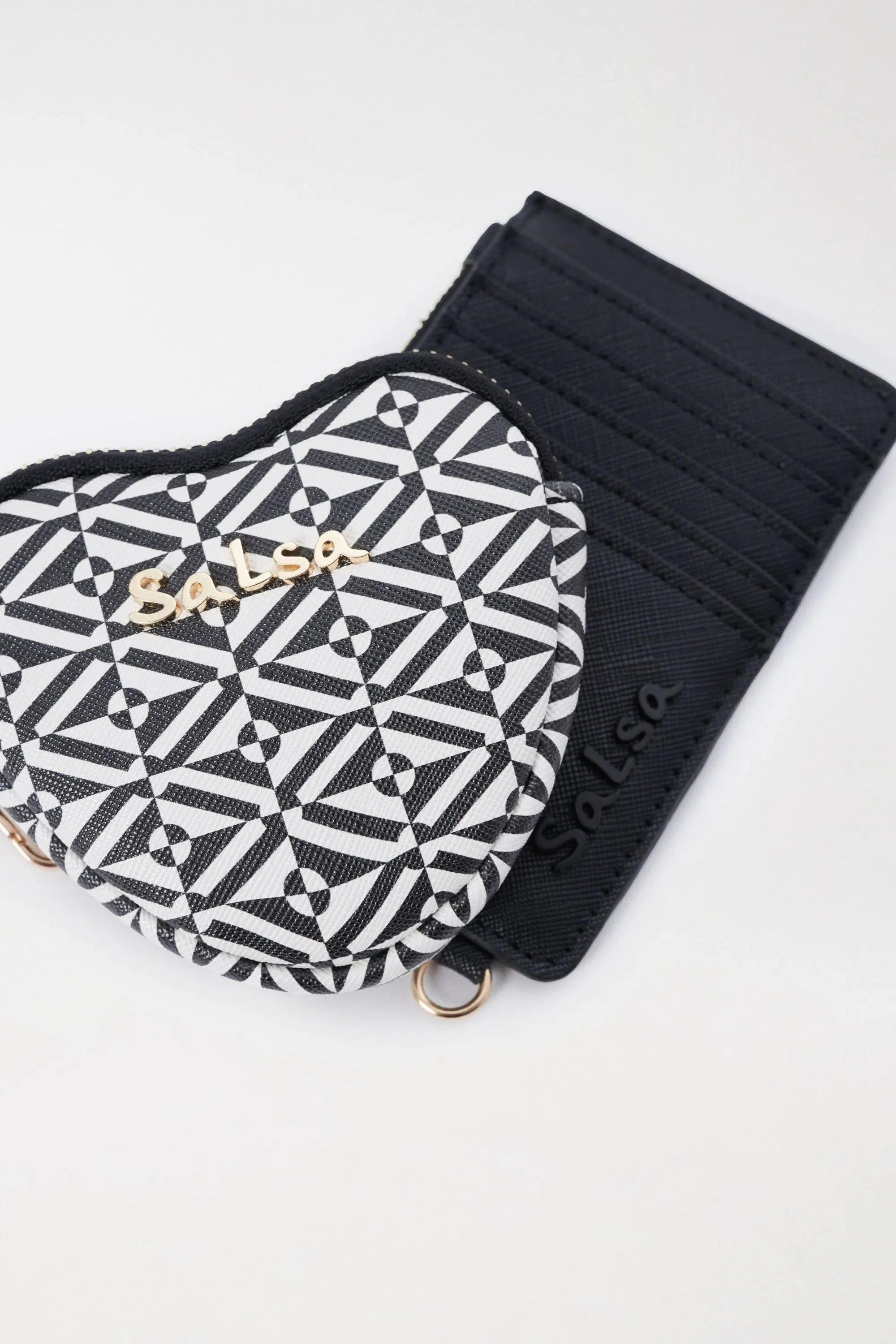 Pack pañuelo + 2 monederos. Monedero y pañuelo a juego con estampado geométrico y un monedero liso negro.