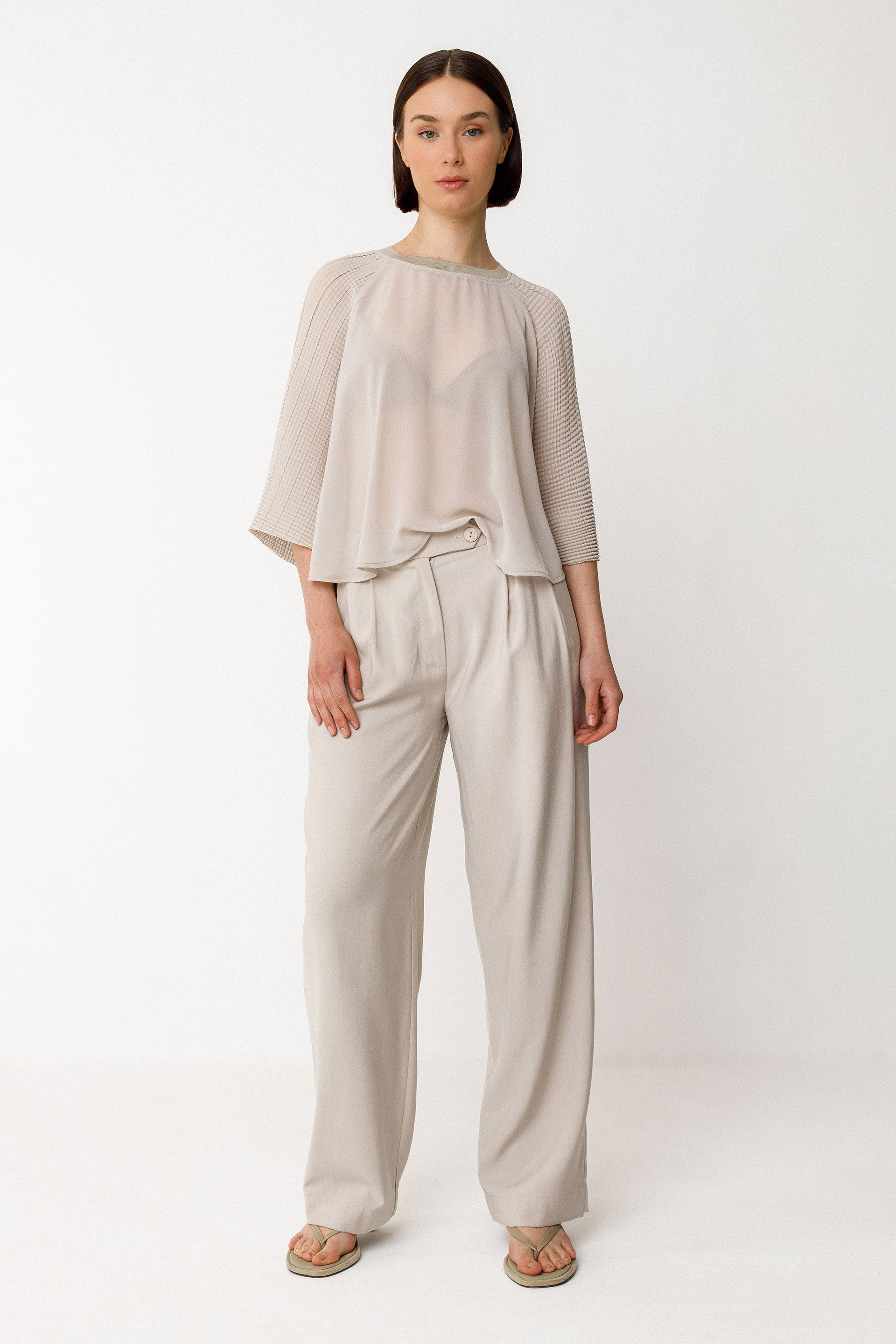 Camisa de forma semicircular con el cuello redondo de canalé y las mangas 3/4 en un tejido en contraste.