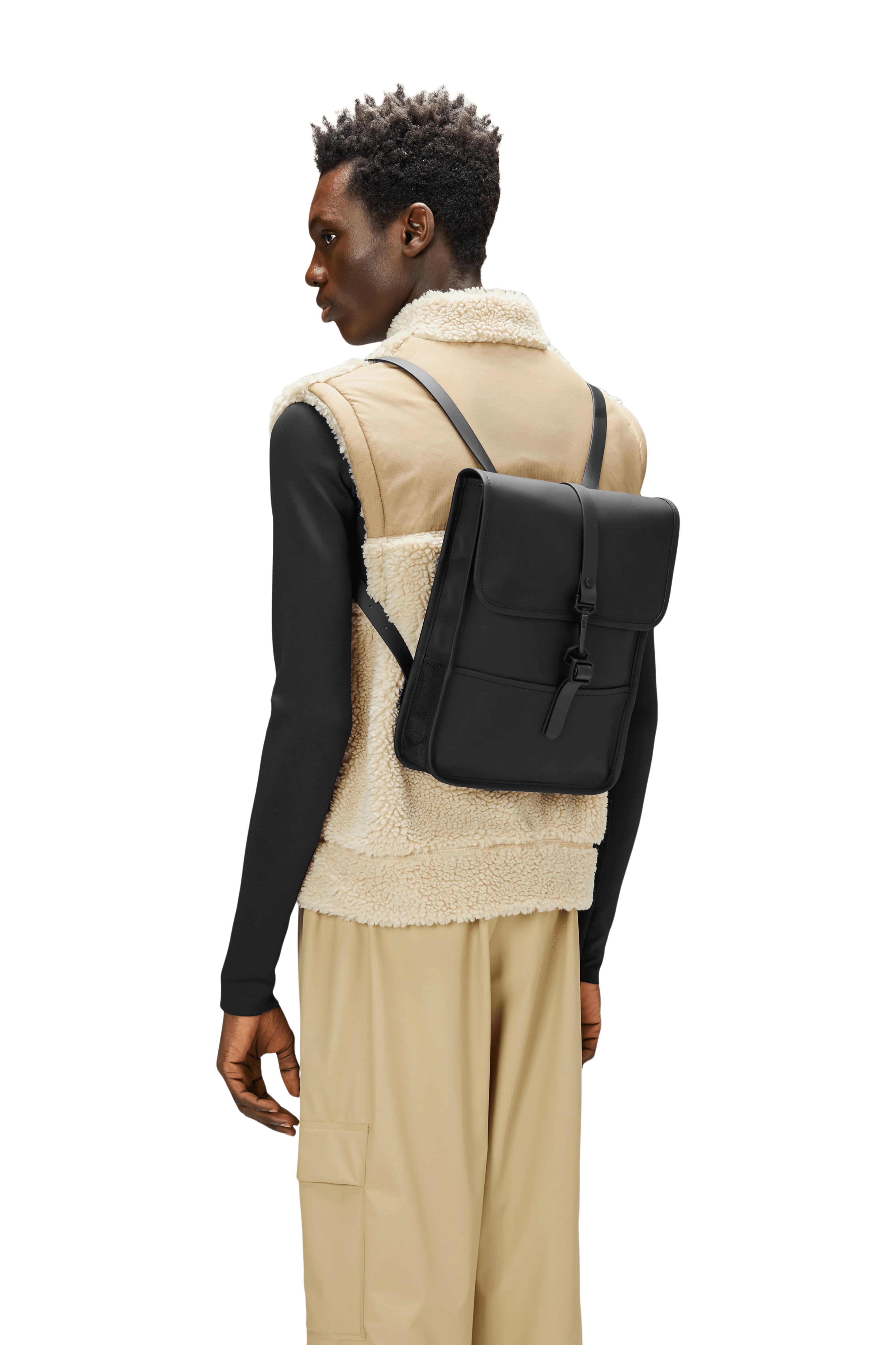Backpack Micro está confeccionada en el tejido de PU característico de Rains, diseñado para ofrecer robustez en el transporte, durabilidad y un suave acabado.