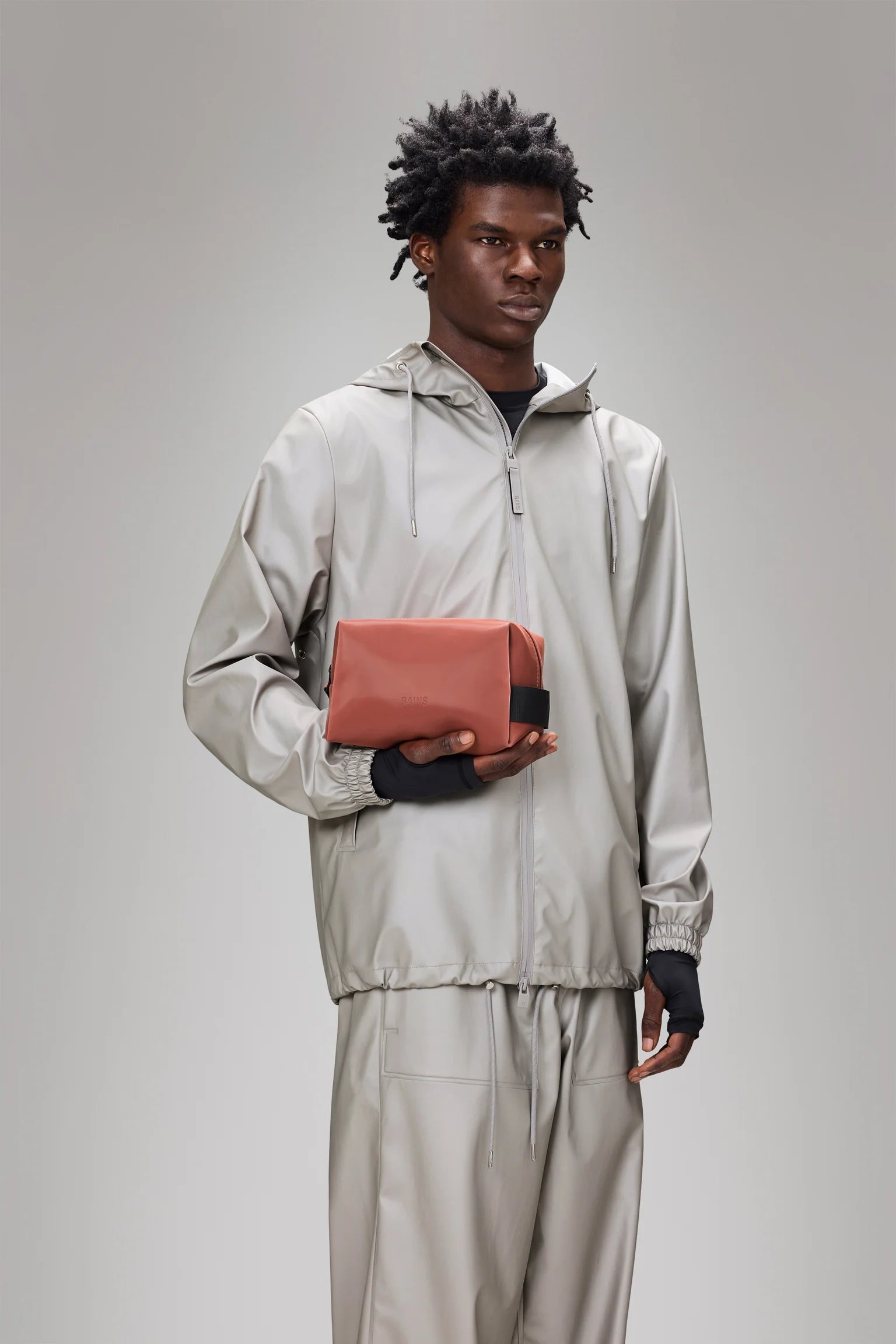 Wash Bag Small está confeccionado en el tejido de PU impermeable característico de Rains, diseñado para ofrecer robustez en el transporte, durabilidad y un suave acabado.