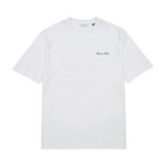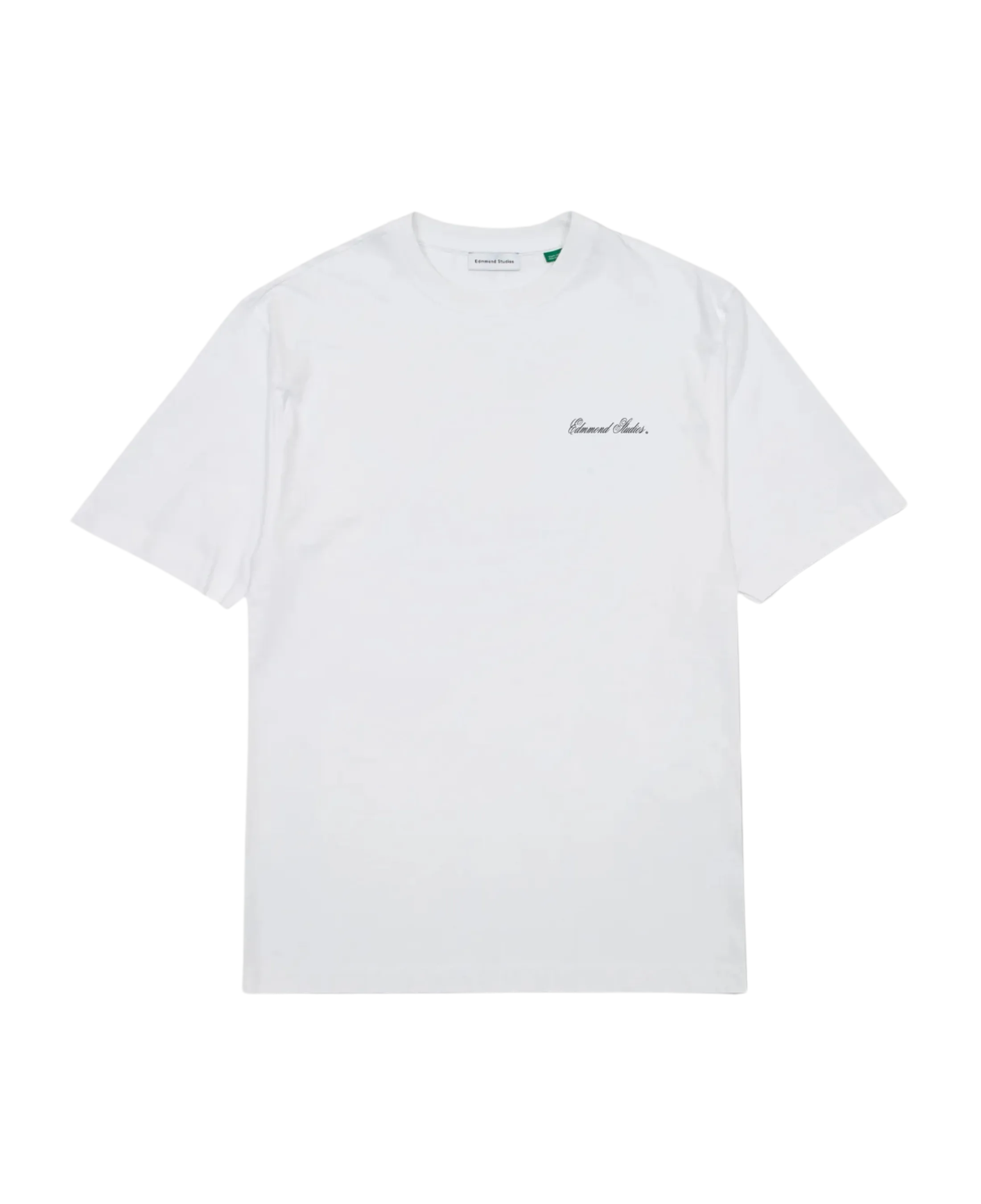Camiseta blanca de manga corta, confeccionada en Portugal con algodón 100% orgánico. Diseñada con un corte relajado y la longitud perfecta para estar cómodo todo el día. Lleva Edmmond Studios escrito en el pecho y una versión reimaginada de su icónico pato en la espalda.