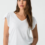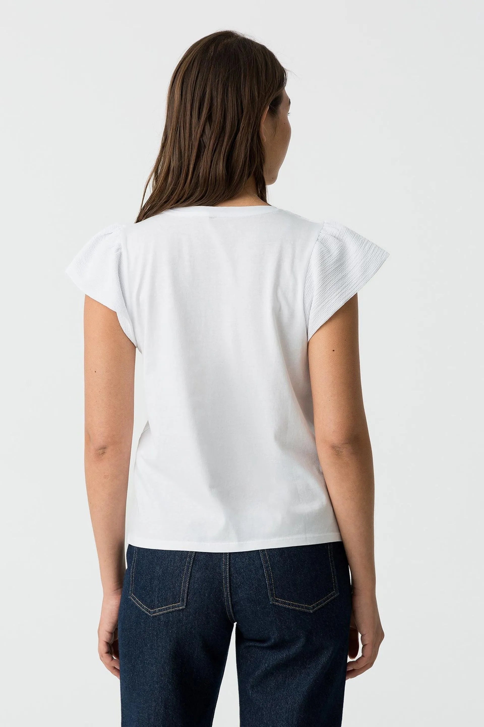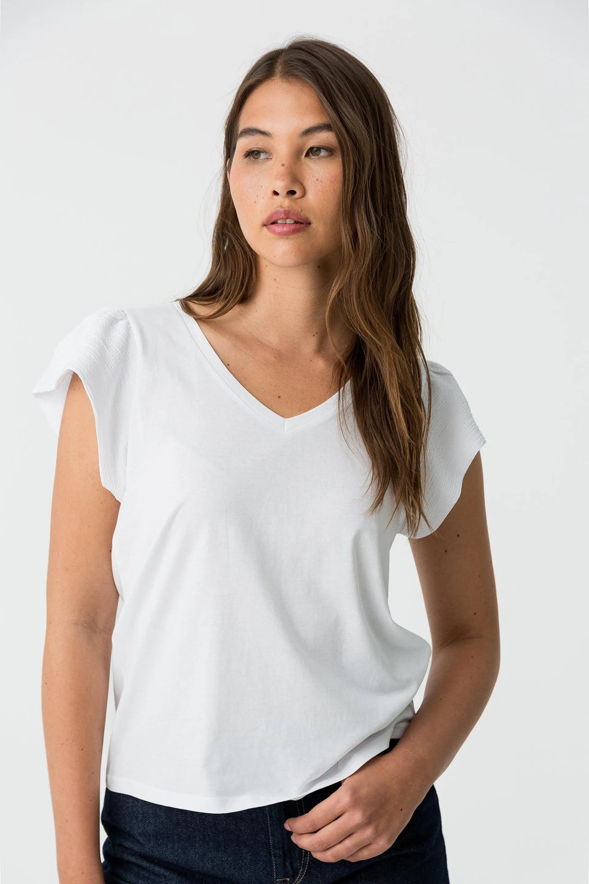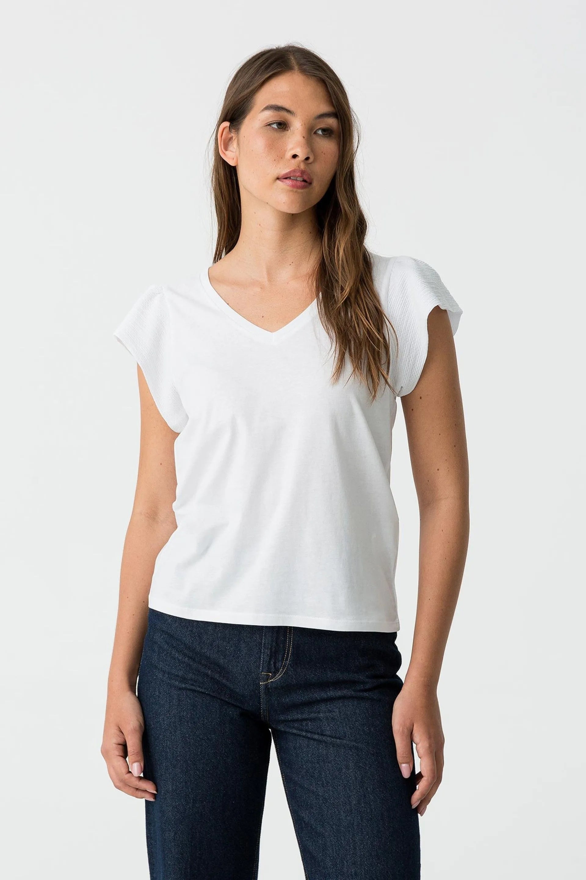 Camiseta de cuello en V y manga corta con efecto arrugado.