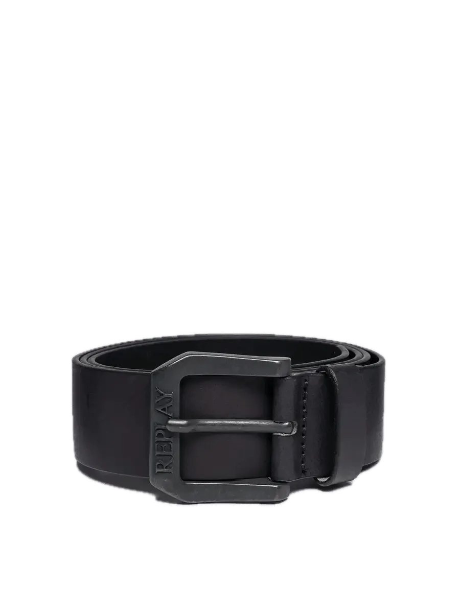 Cinturón de piel cepillada de color liso con hebilla escuadrada con acabado mate y texto con texto REPLAY grabado en relieve en la parte delantera. 4 cm de alto.