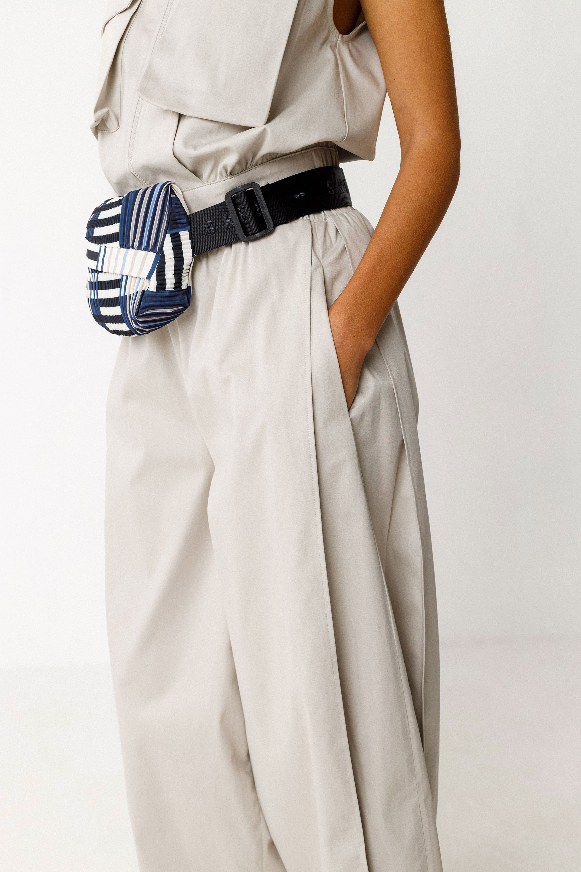 Bolso riñonera cilíndrico de tela plisada al bies. Cremallera oculta, correa de nailon ajustable y cierre a presión. Medidas: 25,5 x 14 x 5 cm.