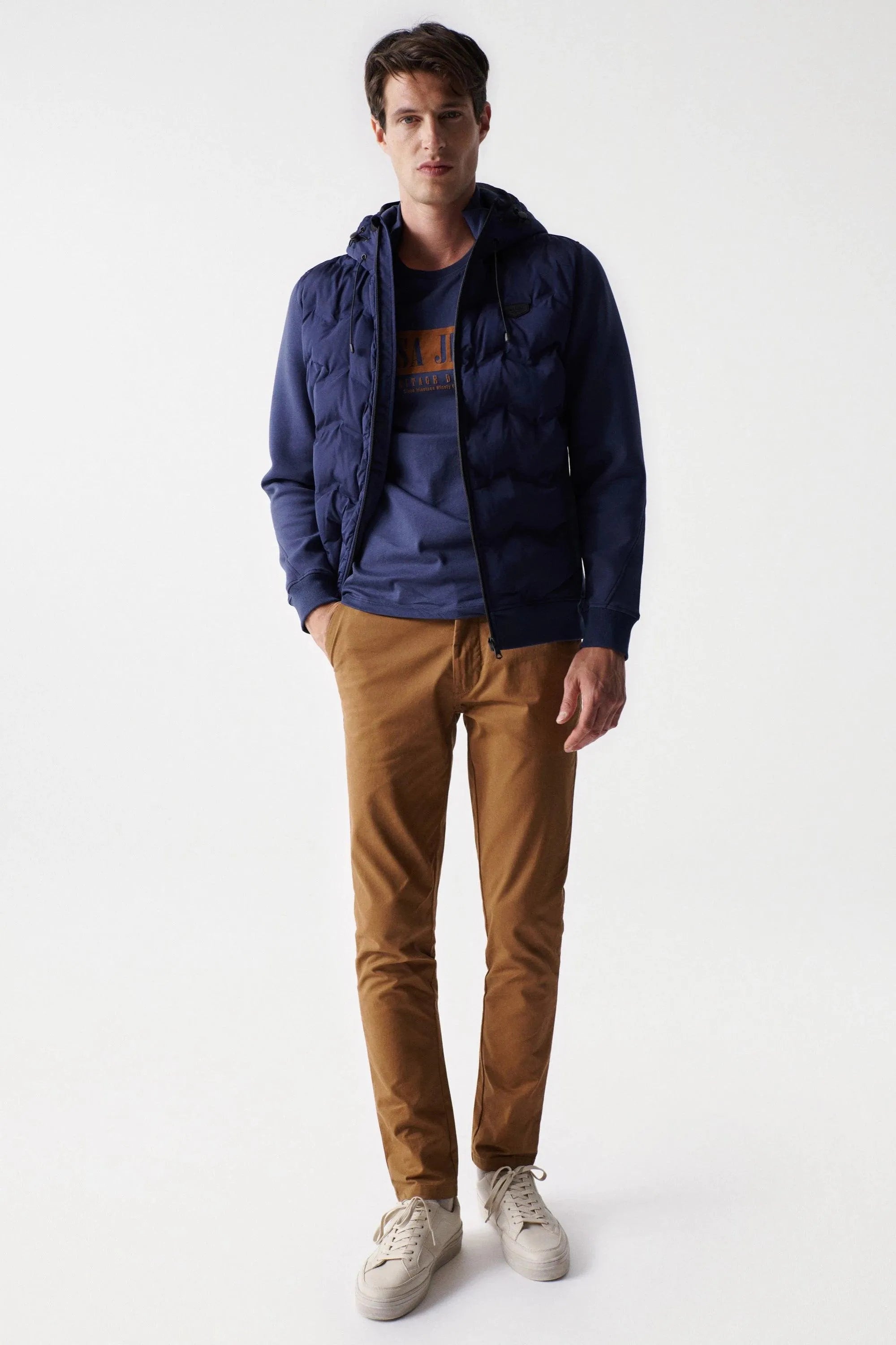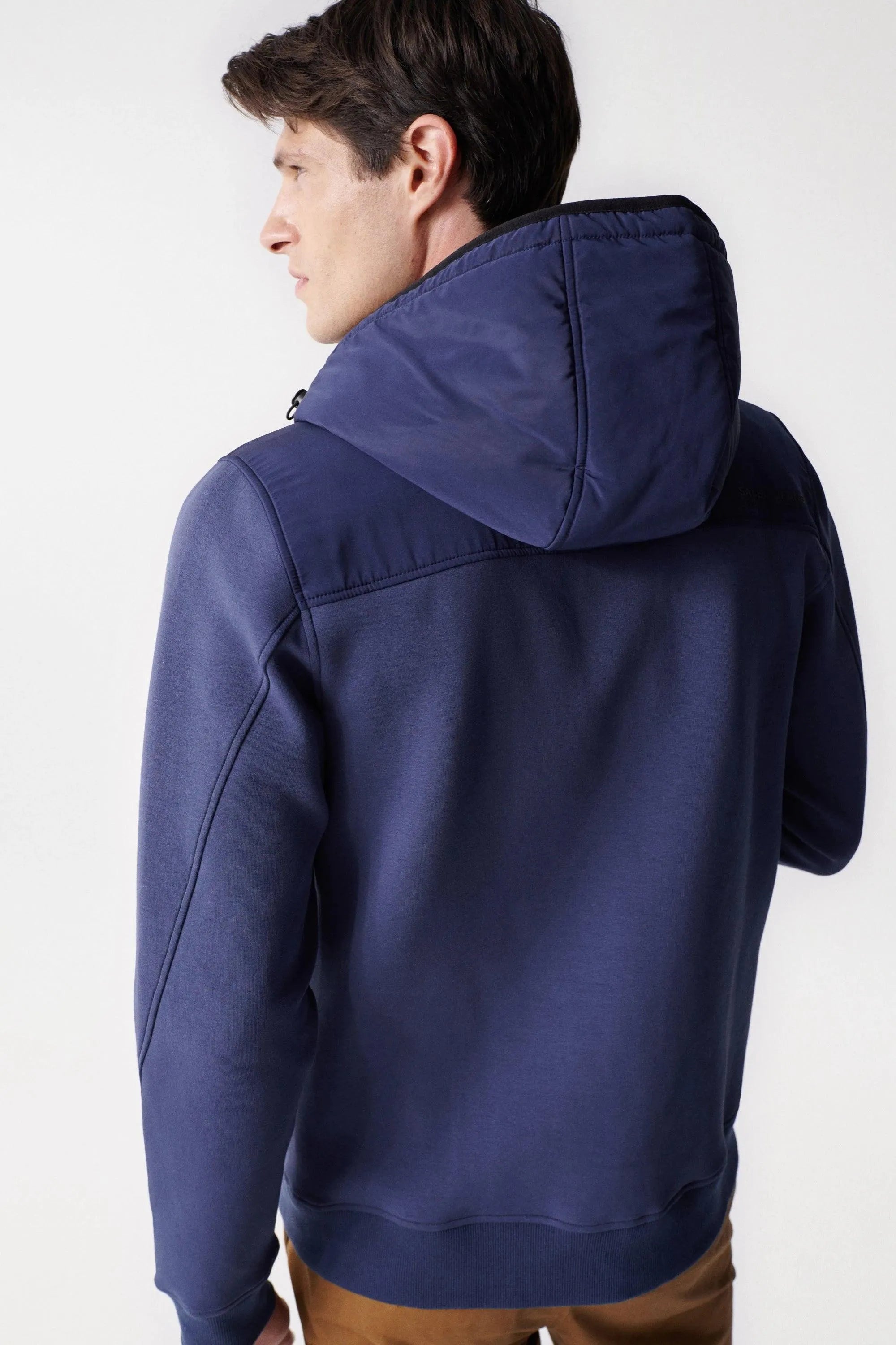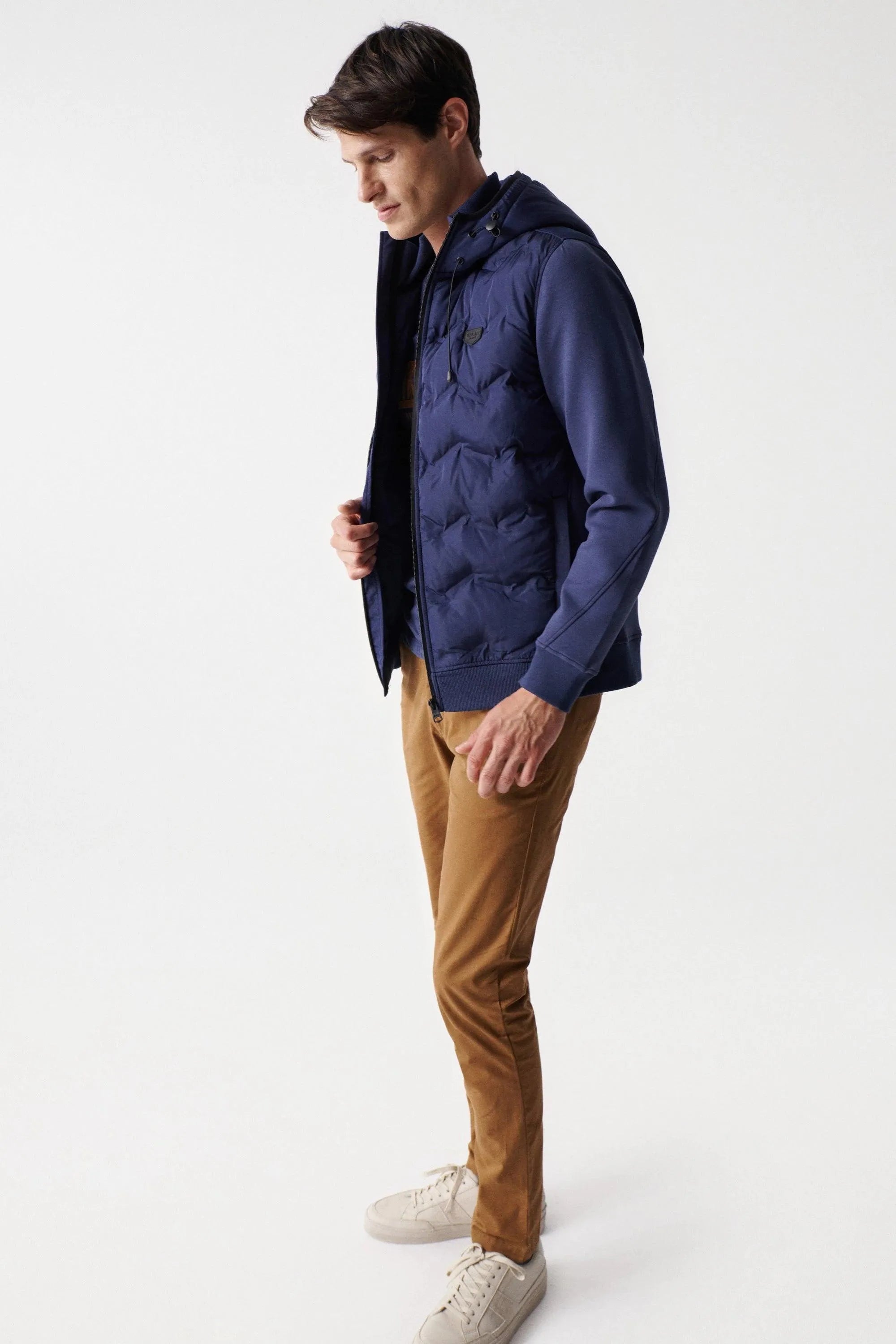 Chaqueta acolchada en la parte delantera con capucha. Azul. Cuello alto. Manga larga. Abertura frontal con cierre de cremallera. Bolsillos laterales. Capucha ajustable con elástico