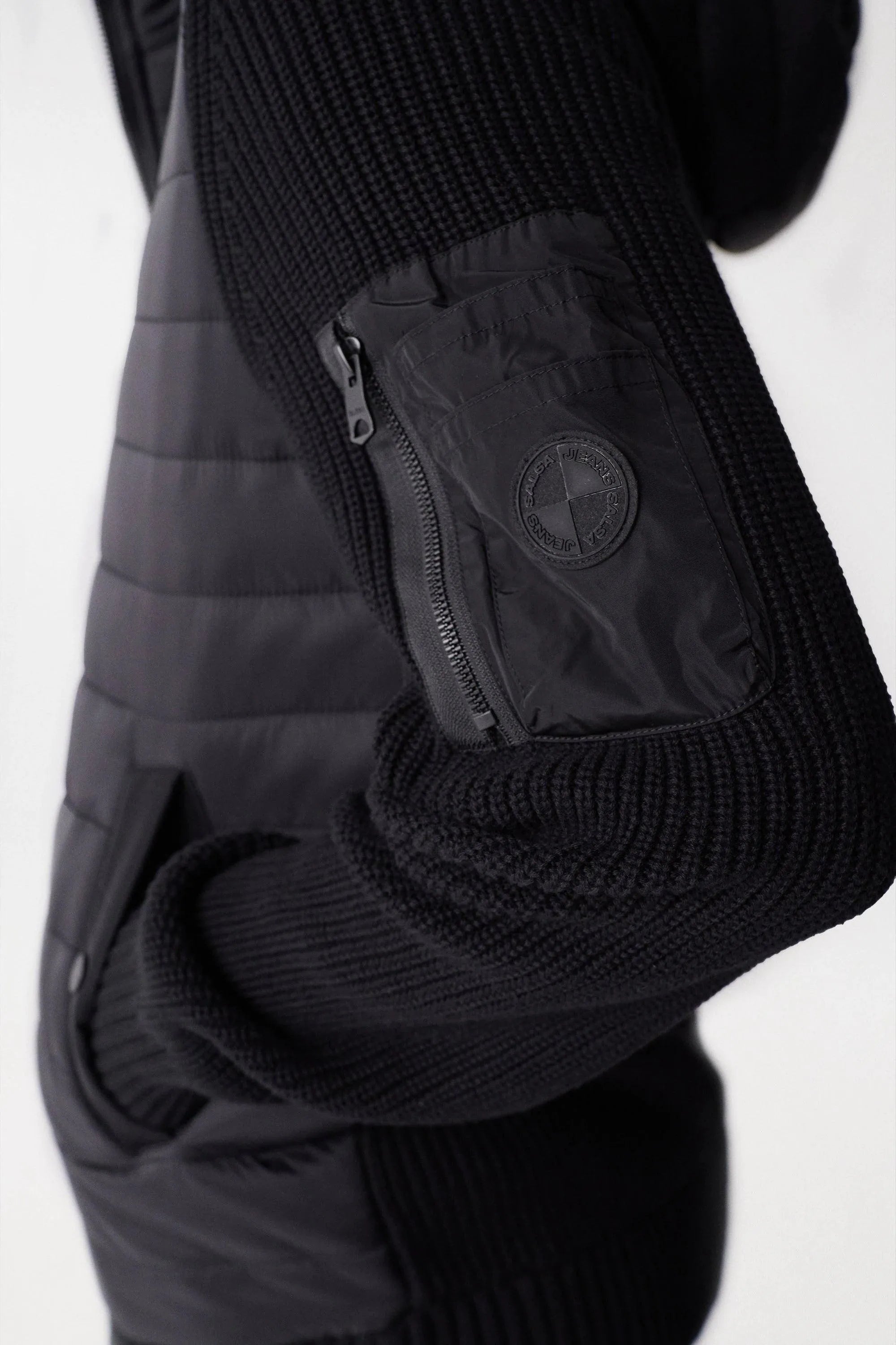 Chaqueta de punto tricotado con parte frontal y capucha acolchadas. Negro. Corte Regular. Manga larga con puños. Cierre de cremallera. Dos bolsillos laterales con corchete. Detalle de bolsillo en la manga.