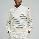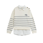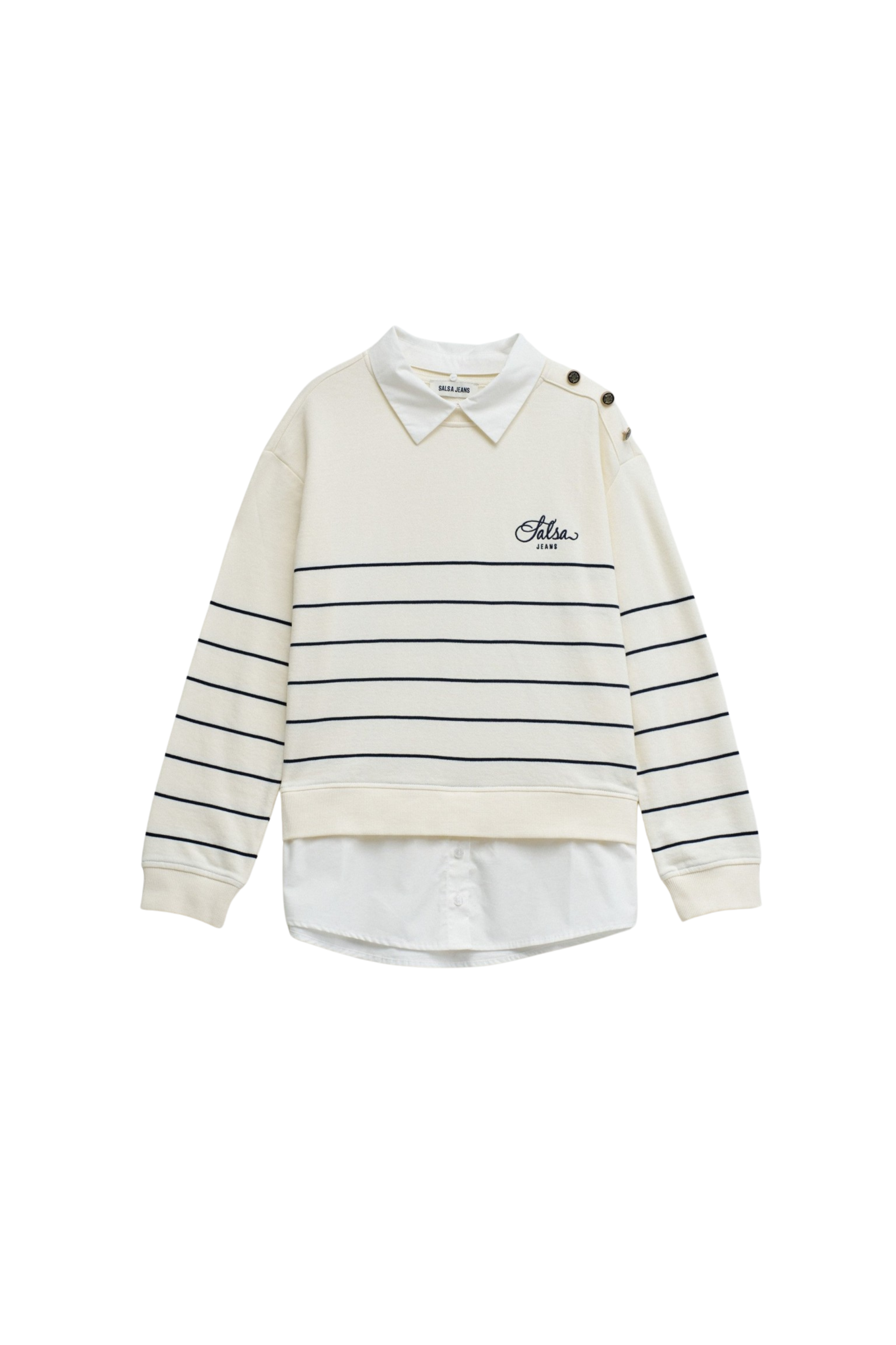 Prenda combinada que mezcla punto tipo jersey con efecto camisa integrada.