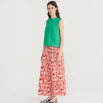 Pantalón de color rojo. Diseño de corte relajado con tiro medio, con elástico en la cintura para un ajuste flexible, confección en tejido no elástico, corte evasé, con bolsillos. Tallaje normal, elige la talla habitual. Producto fabricado en España.