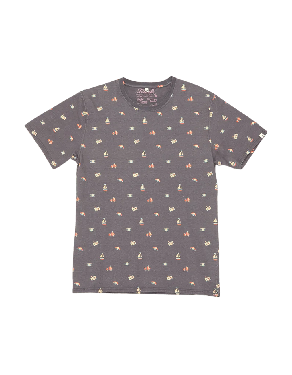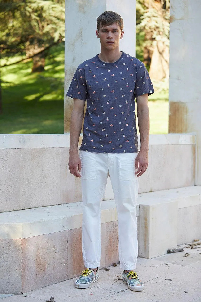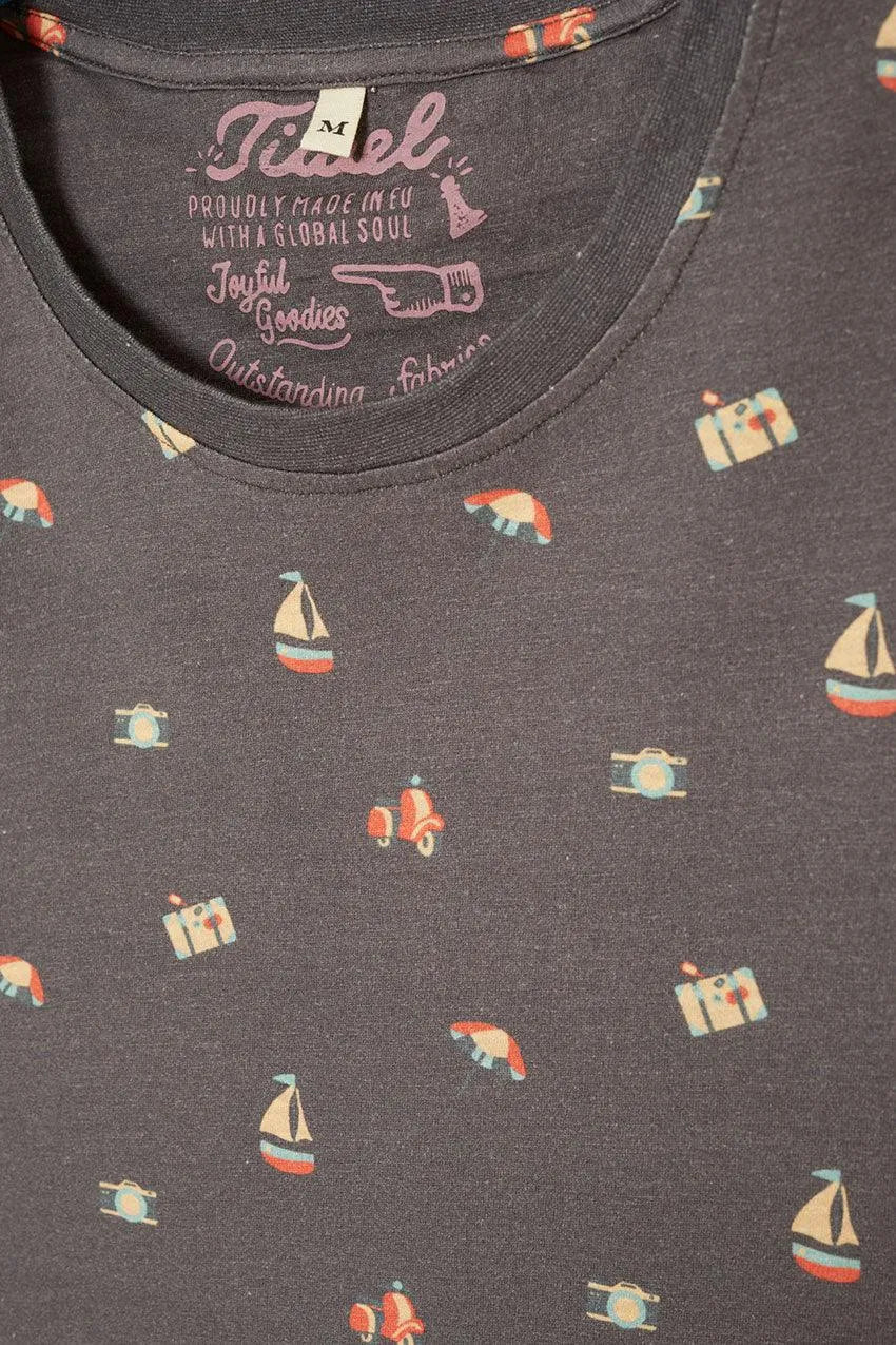 Camiseta Baggy, edición especial, en color azul oscuro y composición 100% algodón orgánico single jersey. Decoración y estampado all-over-print multicolor con motivos viajeros, para la nueva colección primavera-verano “Knit art pattern“.