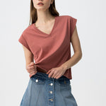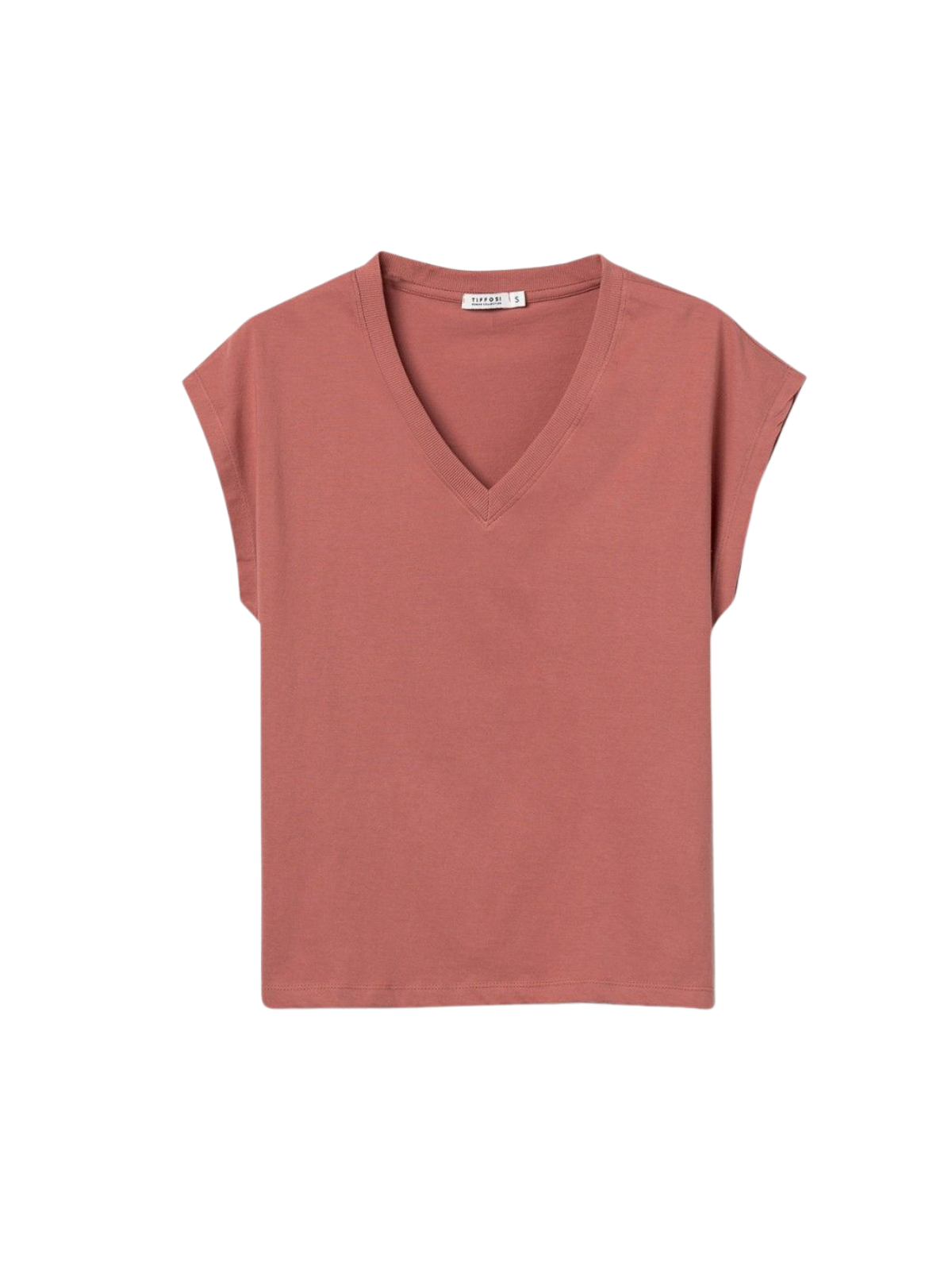 Camiseta rosa de corte regular con mangas cortas y cuello en V, estilo casual y fresco.