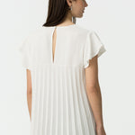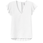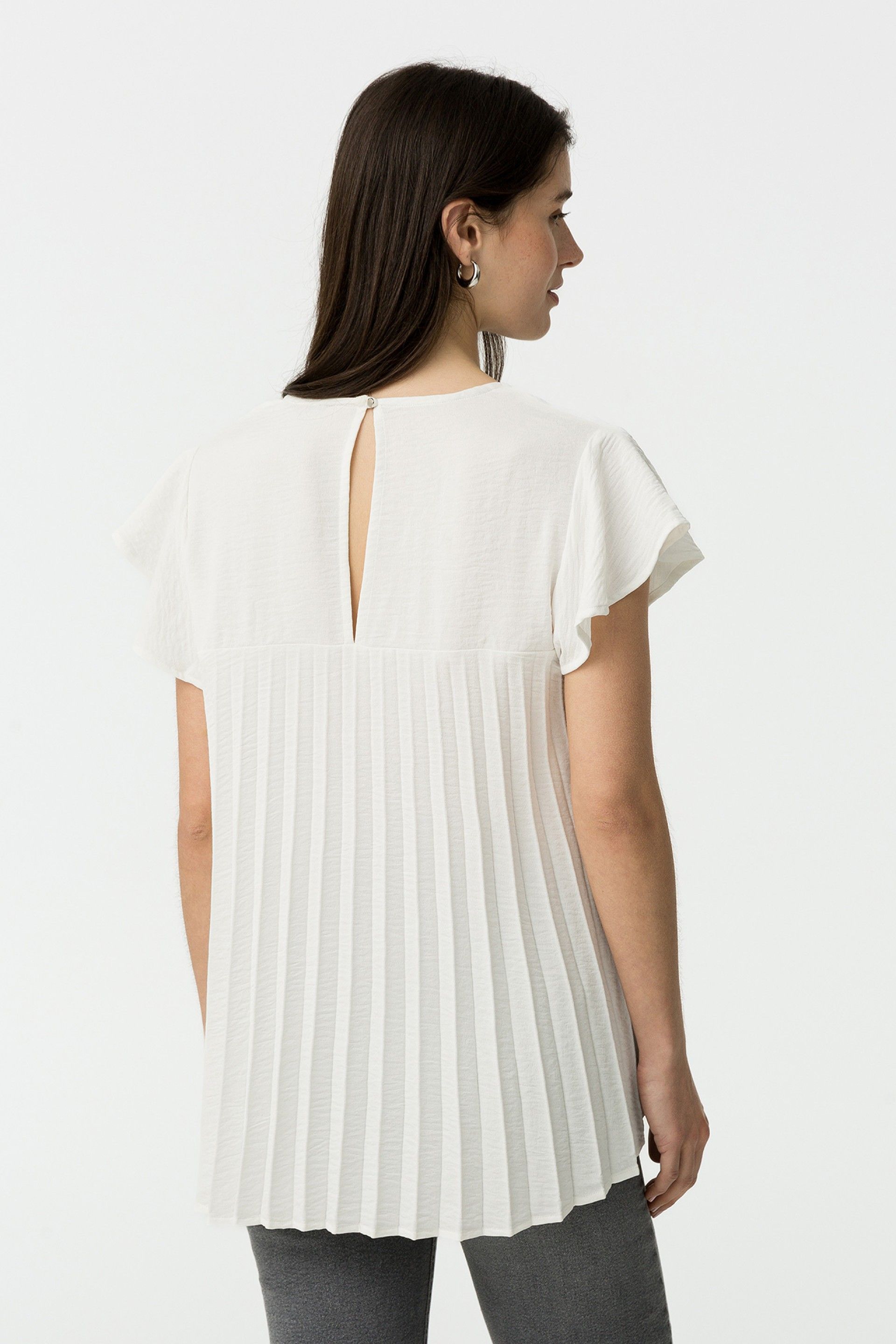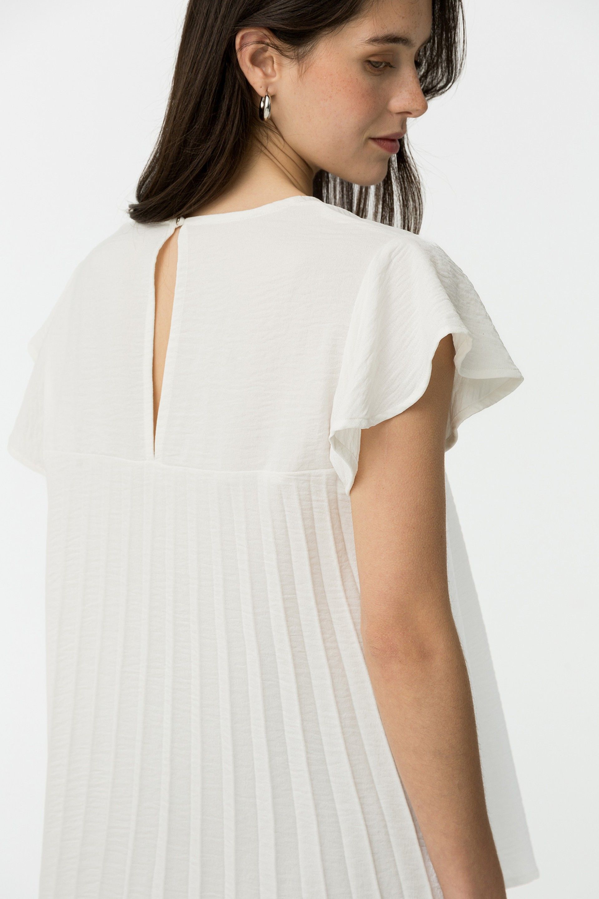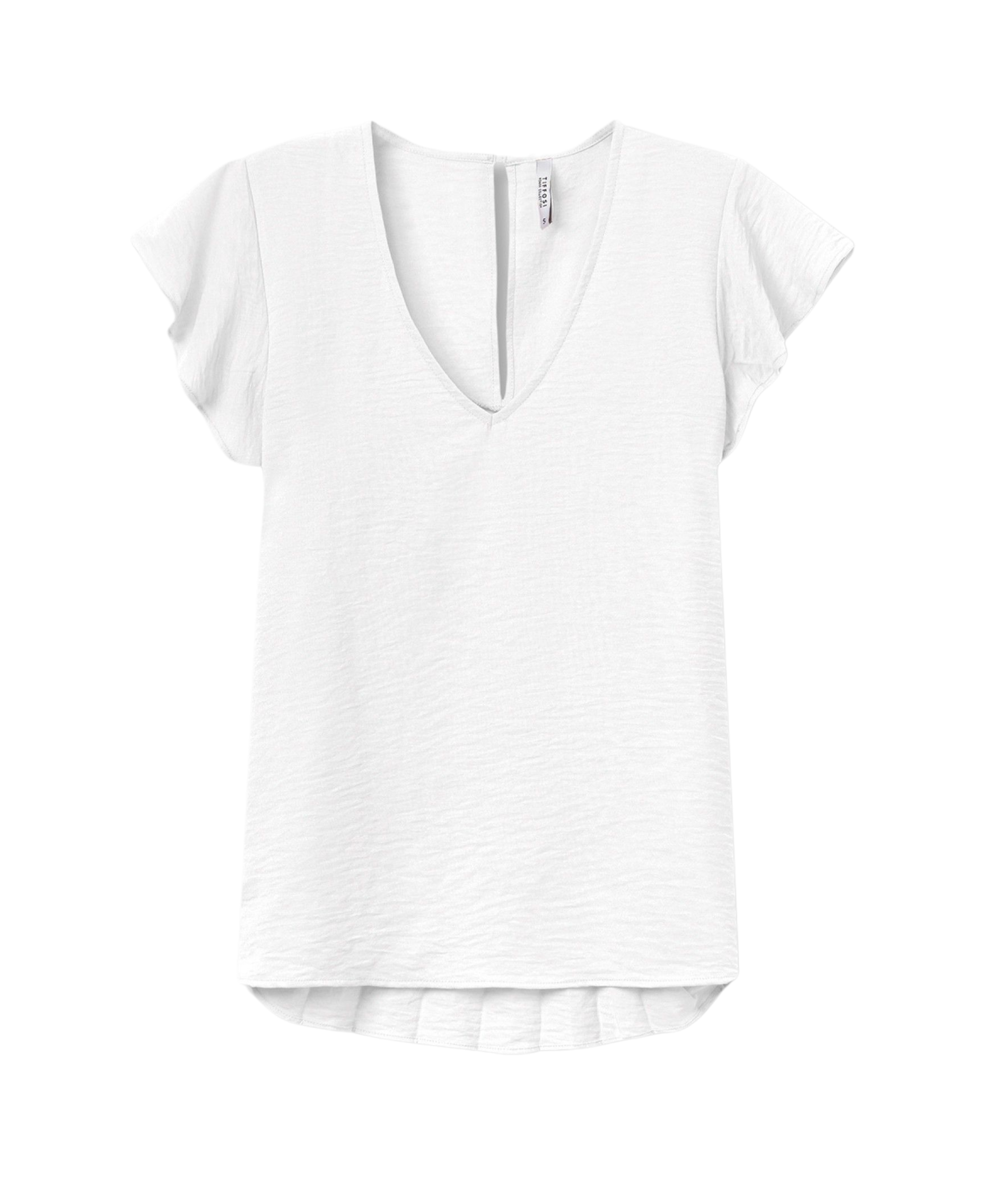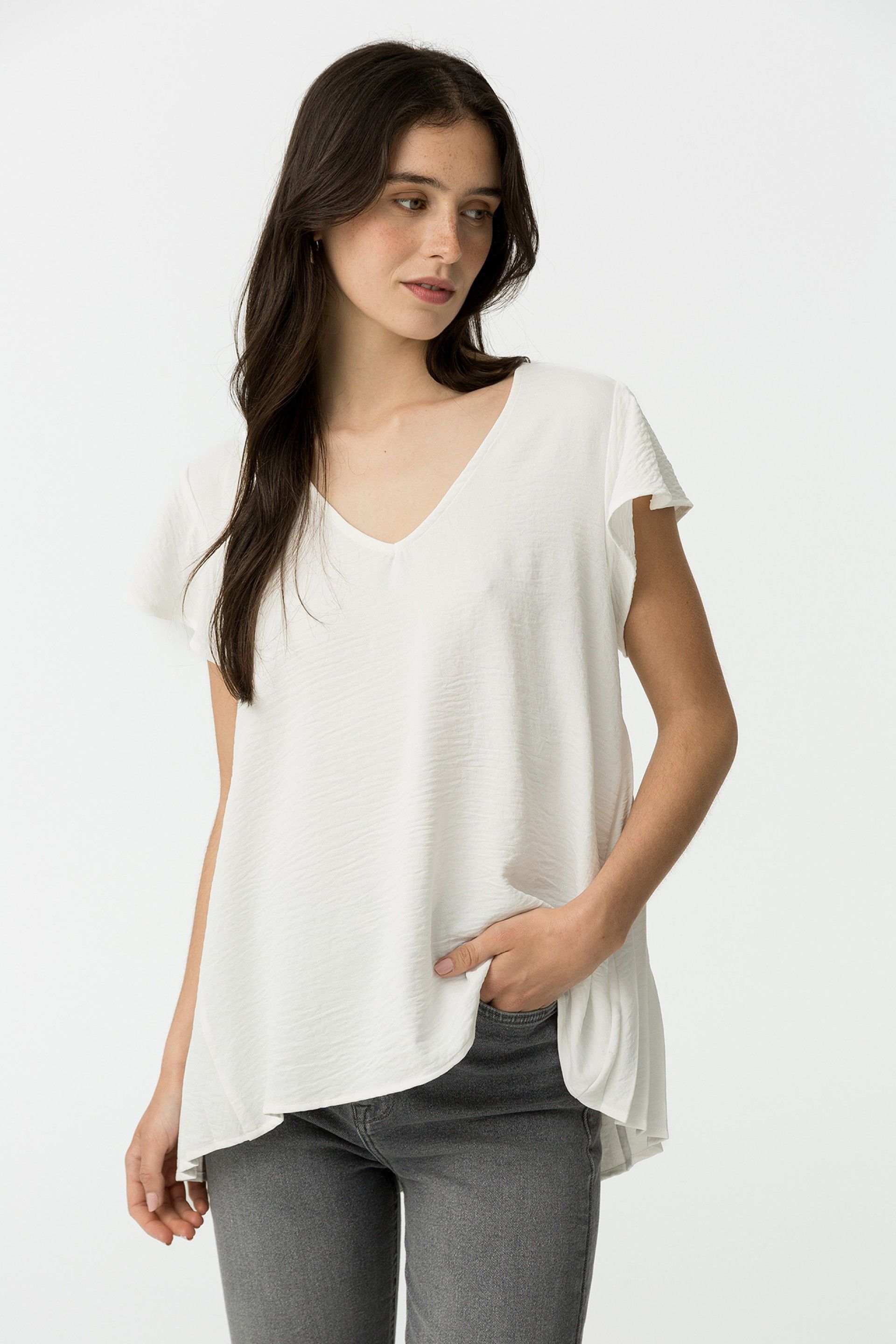 Blusa con escote en V y manga abalonada. Detalle de volantes y elástico tipo crepe en la espalda.