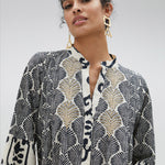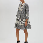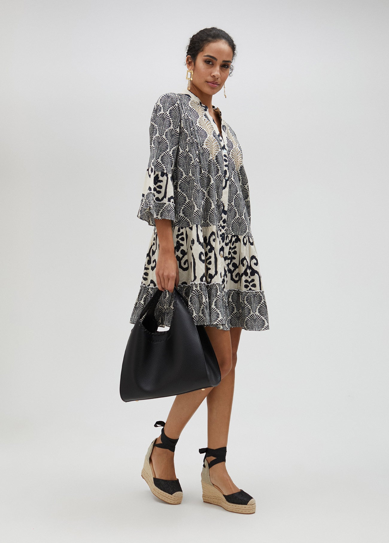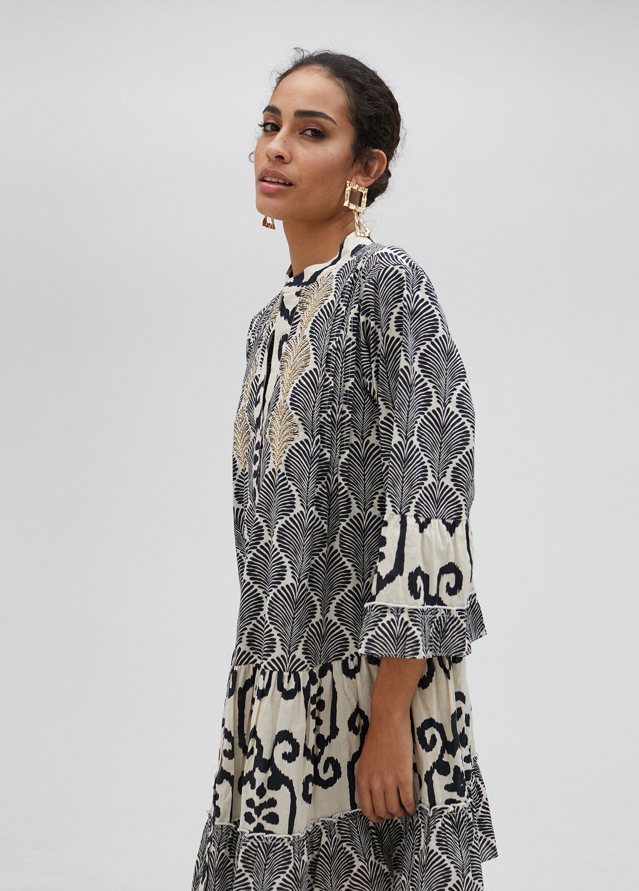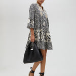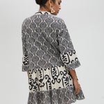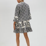 Vestido corto con mangas 3/4 y volantes, confeccionado en mezcla de estampados y piedras bicolor bordadas. De ajuste cómodo y elegante, perfecto para destacar en cualquier ocasión. Su diseño combina originalidad y sofisticación.