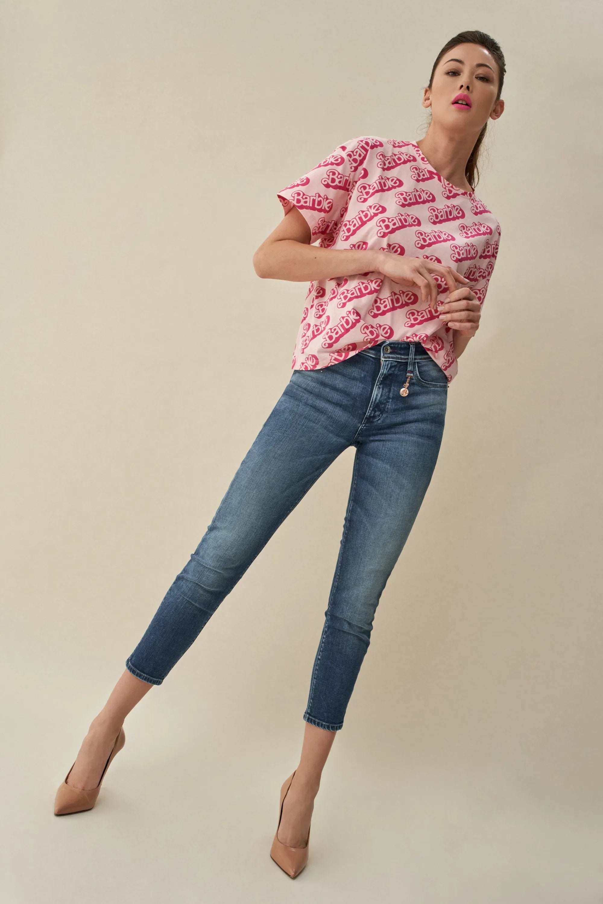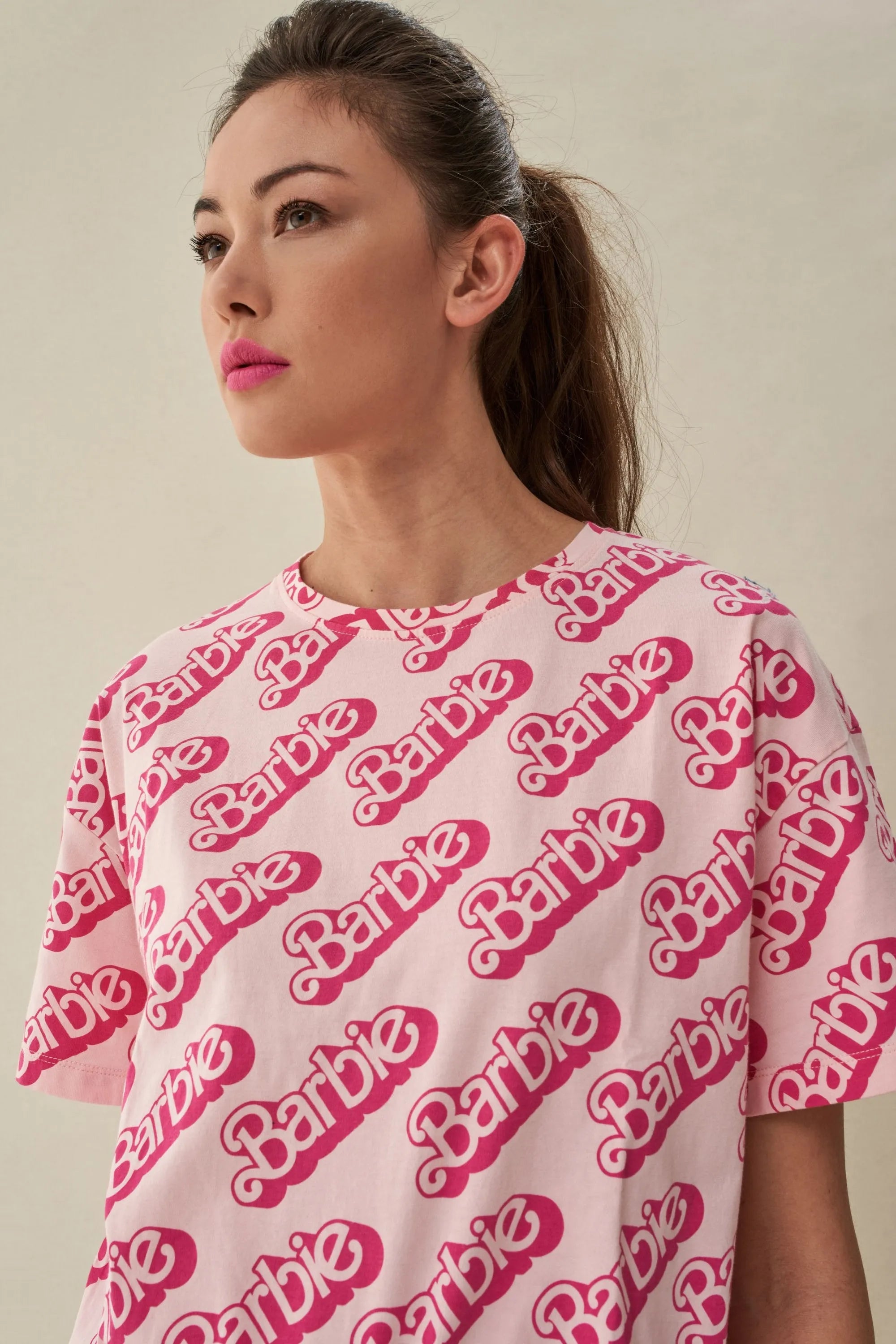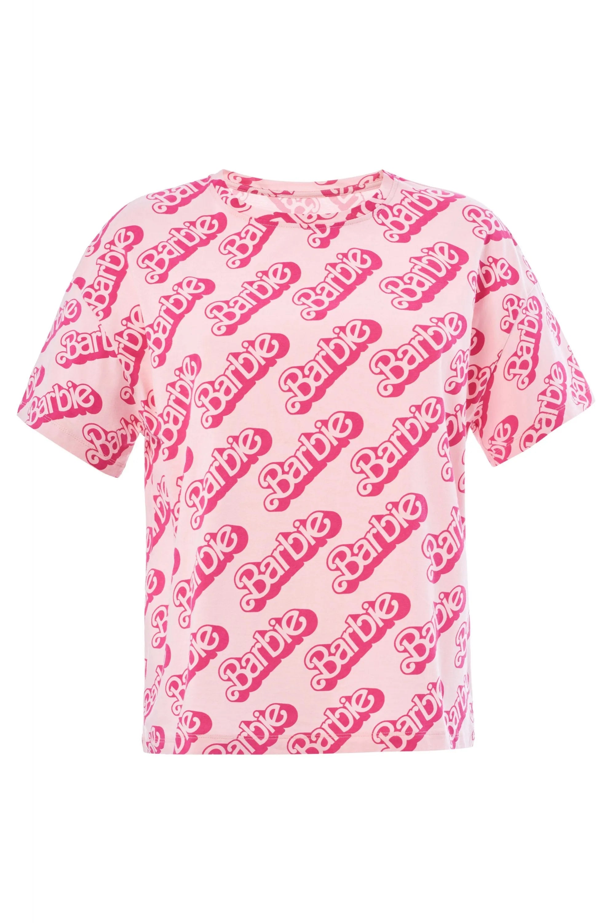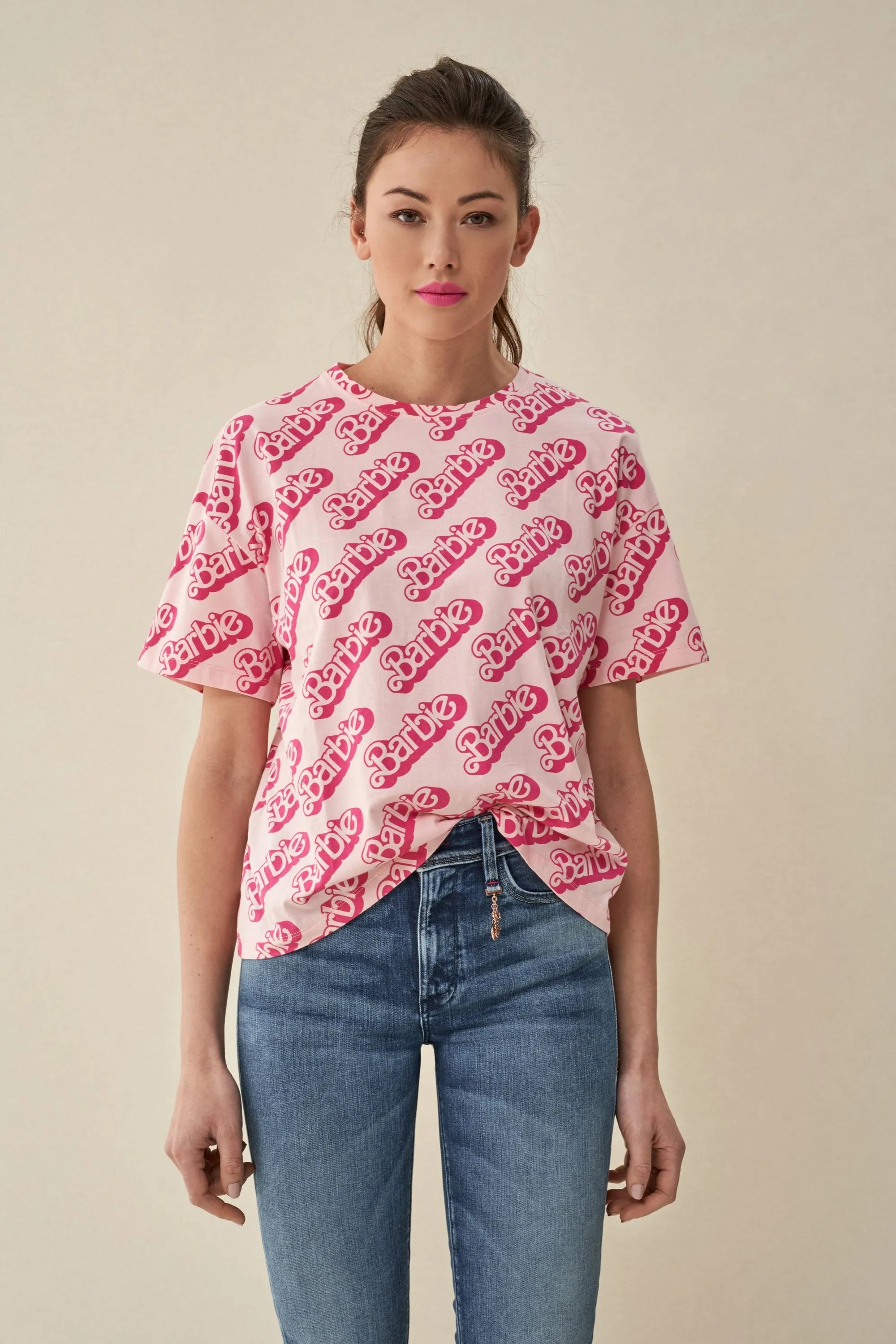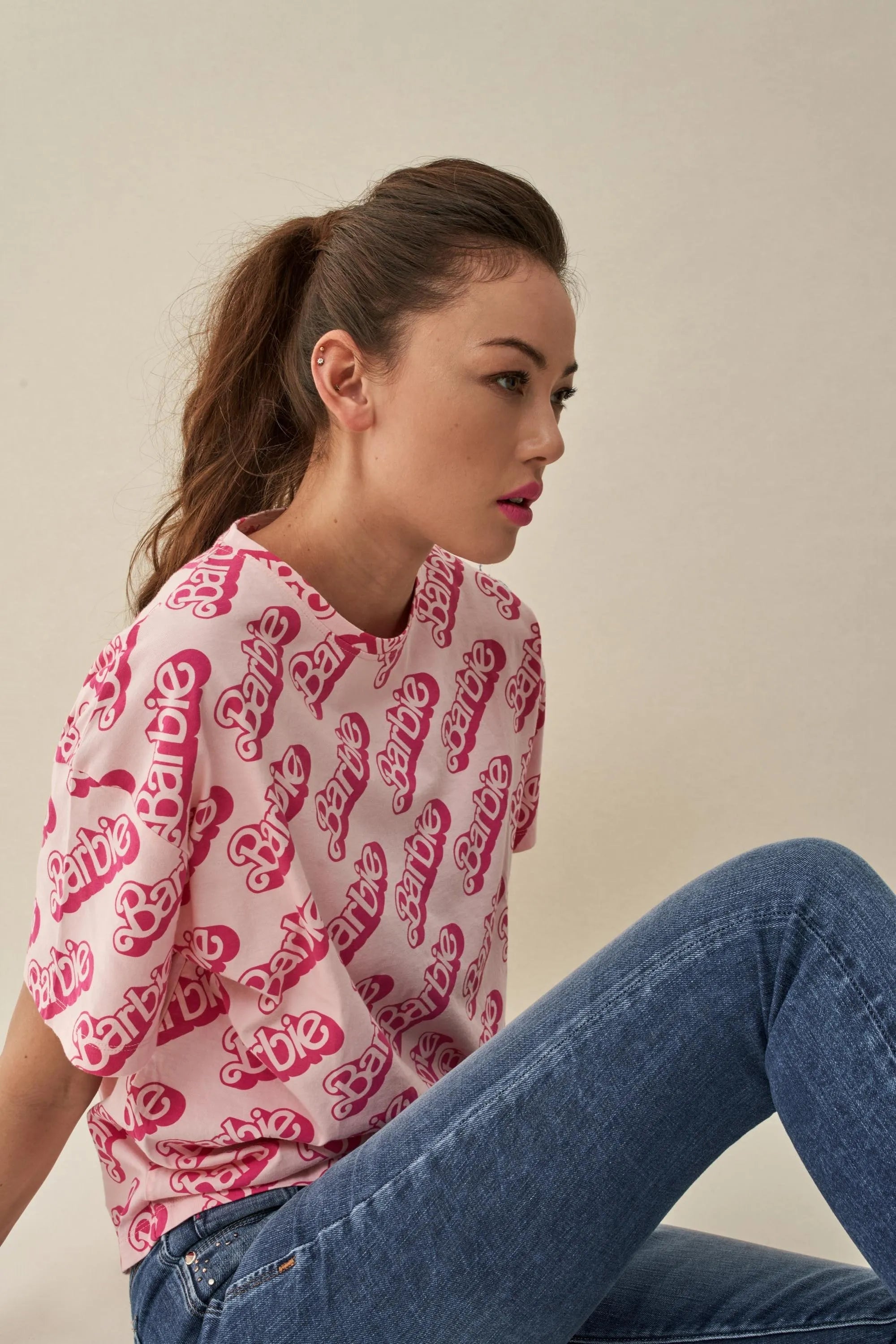 Celebramos la esencia da cada mujer con esta colección cápsula «Salsa x Barbie». Camiseta rosa con estampado "Barbie" allover. Cuello redondo. La modelo mide 180 cm y lleva la talla S.