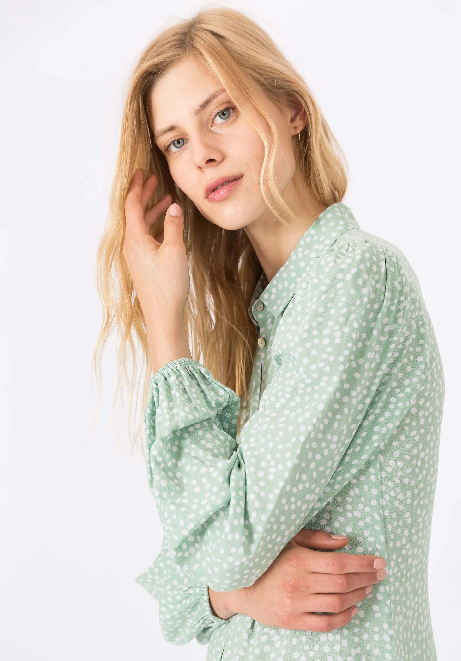 Vestido estampado con cuello de solapa y manga larga con elástico. Cierre frontal con botones. Estampado all over.