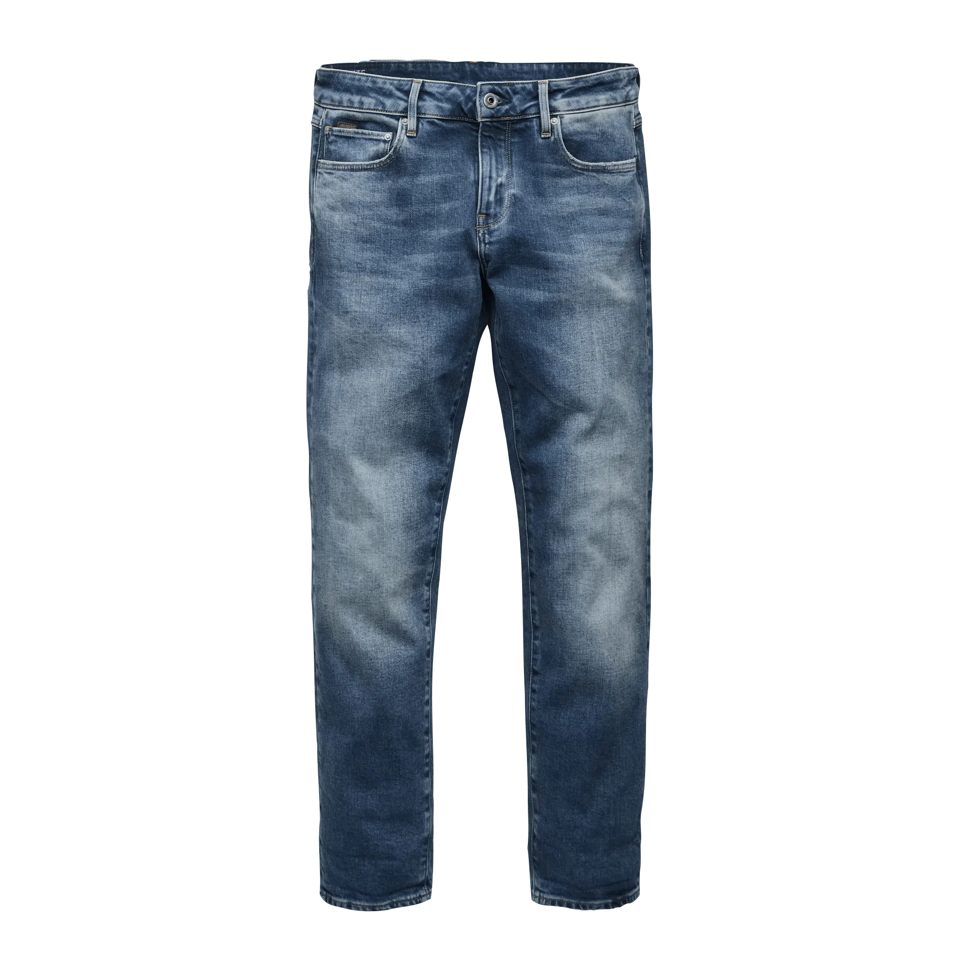 Denim de tono medio vivo con secciones muy desgastadas y marcas de uso auténticas.