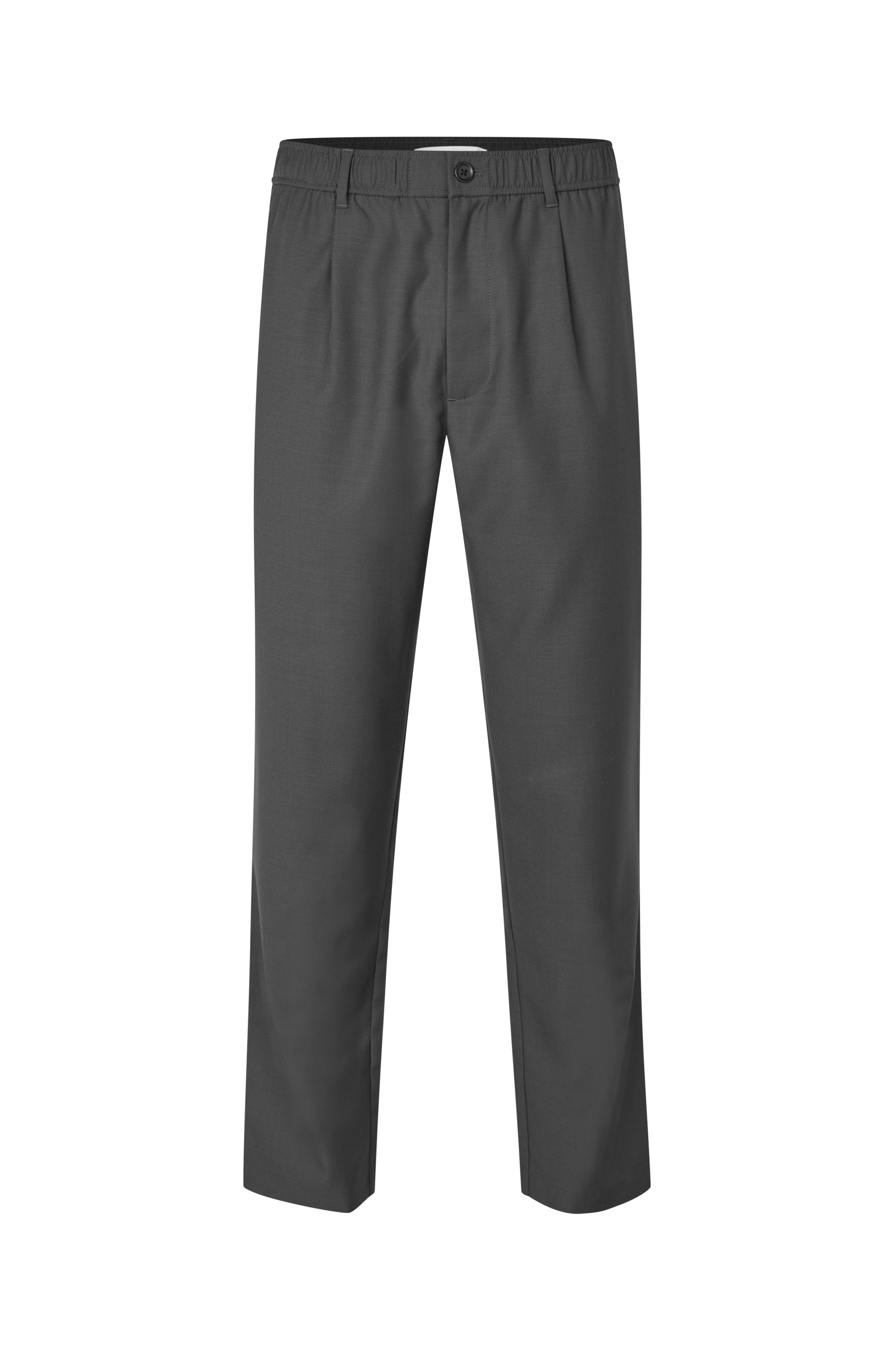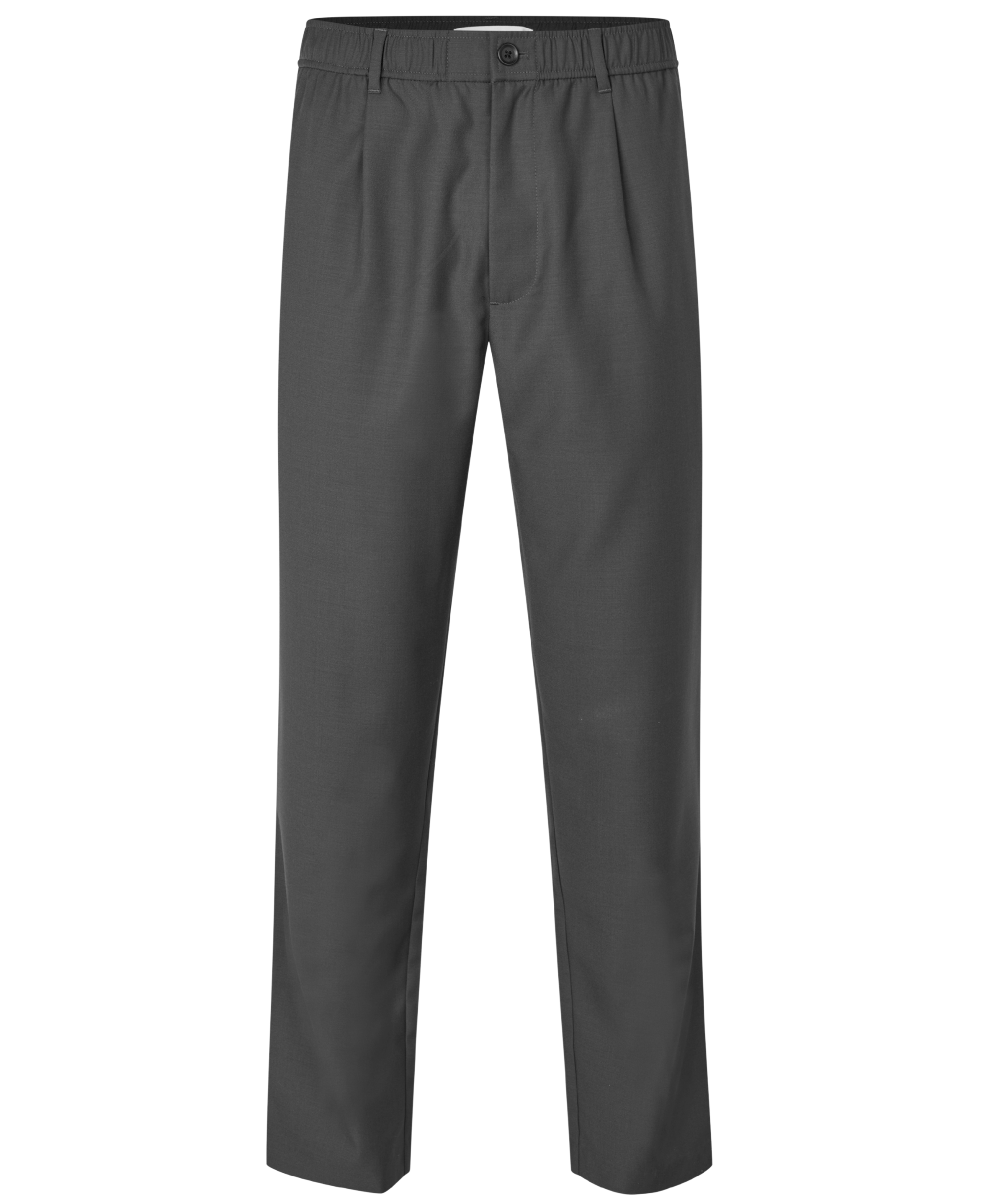 Pantalón de talle medio con ajuste regular y pierna recta. Presenta cintura elástica con botón, cierre de cremallera y cordón interior para un ajuste cómodo y versátil. Los pliegues frontales aportan un ligero volumen y una silueta limpia, mientras que los bolsillos laterales y traseros añaden funcionalidad. El tono Black Oyster ofrece una estética sobria y contemporánea, ideal tanto para el día a día como para ocasiones más formales.