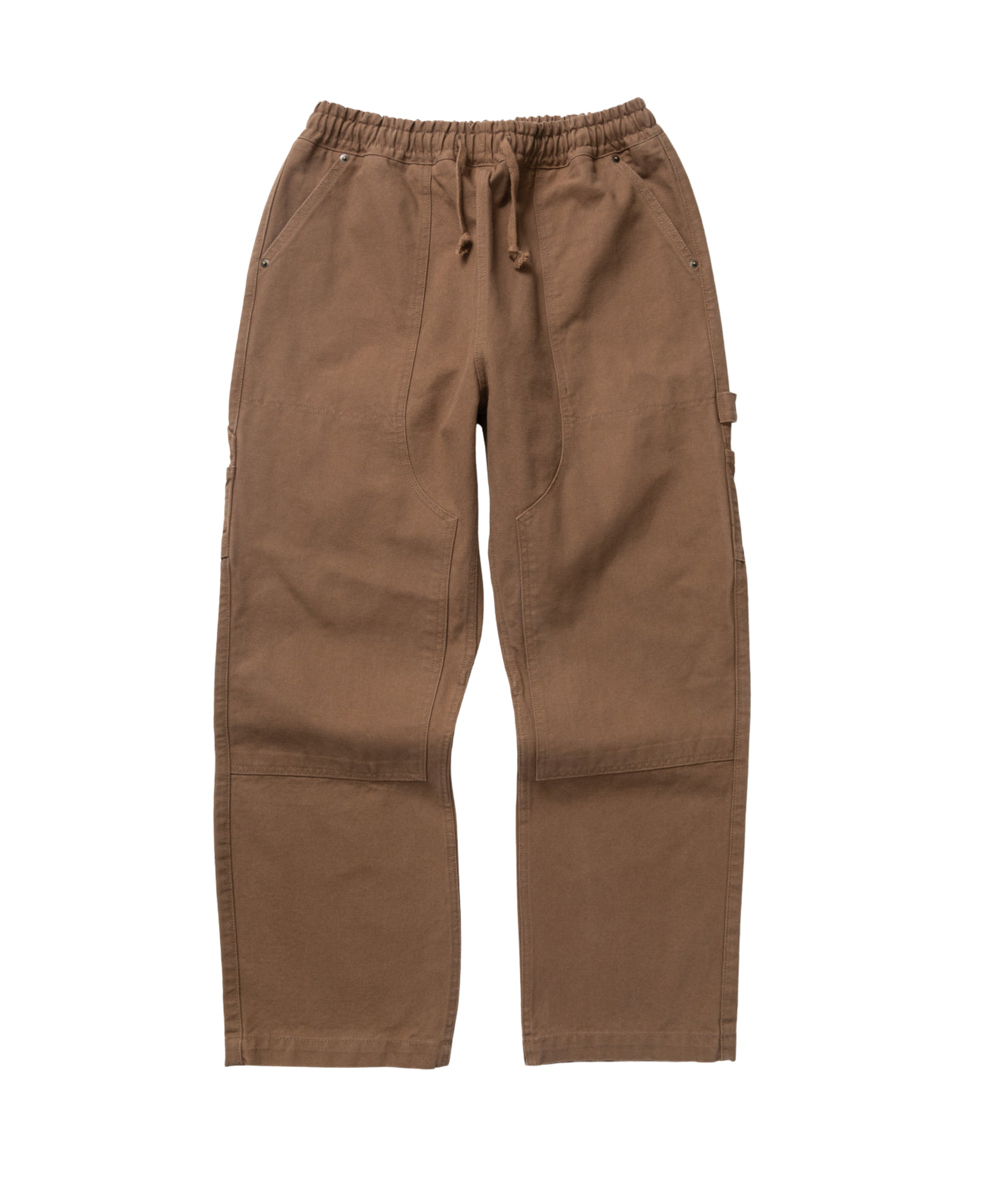 El diseño presenta una cintura ajustable con cordón interno para adaptar el ajuste, corte relajado con pernera recta, y varios elementos funcionales: bolsillos “fatigue” delanteros, bolsillos parche traseros, bucle porta-martillo o herramienta (“hammer loop”), y un panel reforzado en la entrepierna para una mayor durabilidad.