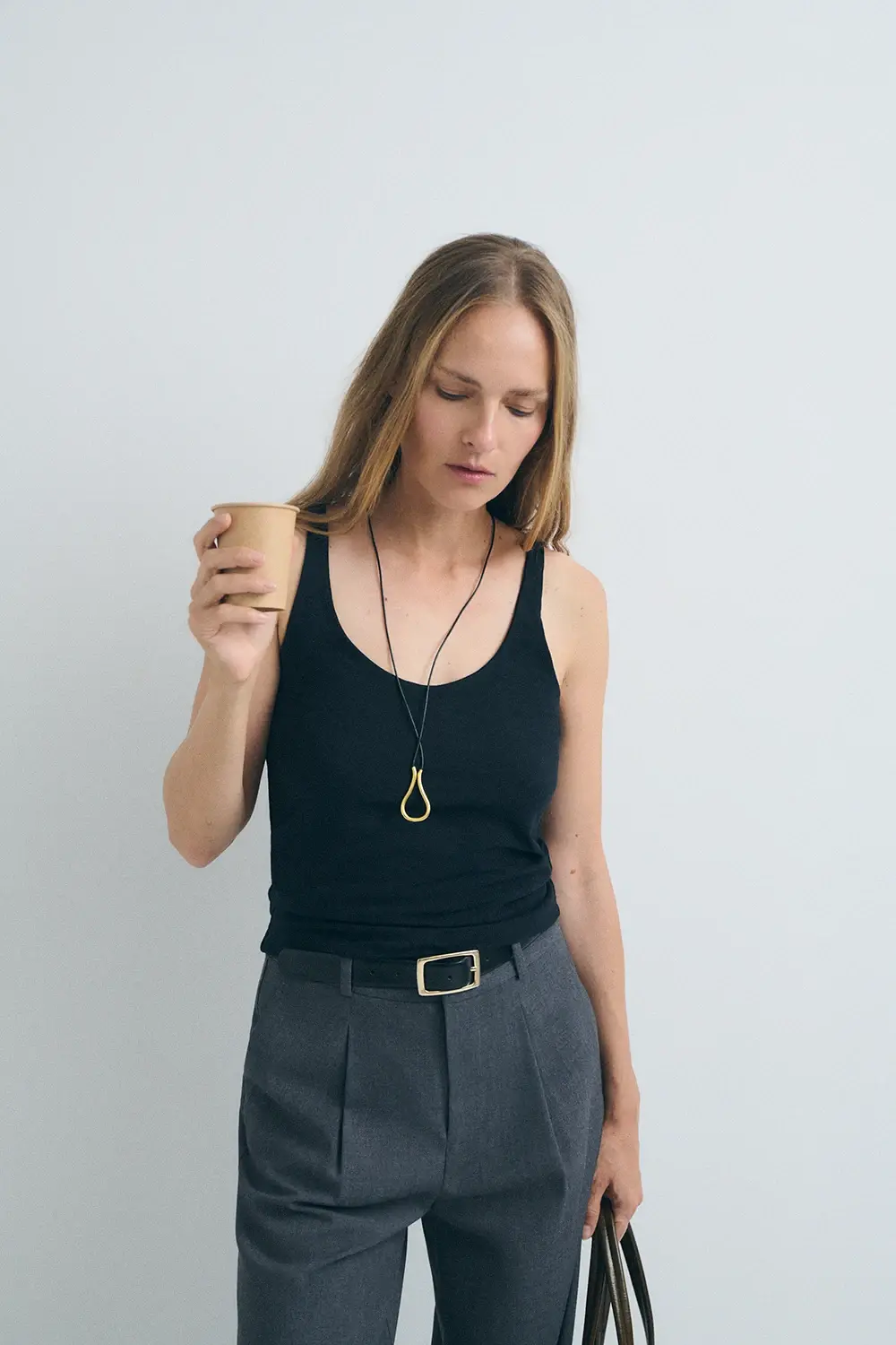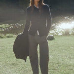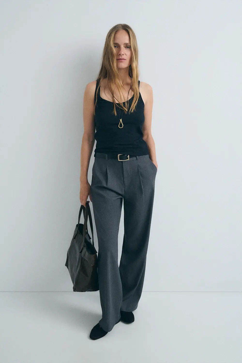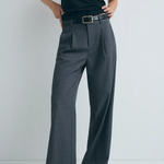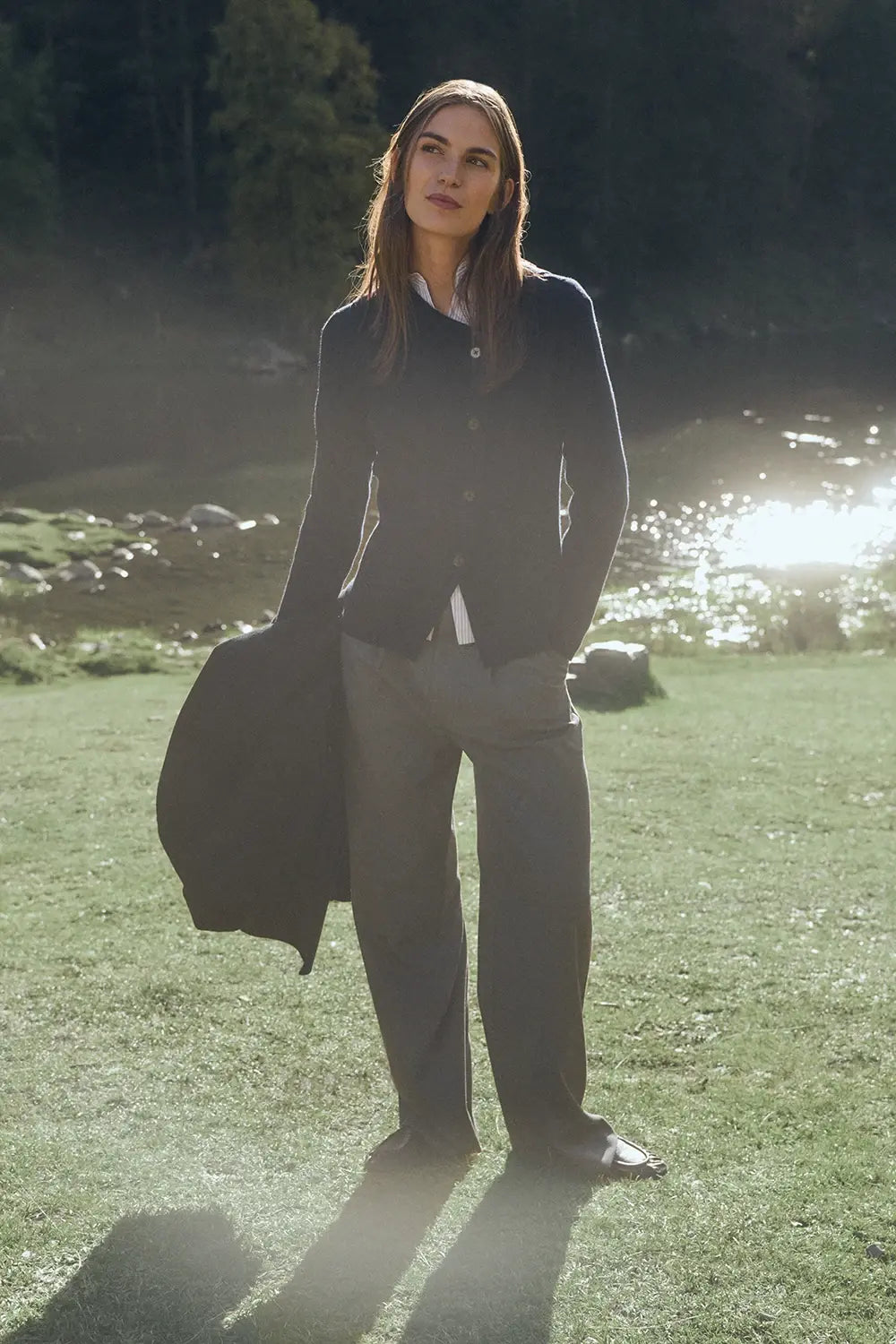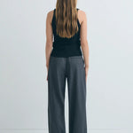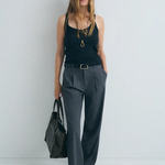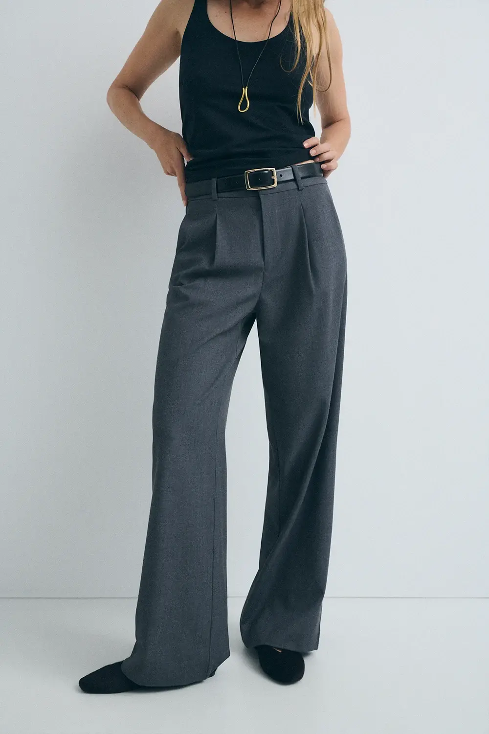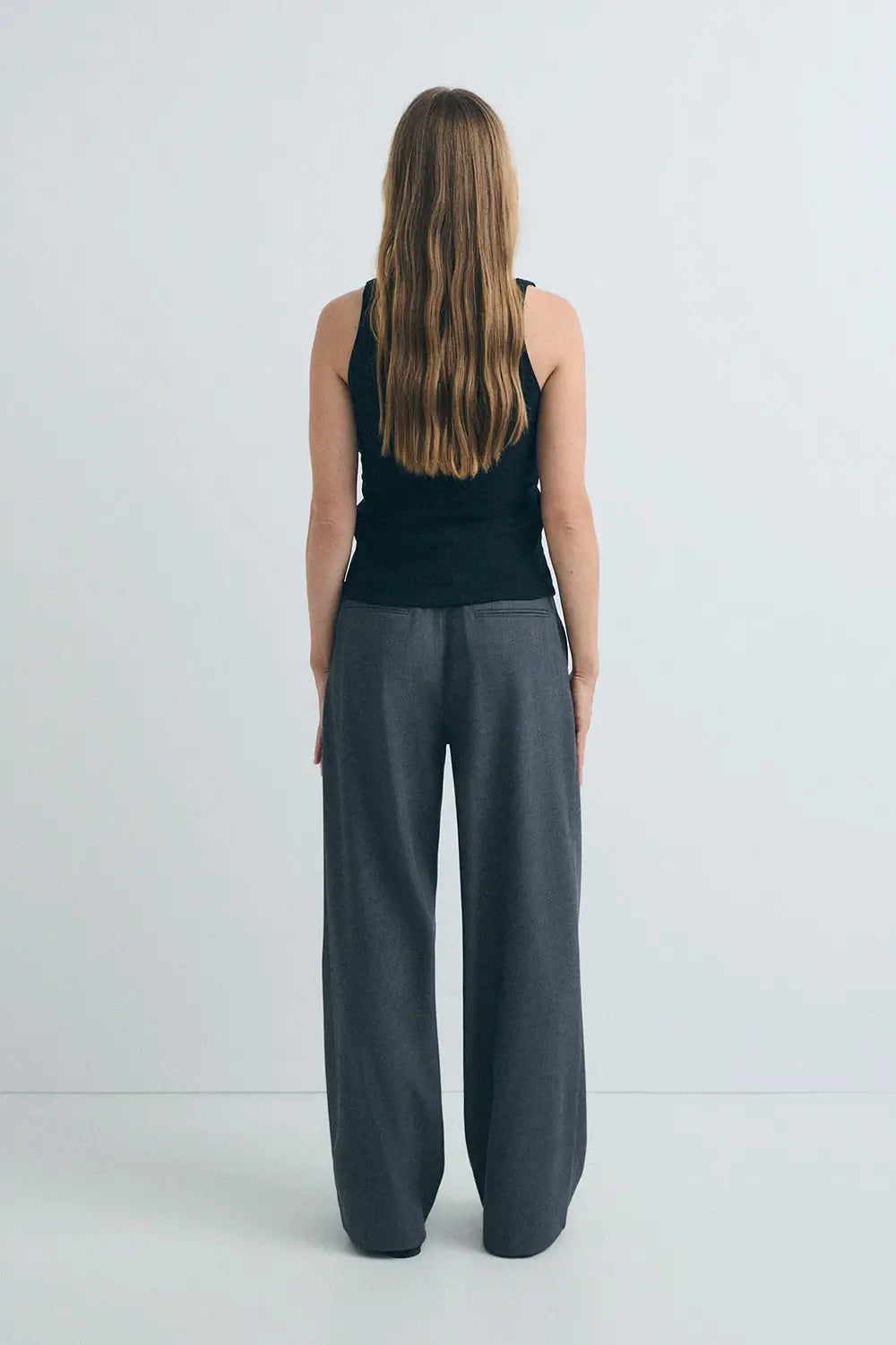El pantalón Clarck de eseOese en tono gris vigoré es una prenda de corte sastre refinado que combina elegancia con funcionalidad para el armario femenino. Confeccionado en una mezcla de tejidos de alta gama que incluye lana, viscosa y poliéster reciclado, presenta tiro medio con trabillas, pinzas delanteras, bolsillos diagonales laterales, bolsillo de vivo trasero, cierre con gancho metálico y cremallera. Su pierna ancha (flare) aporta movimiento y versatilidad. Largo aproximado en talla S: 105 cm. Esta prenda incorpora materiales y procesos más sostenibles bajo el compromiso “We Care”.