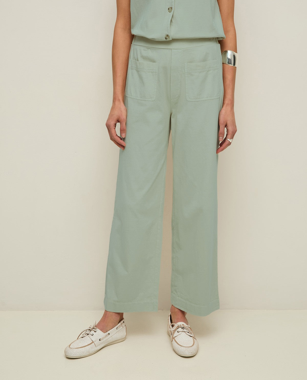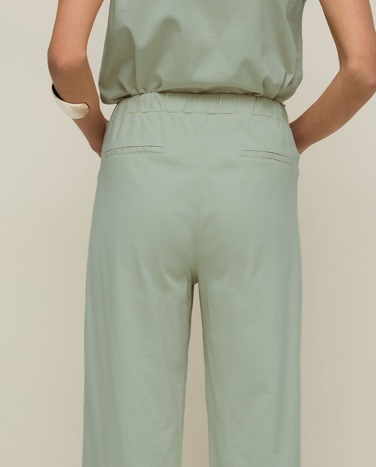 Pantalón de algodón orgánico. Tiro medio y cropped fit. Cinturilla elástica, sin cierre. Con bolsillos de plastrón en la parte delantera y dos de vivo detrás. Diseño de color verde aguamarina. Longitud interior de la pierna: 71 cm (talla S).