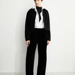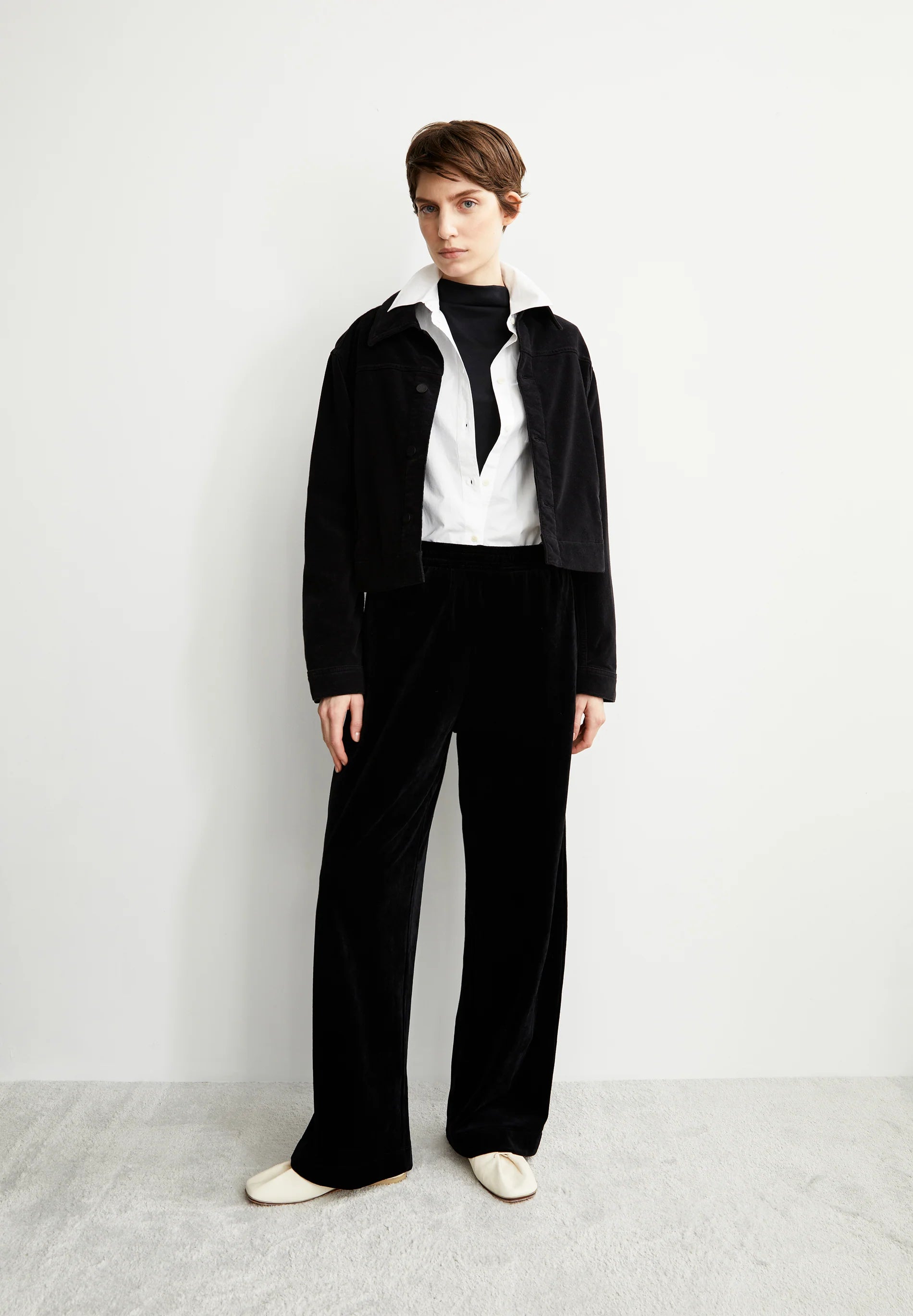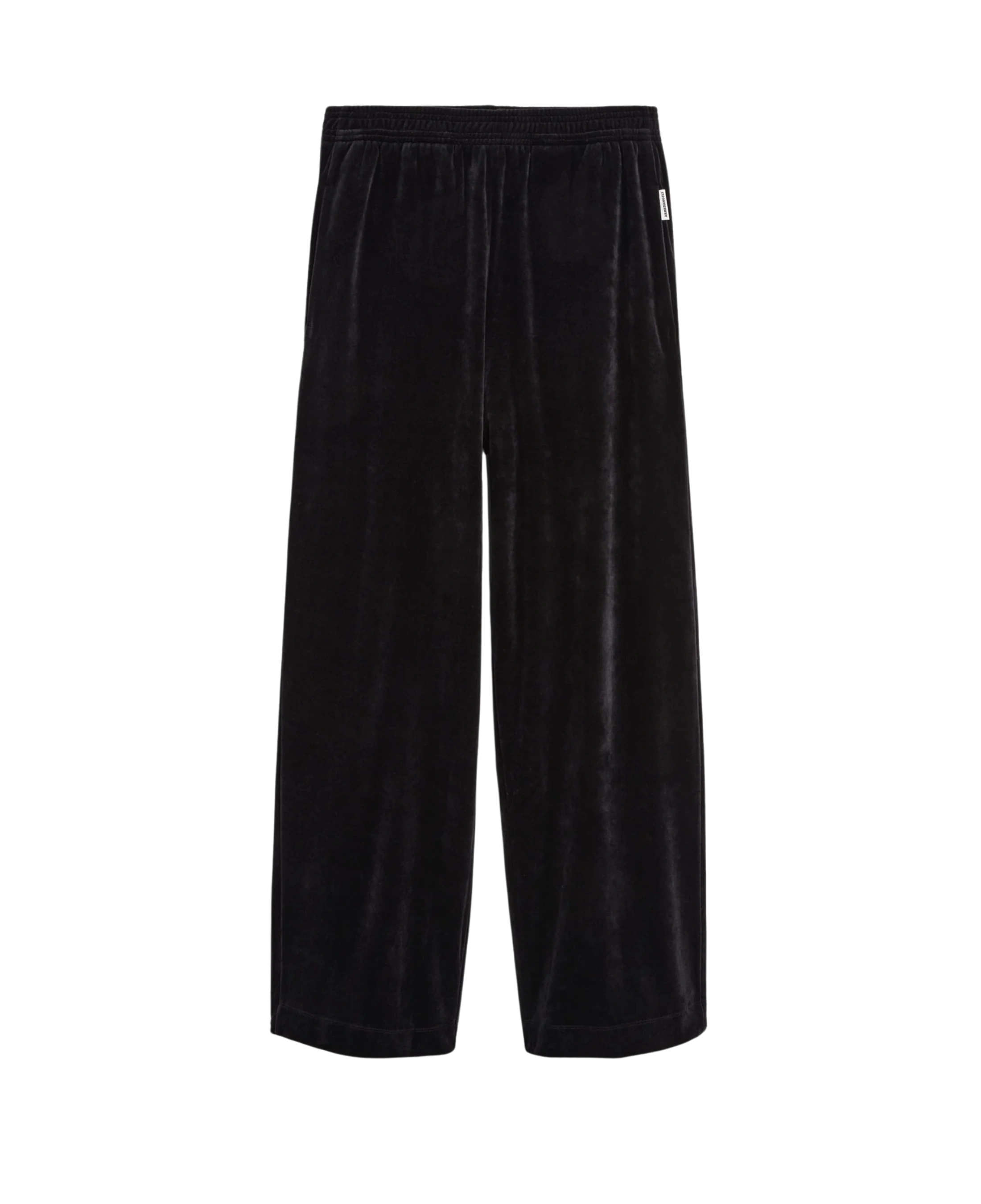 El pantalón Vatinaa Velvet, en color Black, destaca por su tejido de punto de peso medio con acabado aterciopelado. Confeccionado en una mezcla de 67 % algodón orgánico y 33 % modal TENCEL™, ofrece una suavidad excepcional y una caída fluida. Presenta cintura alta y corte amplio (loose fit), combinando comodidad y estilo con un enfoque sostenible.