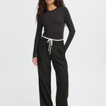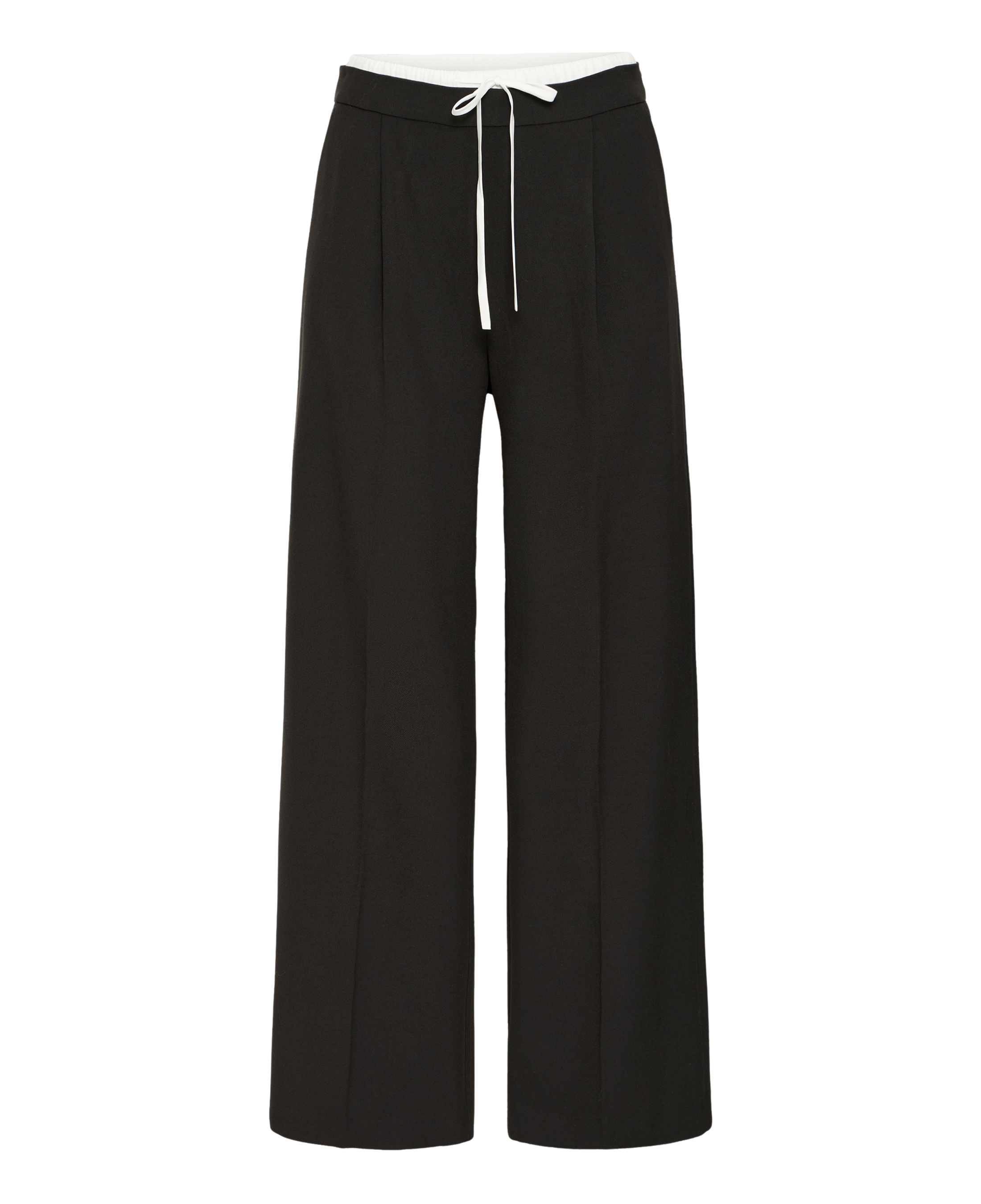 Pantalones anchos de corte holgado con una cómoda cintura elástica y cordón ajustable. Estos versátiles pantalones largos presentan detalles de pliegues a medida, lo que los hace adecuados tanto para ocasiones informales como elegantes.