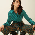 Materiales y cuidado: 64 % poliéster, 34 % rayón, 2 % elastano. Lavar del revés a 30 ° en programa delicado, no usar lejía, planchar a baja temperatura, apto para limpieza en seco. No utilizar secadora. El modelo mide 1,77 m y lleva talla 36.