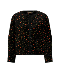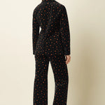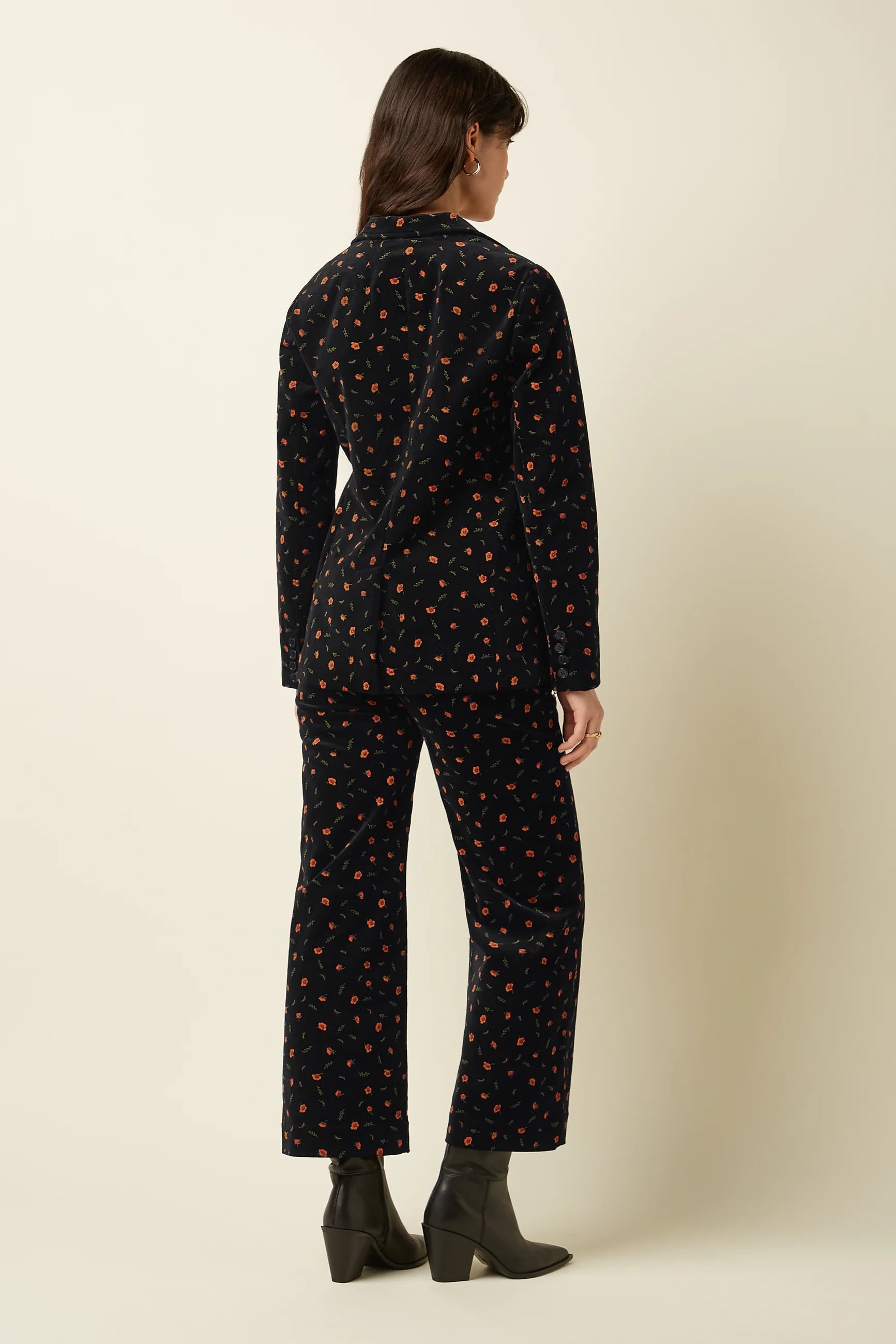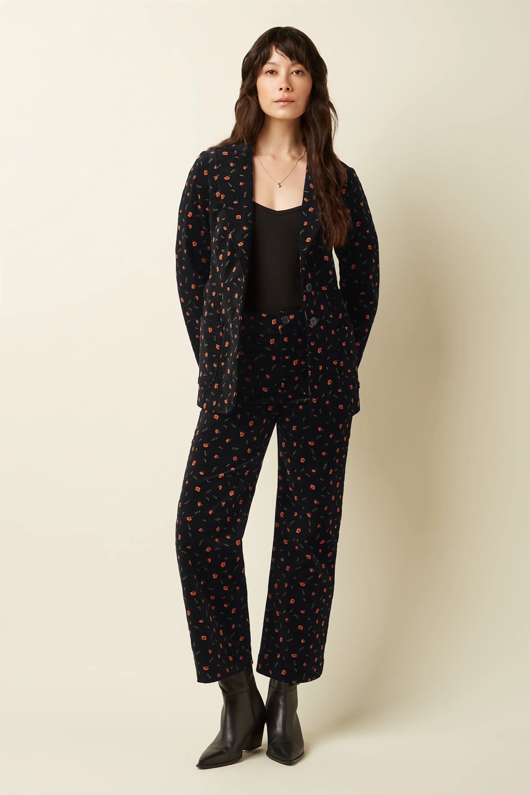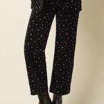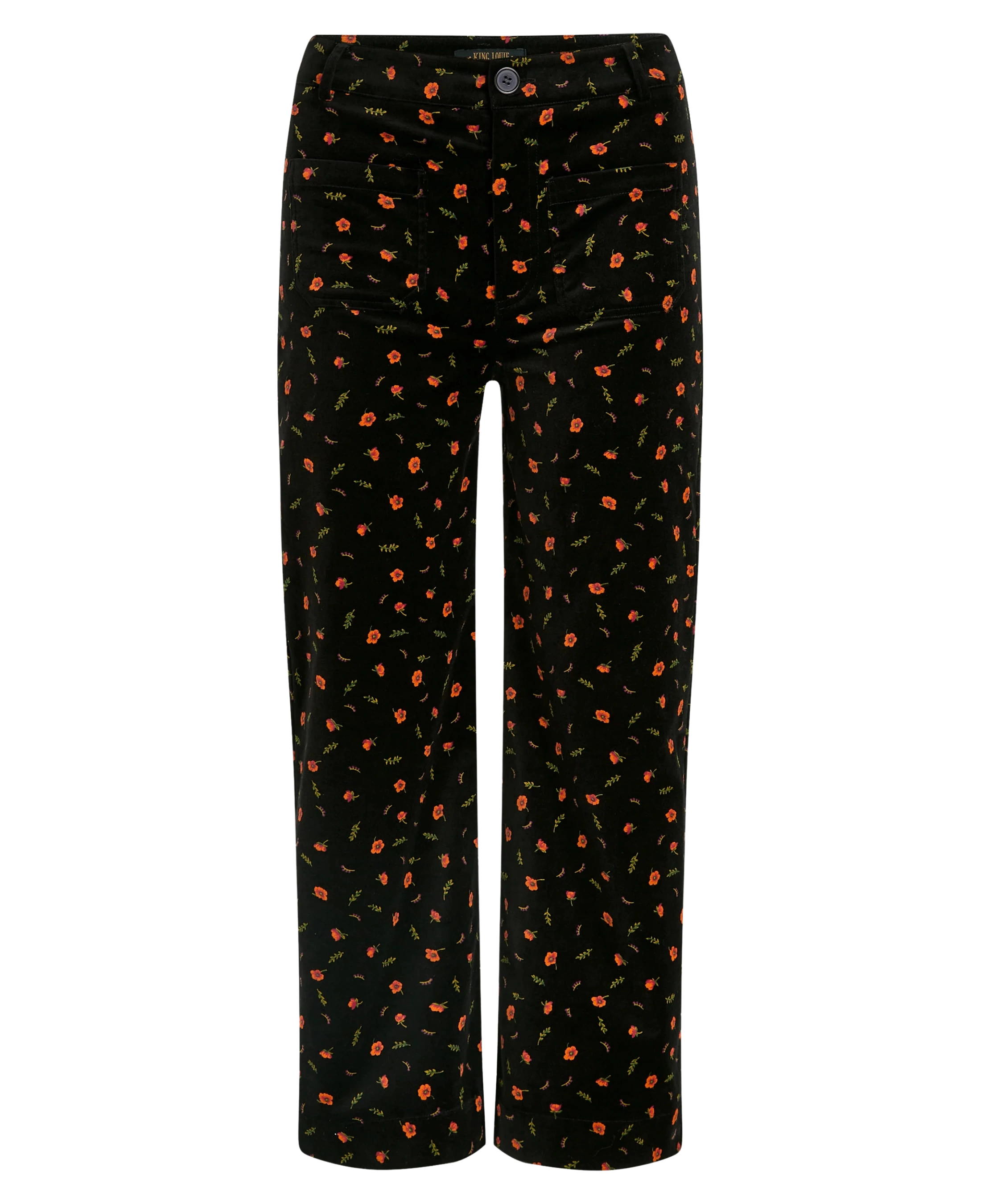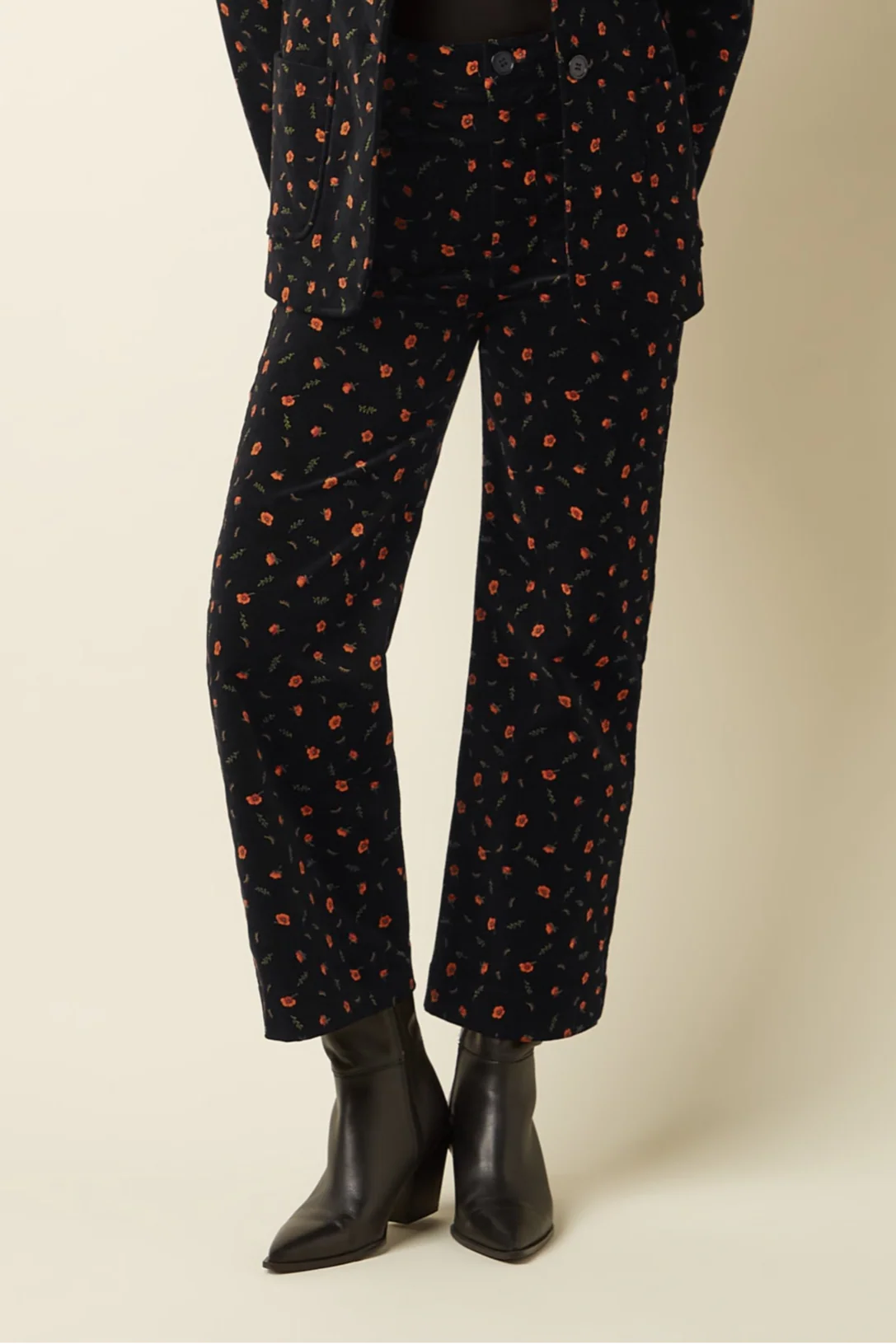 Estos pantalones exhiben una silueta de cintura alta con pernera ancha inspirada en estilos vintage. Incluyen cinturilla con trabillas, cierre frontal de botón y cremallera, y están confeccionados en tejido de algodón con un ligero toque de elastano para mayor comodidad. Presentan un estampado floral sobre fondo negro que aporta carácter sin perder versatilidad.