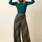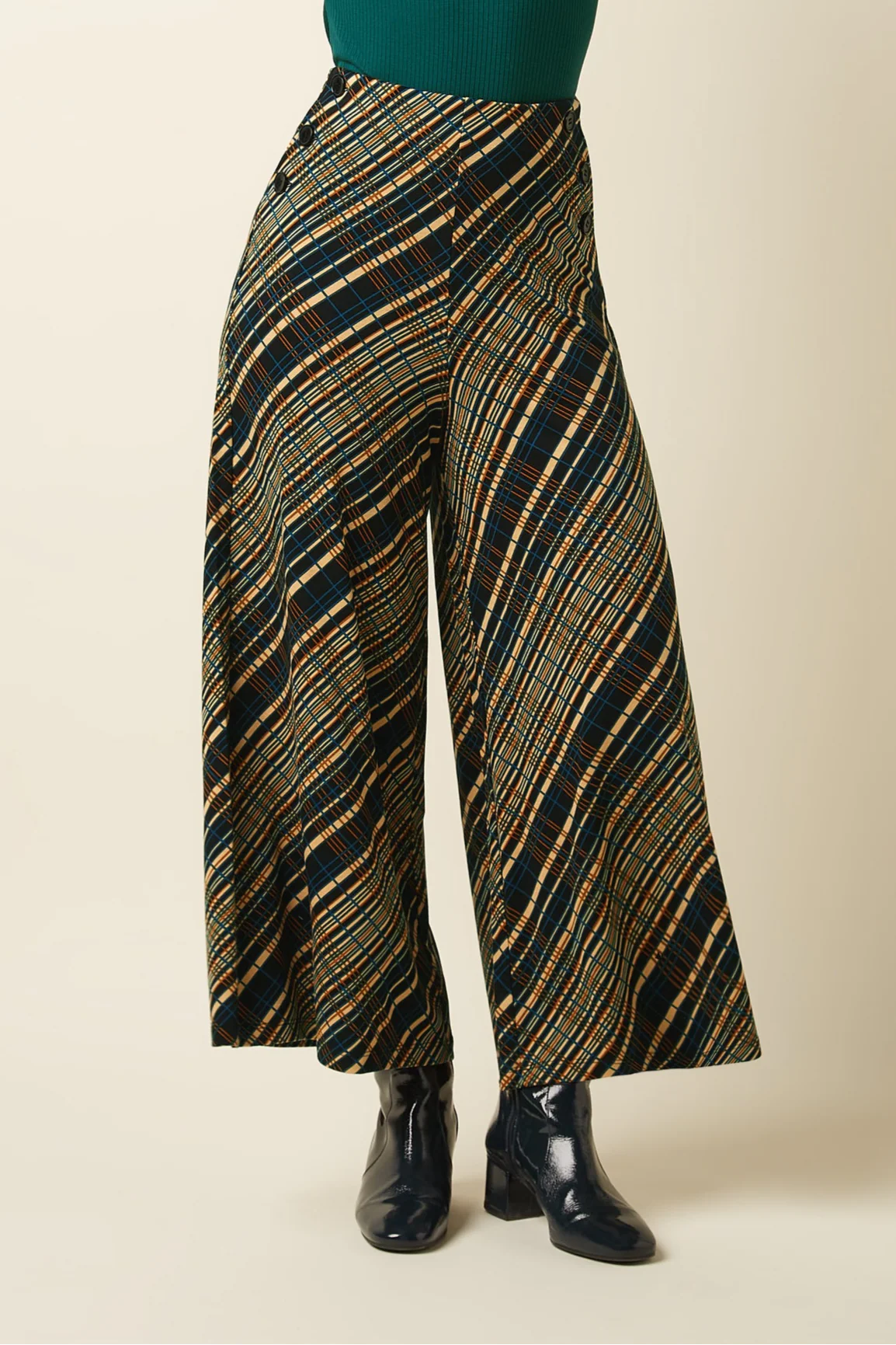Culotte de talle alto confeccionada en jersey de viscosa con elasticidad, que combina fluidez, comodidad y presencia visual gracias a su estampado gráfico. Presenta pierna amplia en longitud culotte, bolsillos en sesgo y botones decorativos en la parte frontal que acentúan el diseño.