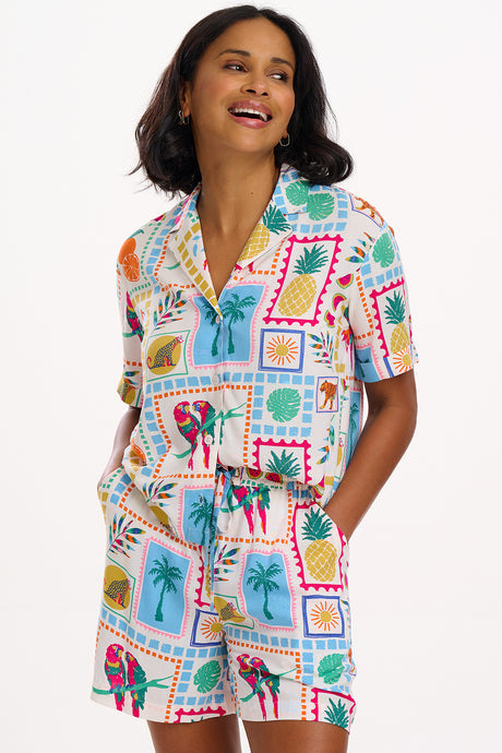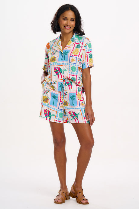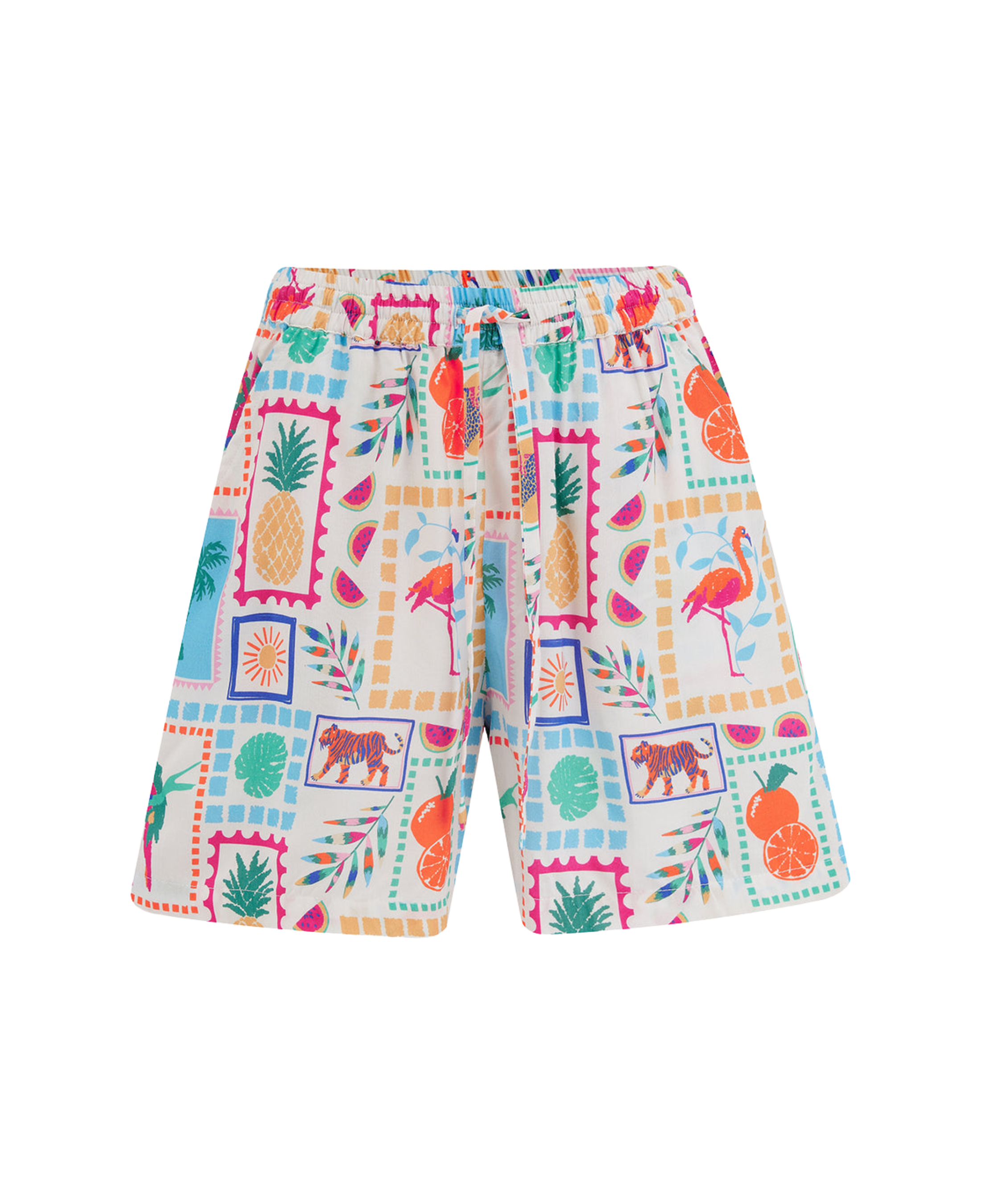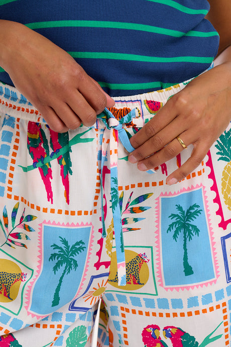 El pantalón corto Patty es una prenda imprescindible para el verano, con cintura elástica y un práctico cinturón con cordón para mayor comodidad. Destaca con el último estampado Jungle Tile, que muestra un colorido collage tropical de fauna, frutas y plantas sobre una base de color blanco roto