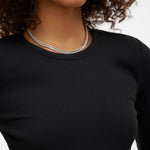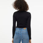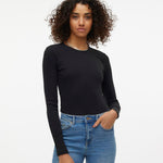 Este top corto de manga larga es una prenda básica imprescindible que combina comodidad y estilo ajustado. Su cuello redondo y los puños elásticos aportan un toque funcional y moderno, mientras que el forro de algodón en punto garantiza una sensación suave al contacto con la piel. Ideal para complementar un conjunto casual con una chaqueta ligera, jeans relajados y botas robustas para un look relajado y fresco en el día a día.