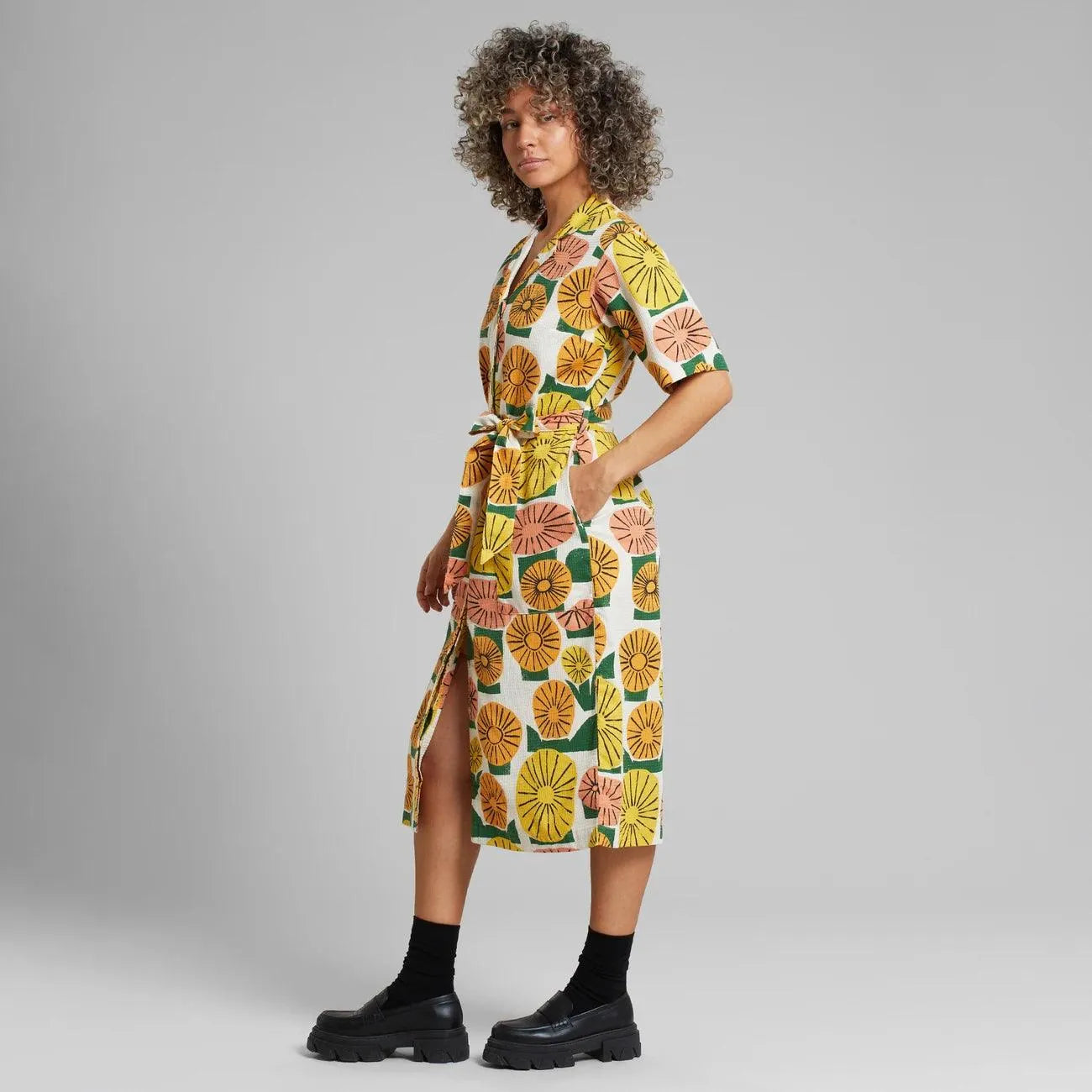 Vestido camisero de manga corta con cuello resortado. Largo medio con cinturón en la cintura y botones ocultos. Canesú en la espalda y ligeramente redondeado en el bajo, y con dos bolsillos de parche.