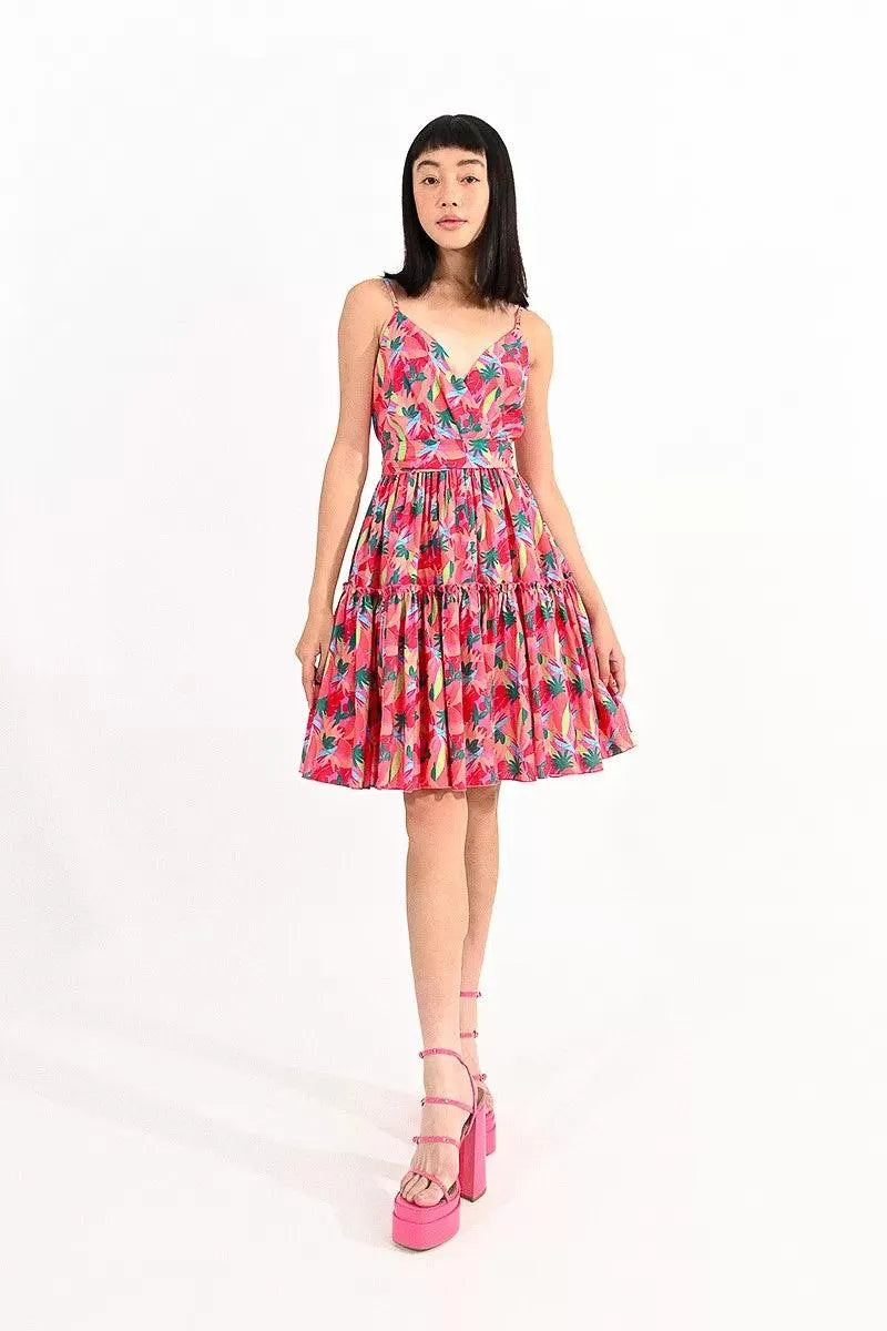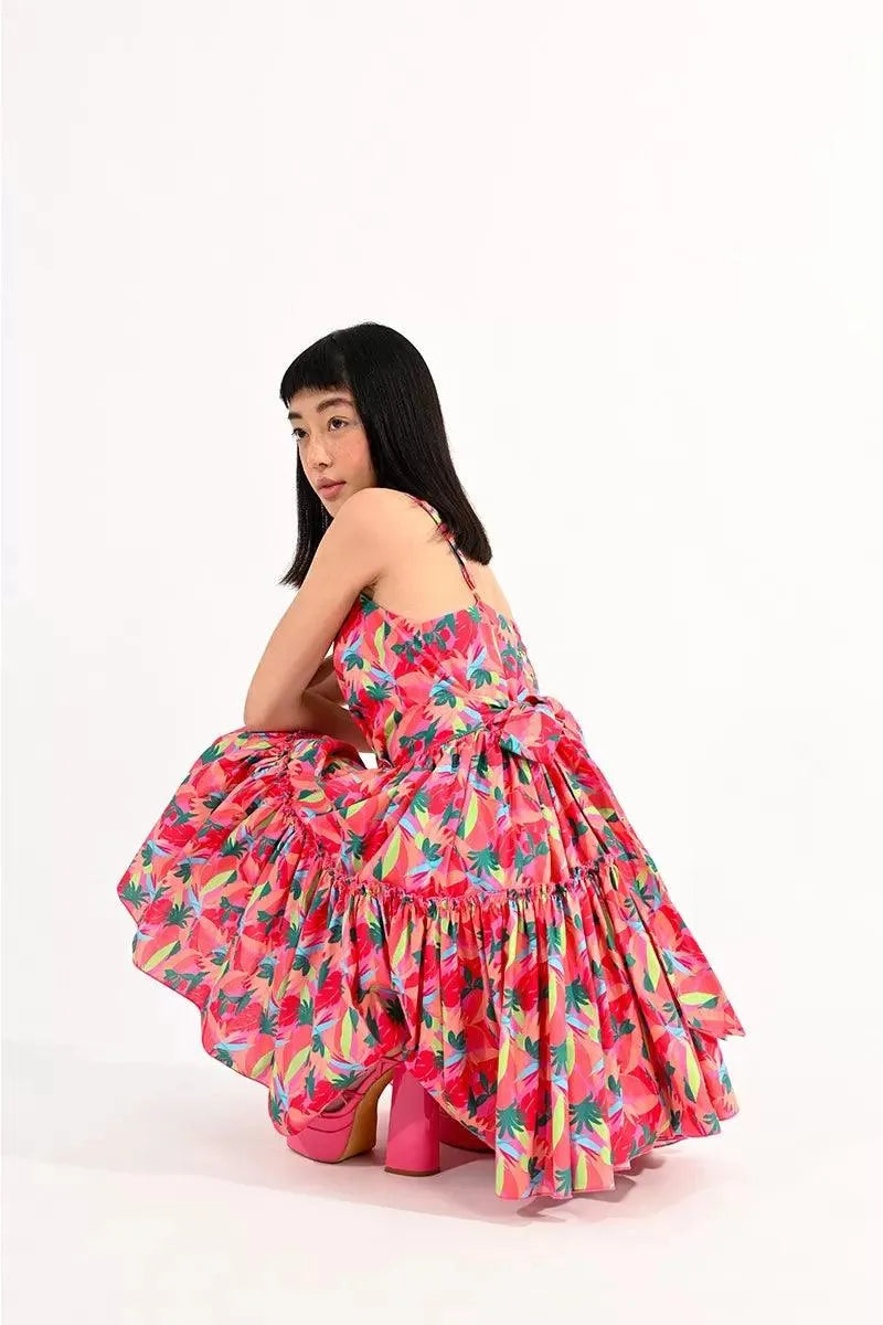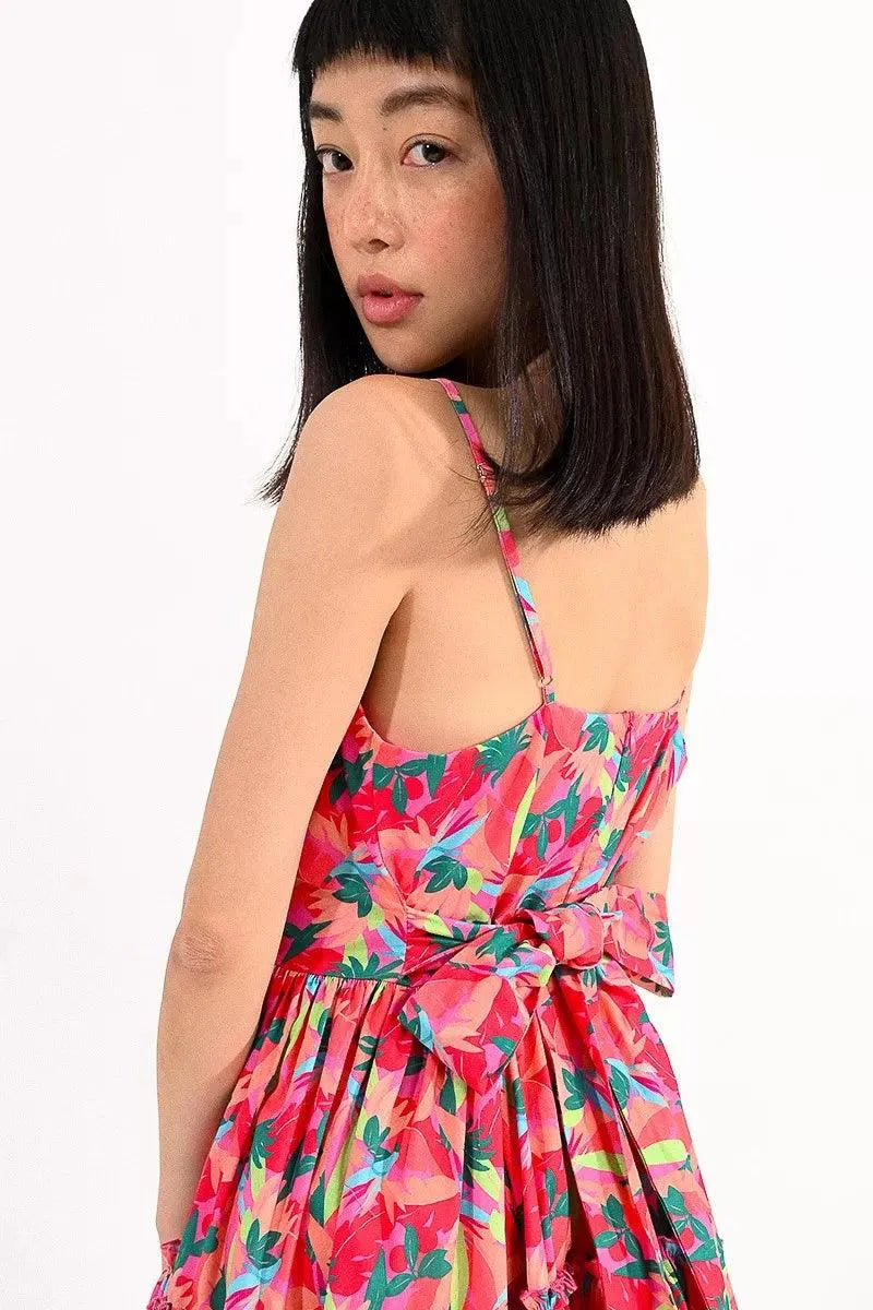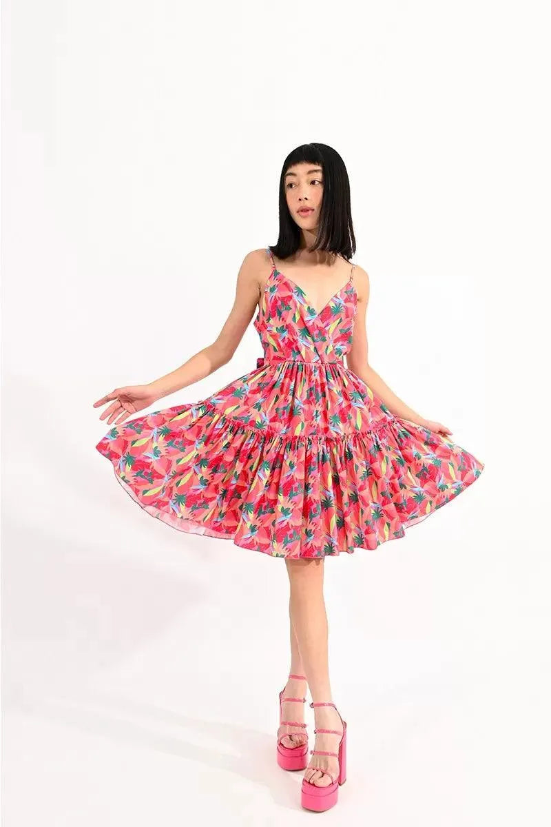 Vestido cruzado, de tirantes finos ajustables. Modelo con volantes, lazada grande el la parte trasera y estampado tropical.