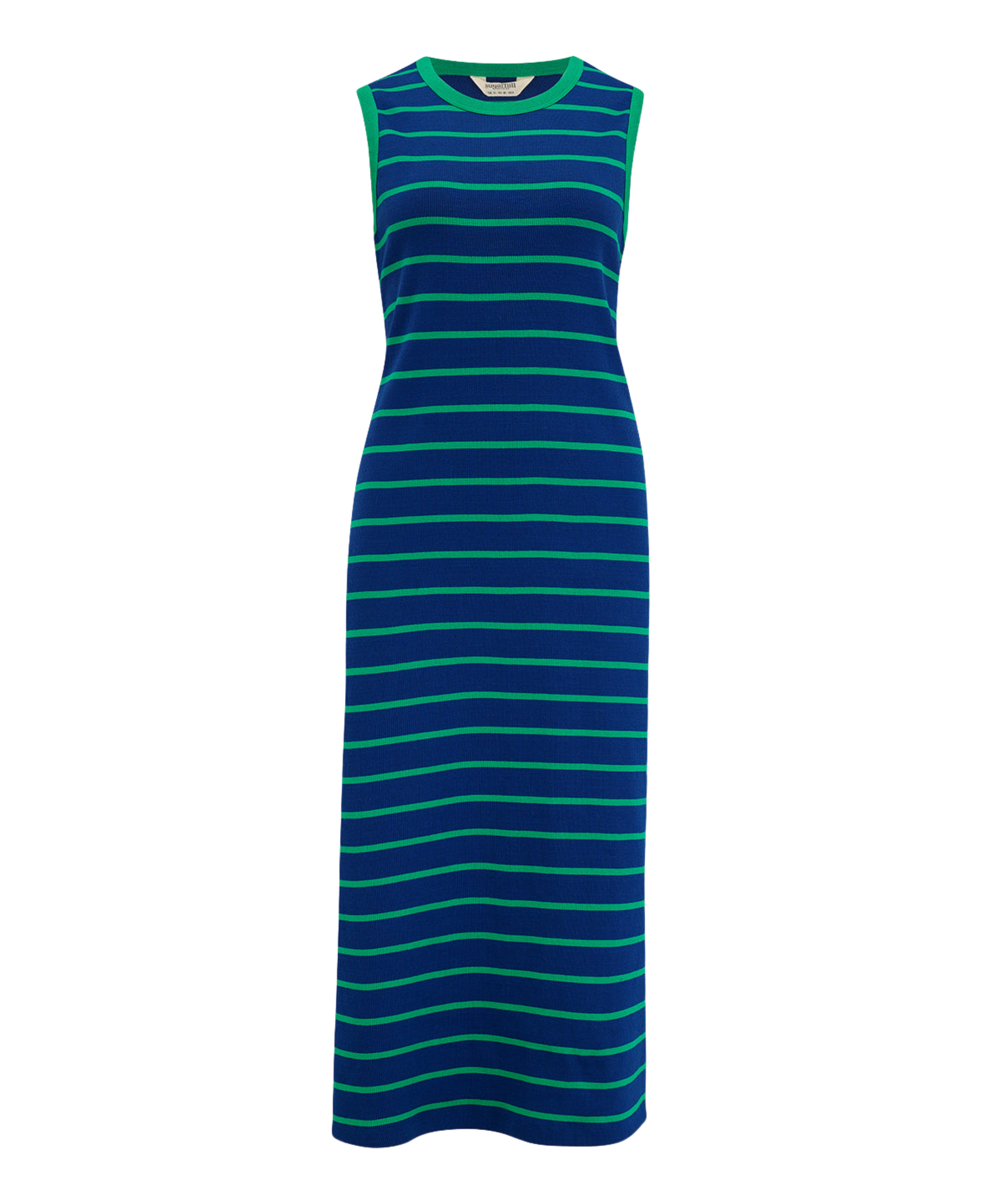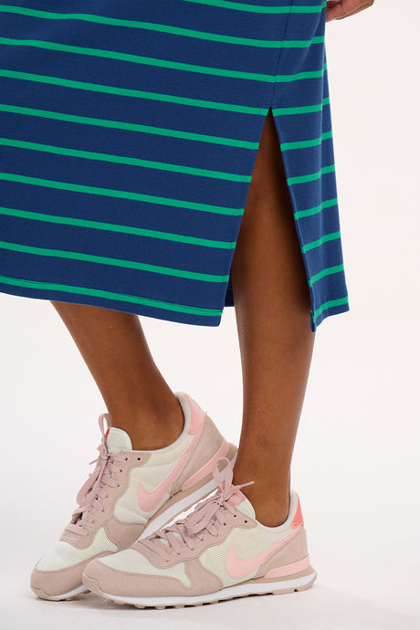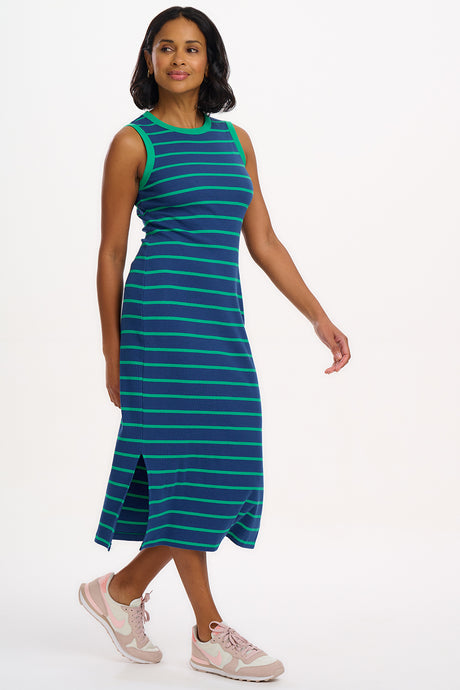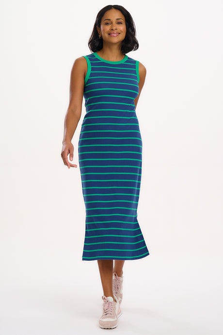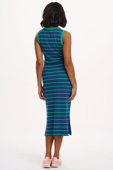 Este vestido de punto presenta un corte entallado confeccionado en un punto de canalé grueso, con escote redondeado y sisas enmarcadas con canalé en contraste. Presenta delicadas rayas verdes sobre un fondo azul intenso.