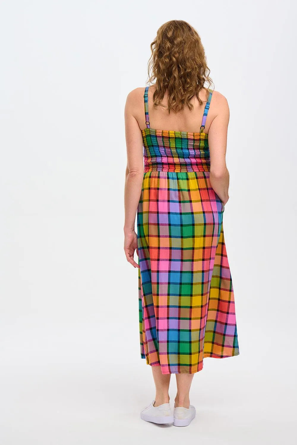 Nos encanta este vestido tan especial, con nuestro vibrante estampado veraniego de cuadros arco iris en un femenino vestido de verano con el busto fruncido. El vestido Denali tiene largo midi, falda con vuelo y bolsillos. El modelo Summer Rainbow Check presenta un vibrante estampado multicolor de cuadros arco iris de gran tamaño con una base negra para un estilo transtemporal muy ponible.