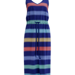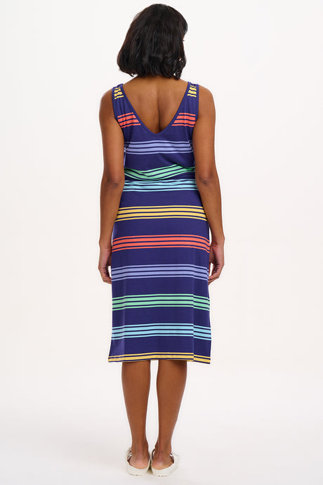 Este alegre vestido estampado está confeccionado en algodón orgánico transpirable con escote en pico en la parte delantera y trasera, falda larga y cintura con cordón para un ajuste favorecedor. Presenta bandas anchas de color mostaza, coral, verde menta y azul bebé sobre una base azul marino.