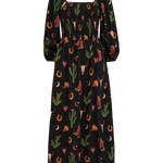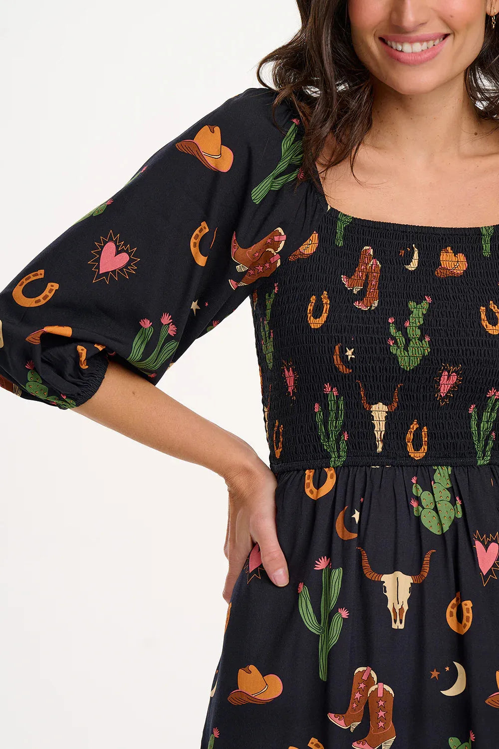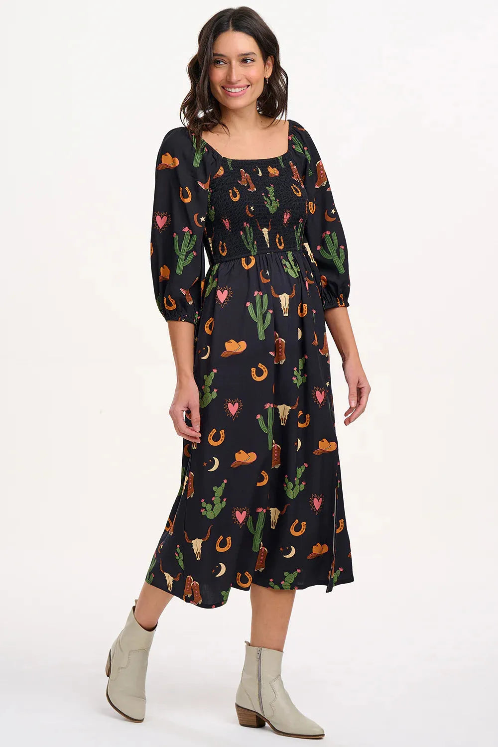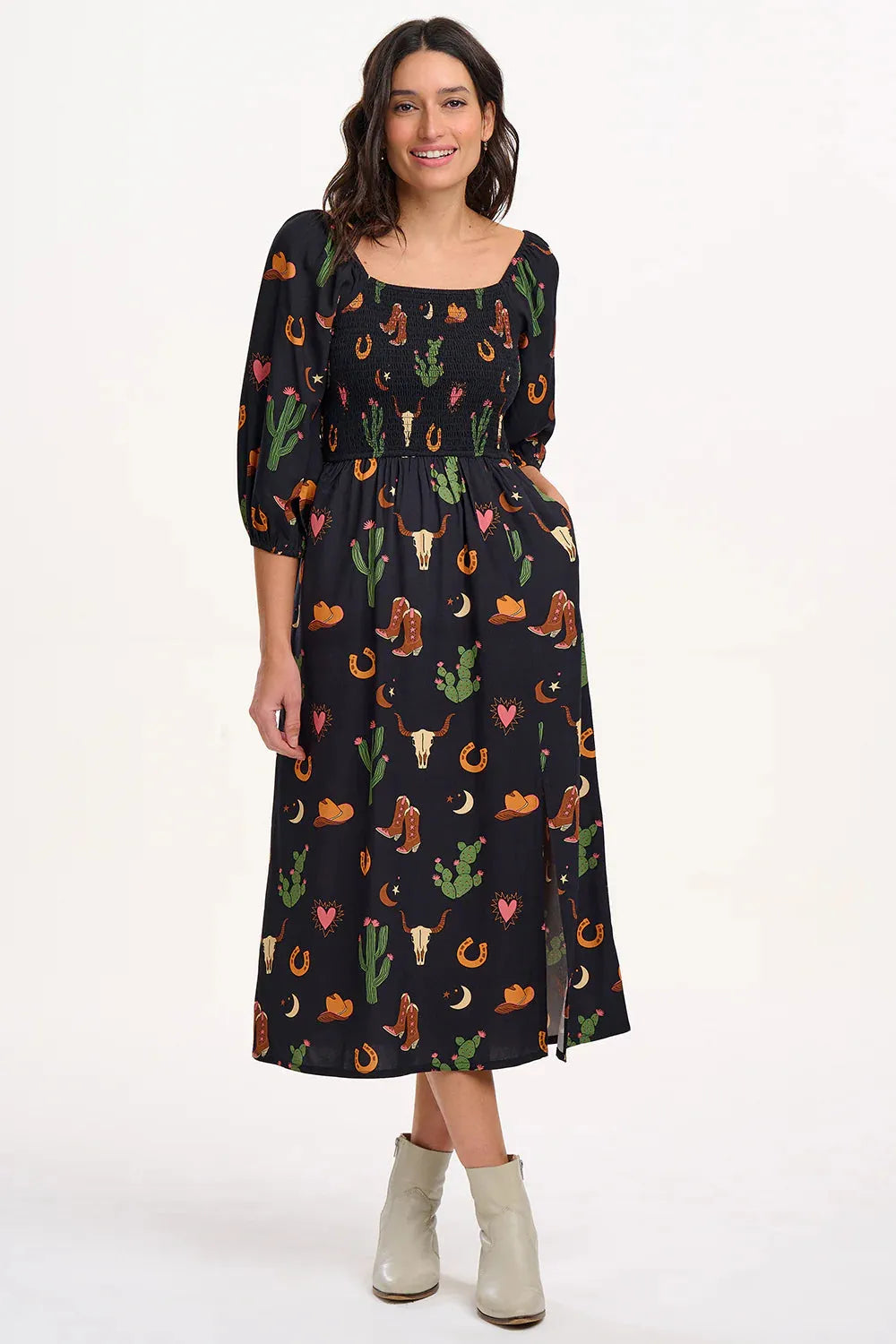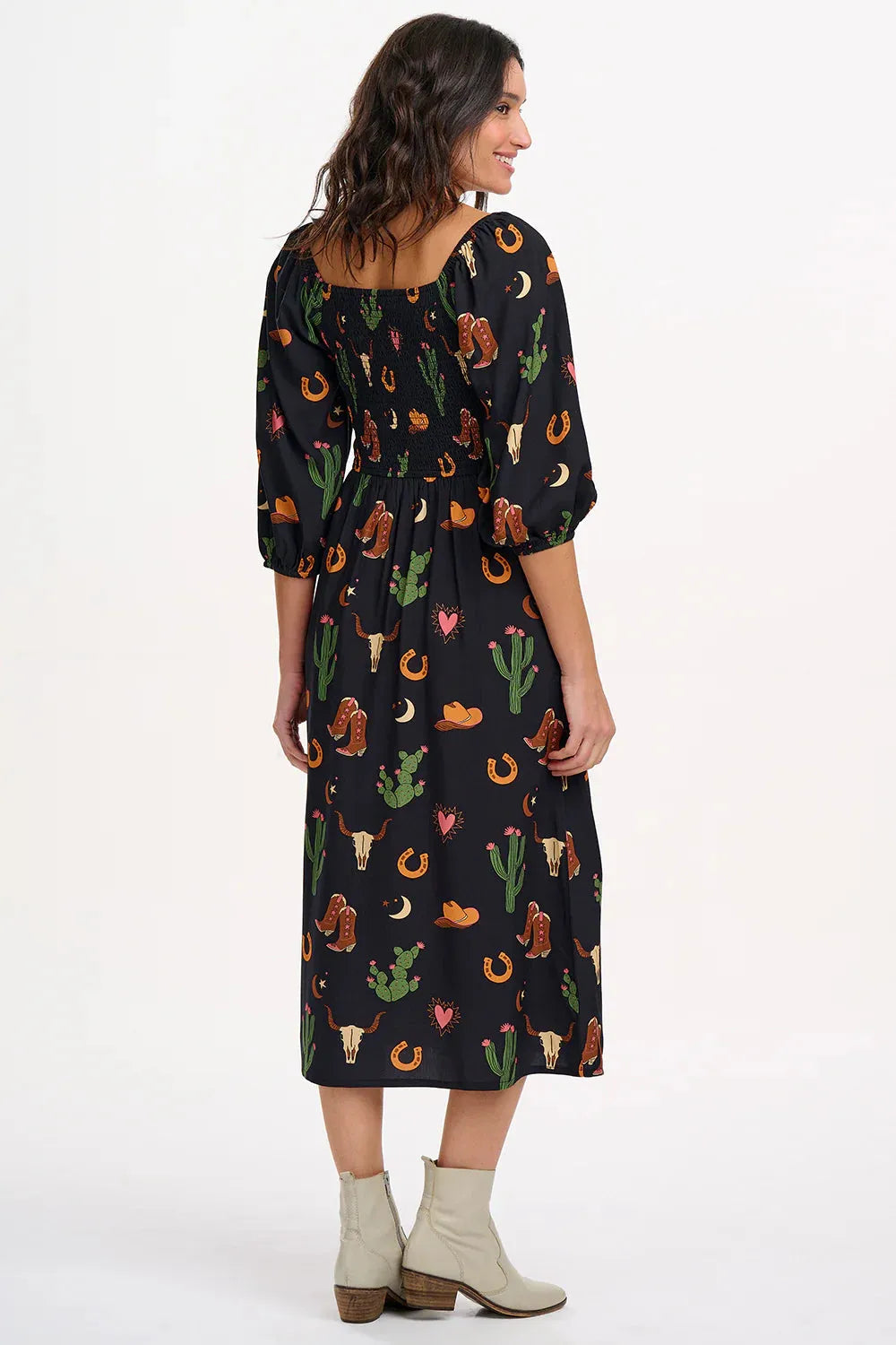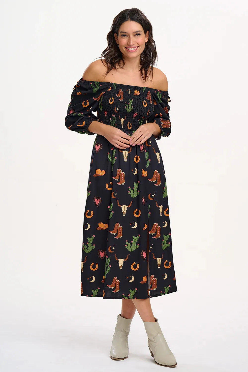 Con un hombro elástico y una manga blusón con puño, el modelo Zinnia tiene un corpiño completamente ceñido y una falda midi con una abertura. Con nuestro nuevo estampado Cowgirl de cactus, corazones, botas de vaquero y herraduras sobre una base negra clásica. Se puede llevar con o sin hombros.