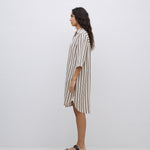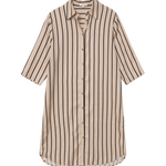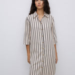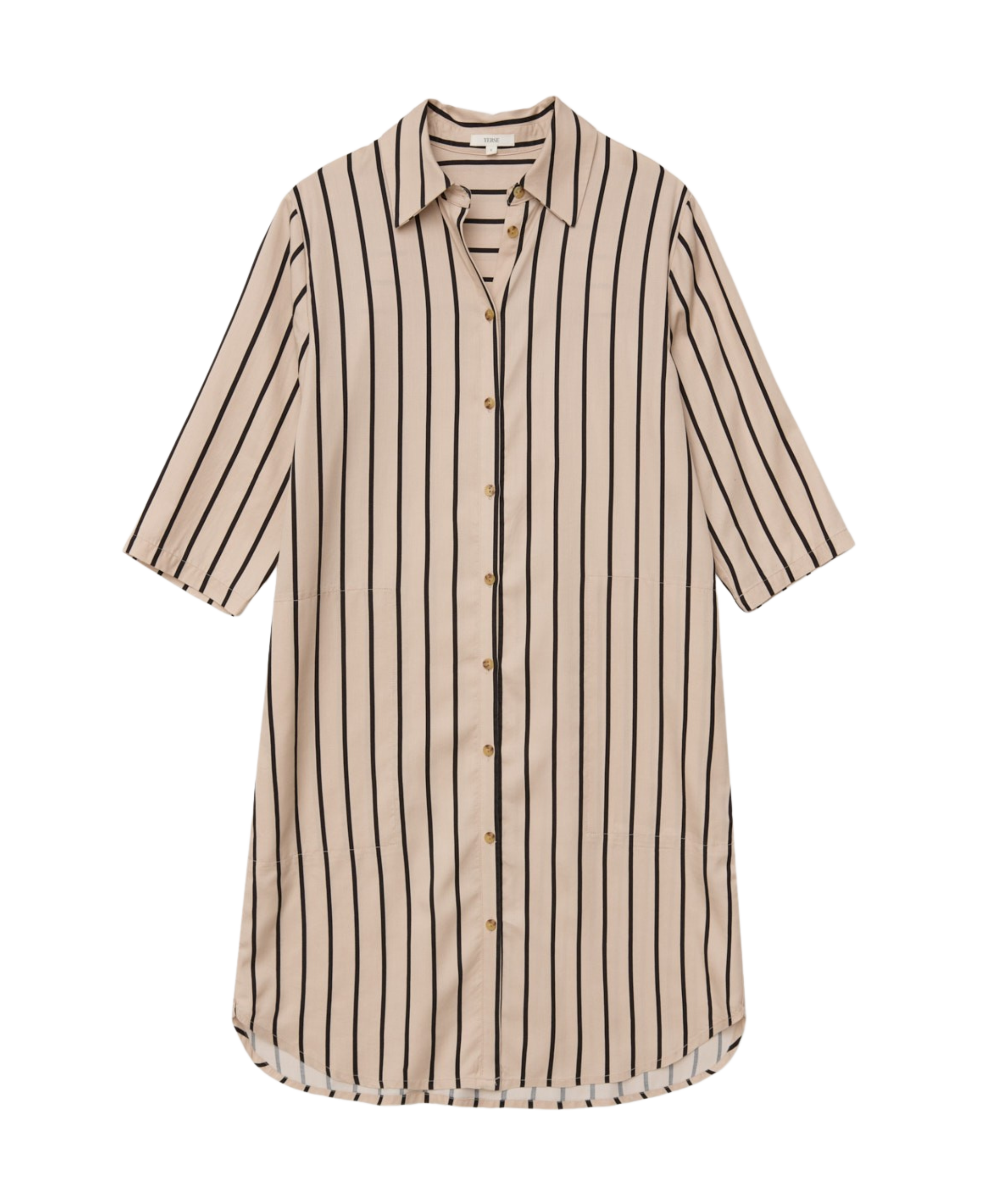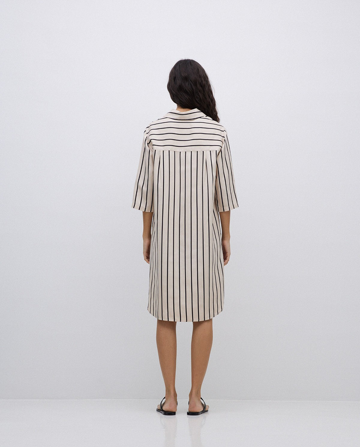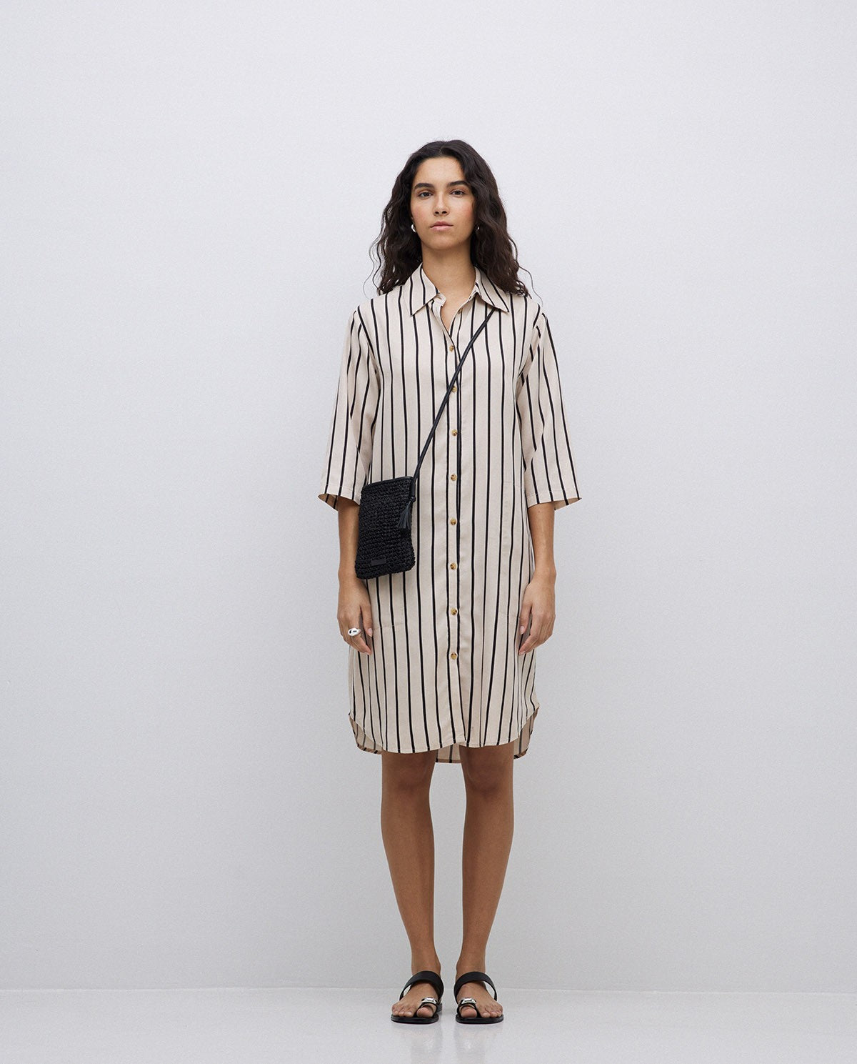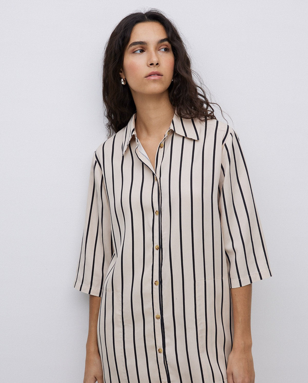 Vestido tejido 100% lyocell. Estampado de rayas. Diseño recto. Cuello camisero. Manga tres cuartos. Cierre con botones efecto carey. Dos bolsillos laterales.