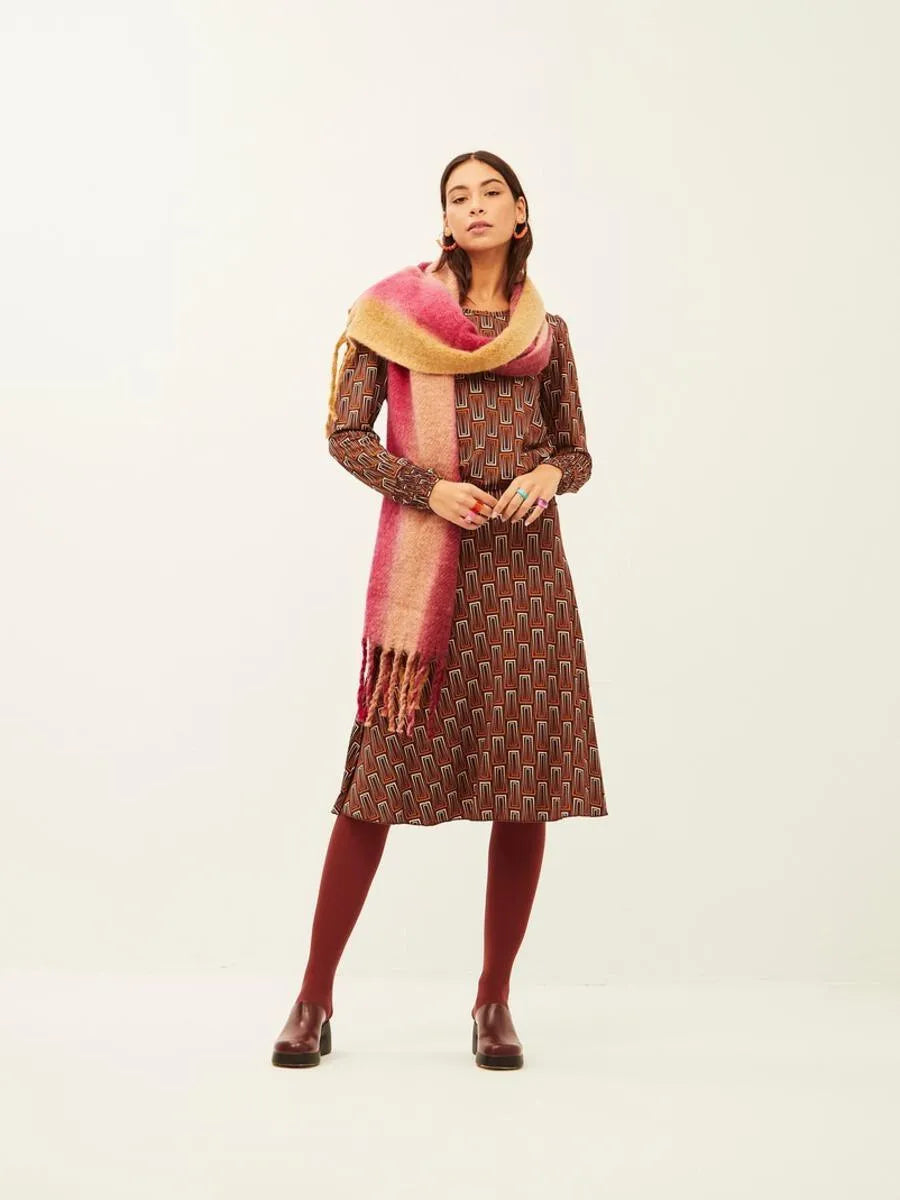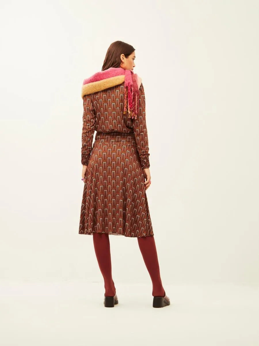Falda Midi en estampado Brown Geometric Lines. Corte midi, por debajo de la rodilla. Cintura elástica con cordón ajustable del mismo tejido.