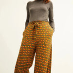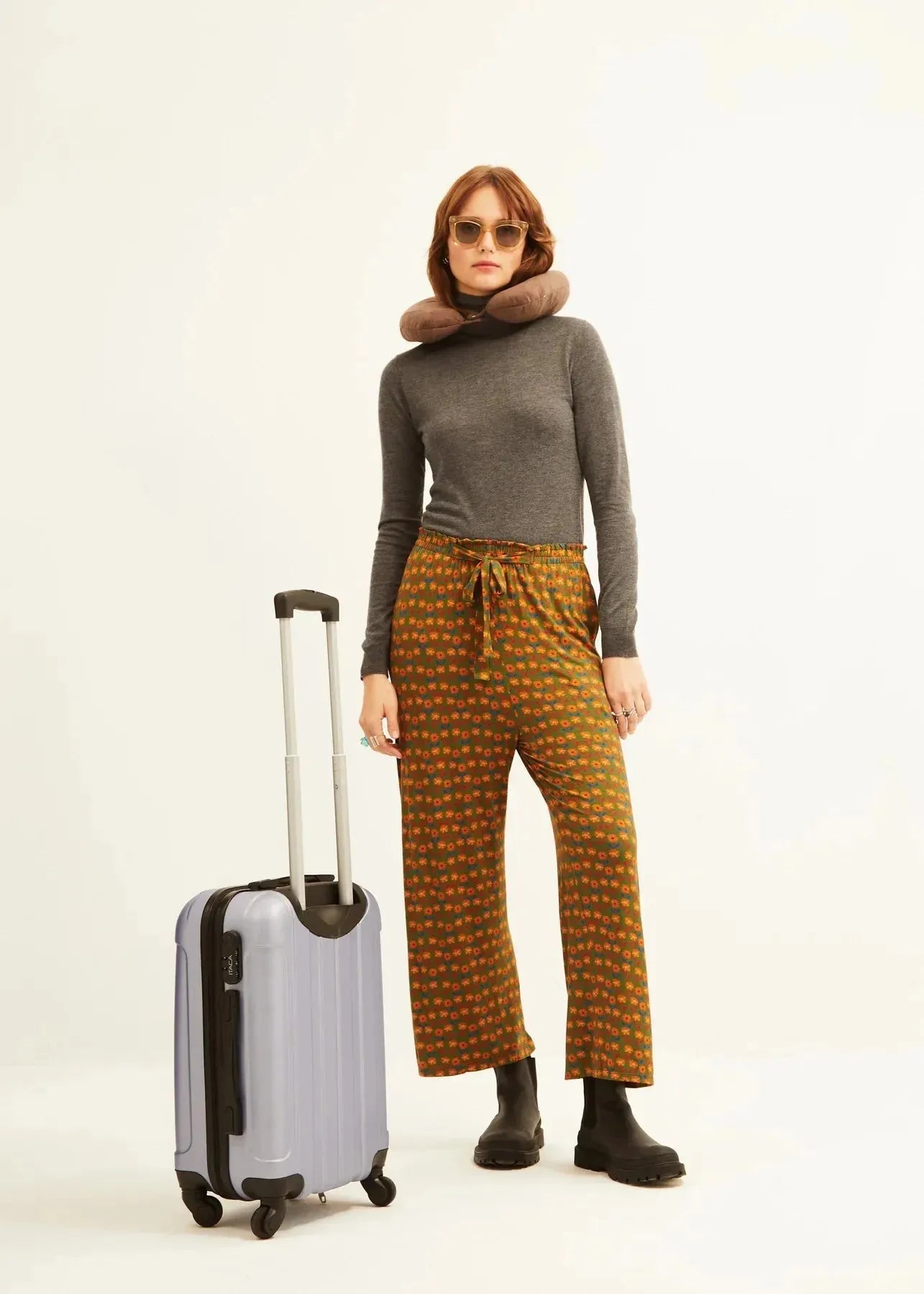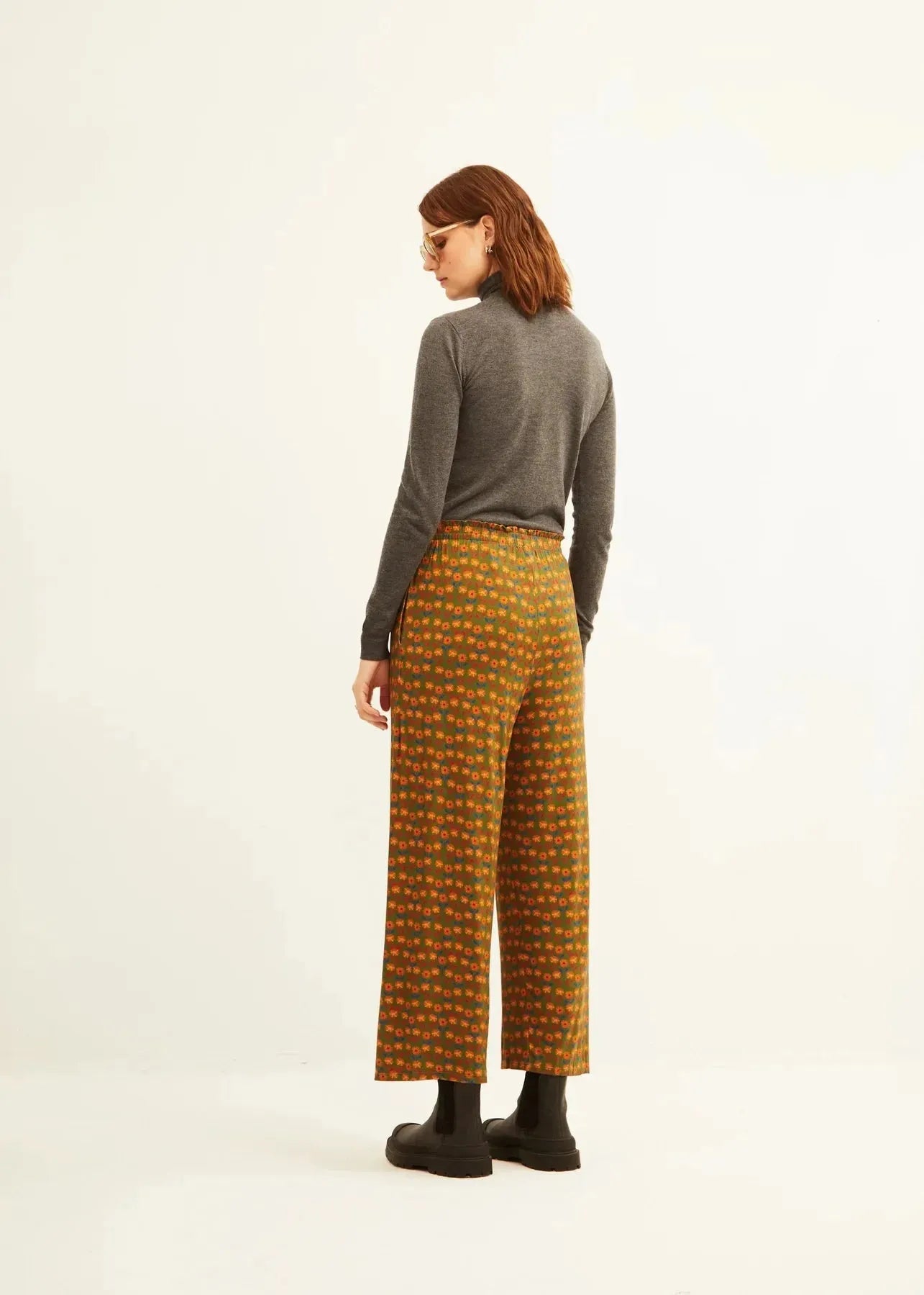 Pantalón en estampado Green Folklore Flowers de 3/4 de tiro alto y pernal ancho. Cintura fina elástica con cordón ajustable del mismo tejido. Composición: Viscosa 95% Elastano 5%.
