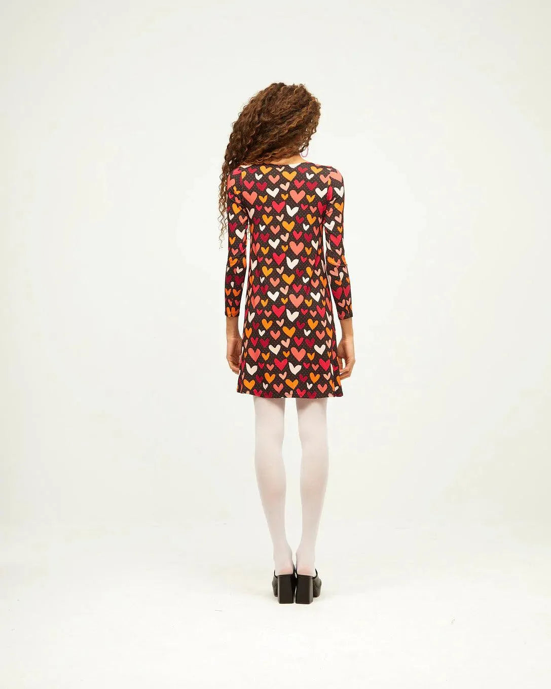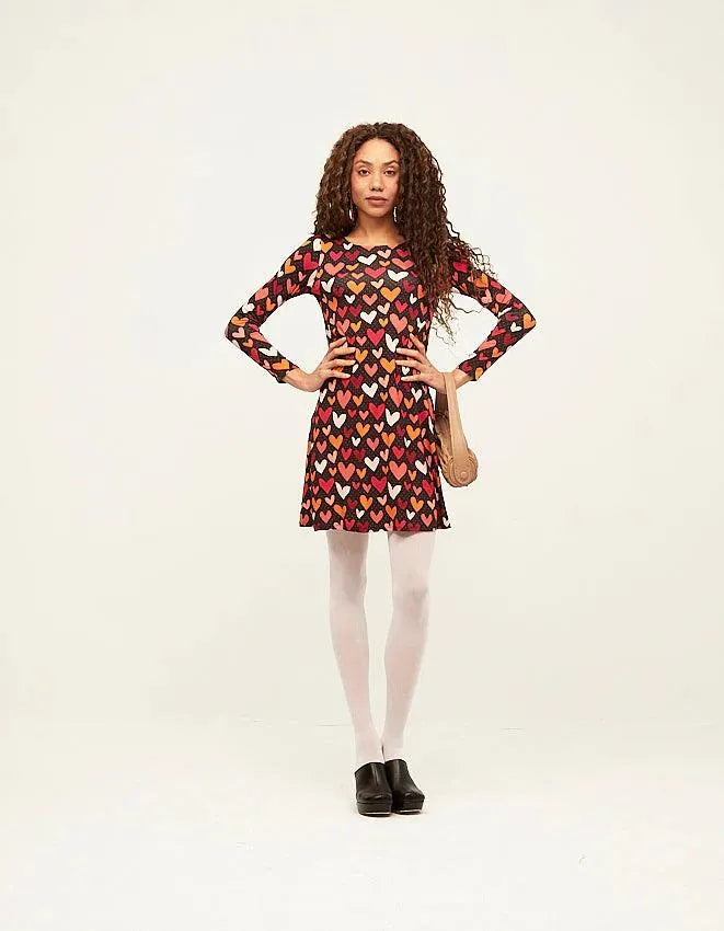 Vestido de manga larga en estampado Retro. Escote pico cruzado, largo por encima rodilla y corte evasé y detalle volante. Composición: Viscosa 95% Elastano 5%.