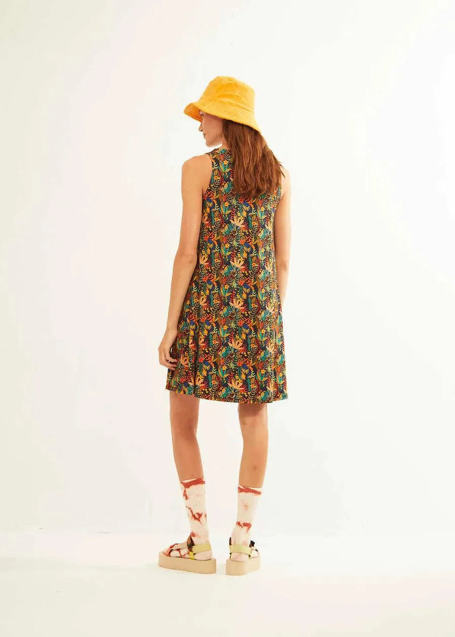 Vestido manga sisa y cuello redondo en estampado Navy WildFlower. Largo por encima rodillas y corte evasé. Composición: Viscosa 95% Elastano 5%.