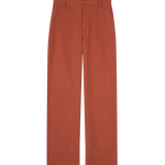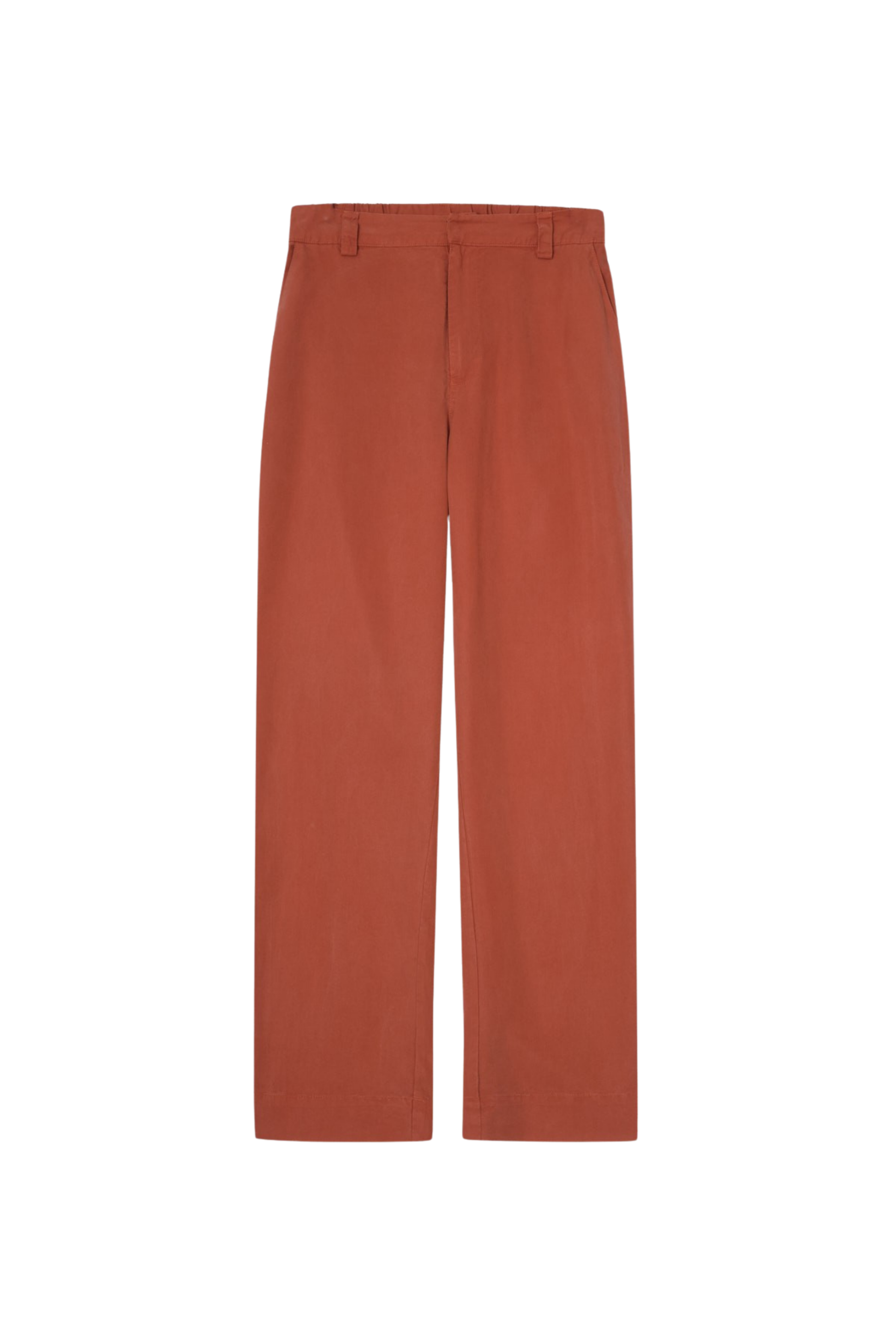 Pantalón regular fit de color rojo. Diseño fluido de Tencel. Tiro medio. Cierre con botón y cremallera. Con trabillas para cinturón. Cinturilla elástica detrás. Dos bolsillos laterales y dos de vivo detrás. Longitud interior de la pierna: 72 cm (talla S).