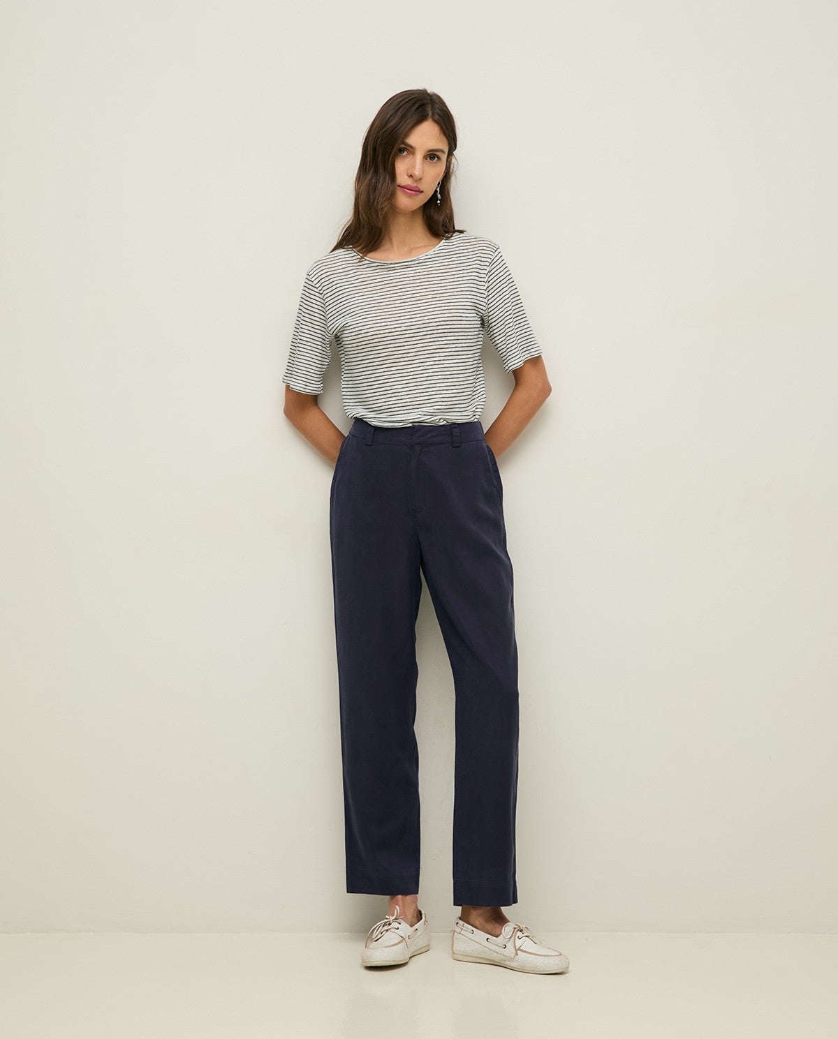 Pantalón regular fit de color azul marino. Diseño fluido de Tencel. Tiro medio. Cierre con botón y cremallera. Con trabillas para cinturón. Cinturilla elástica detrás. Dos bolsillos laterales y dos de vivo detrás. Longitud interior de la pierna: 72 cm (talla S).